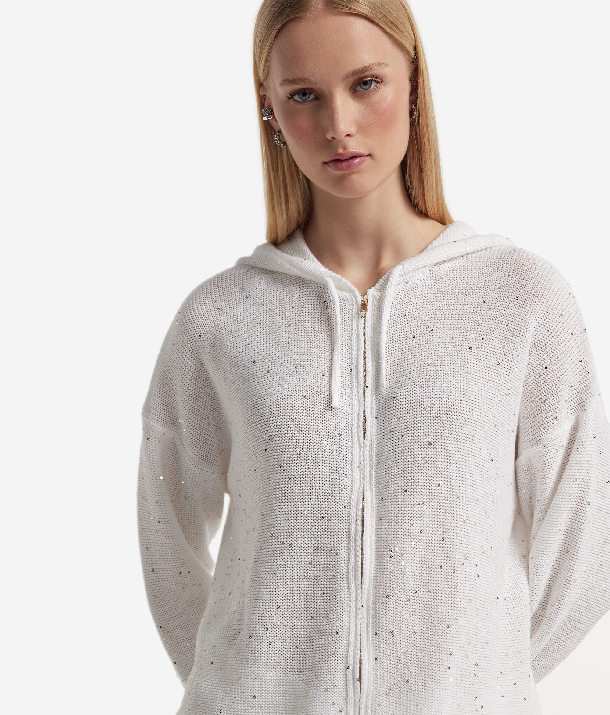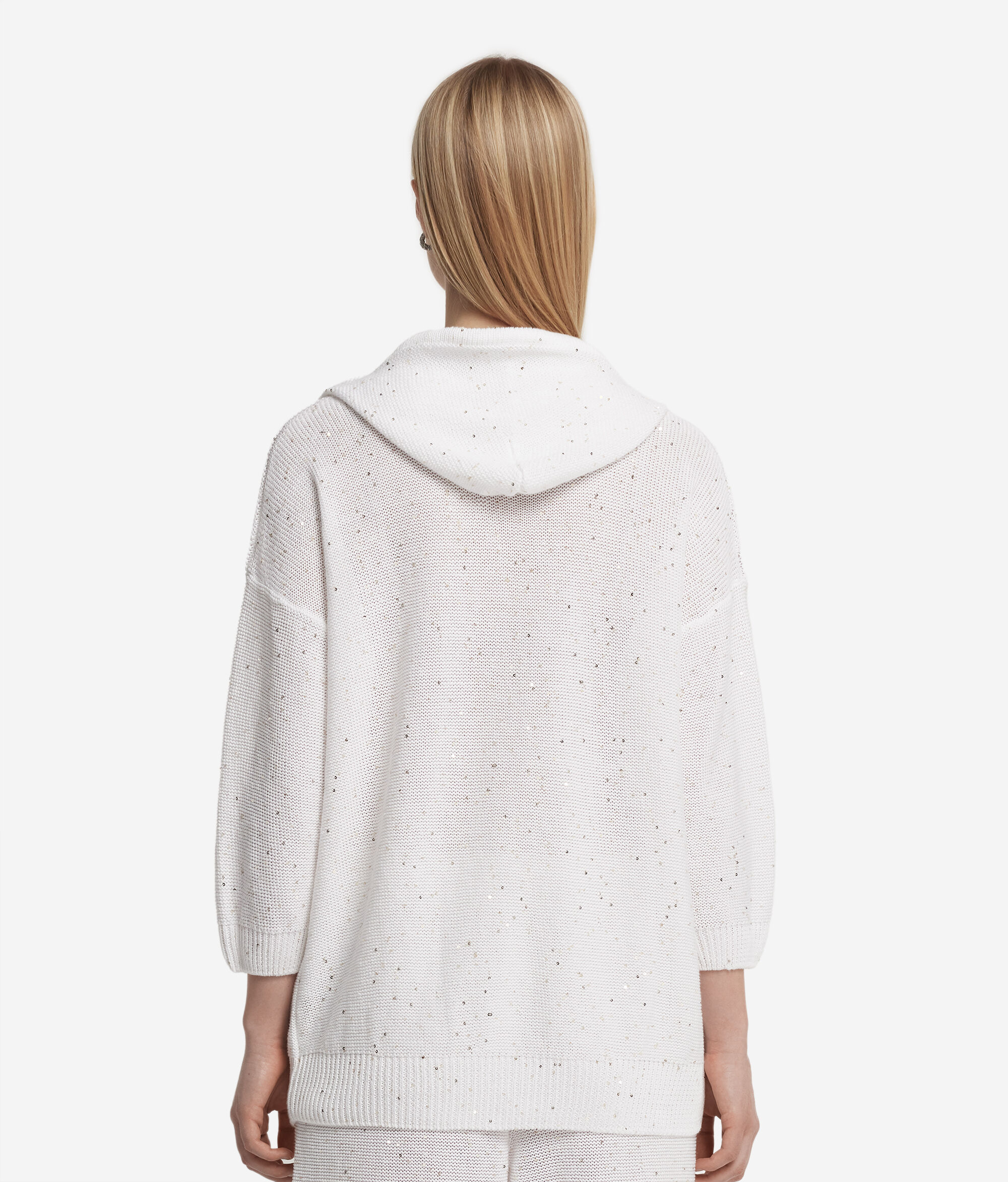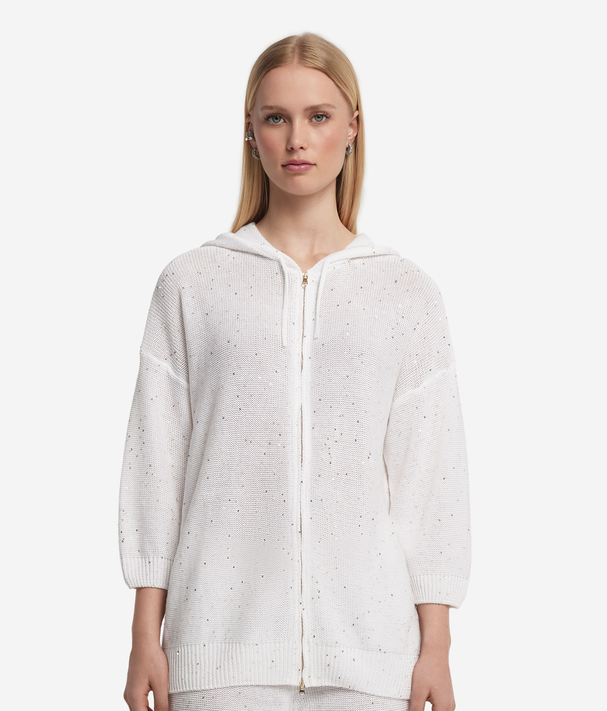Esta sweatshirt de algodão e linho com capuz combina um estilo informal com materiais de alta qualidade. A peça é adornada com um fio de pequenas lantejoulas que lhe dão brilho e elegância. O capuz com cordão e o fecho de correr metálico conferem-lhe um toque desportivo, ao passo que os ombros descaídos e as mangas a 3/4 contribuem para um design descontraído.