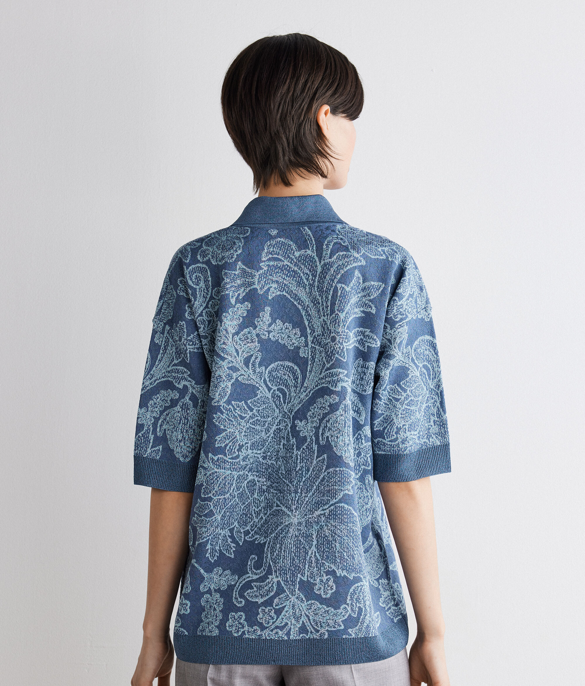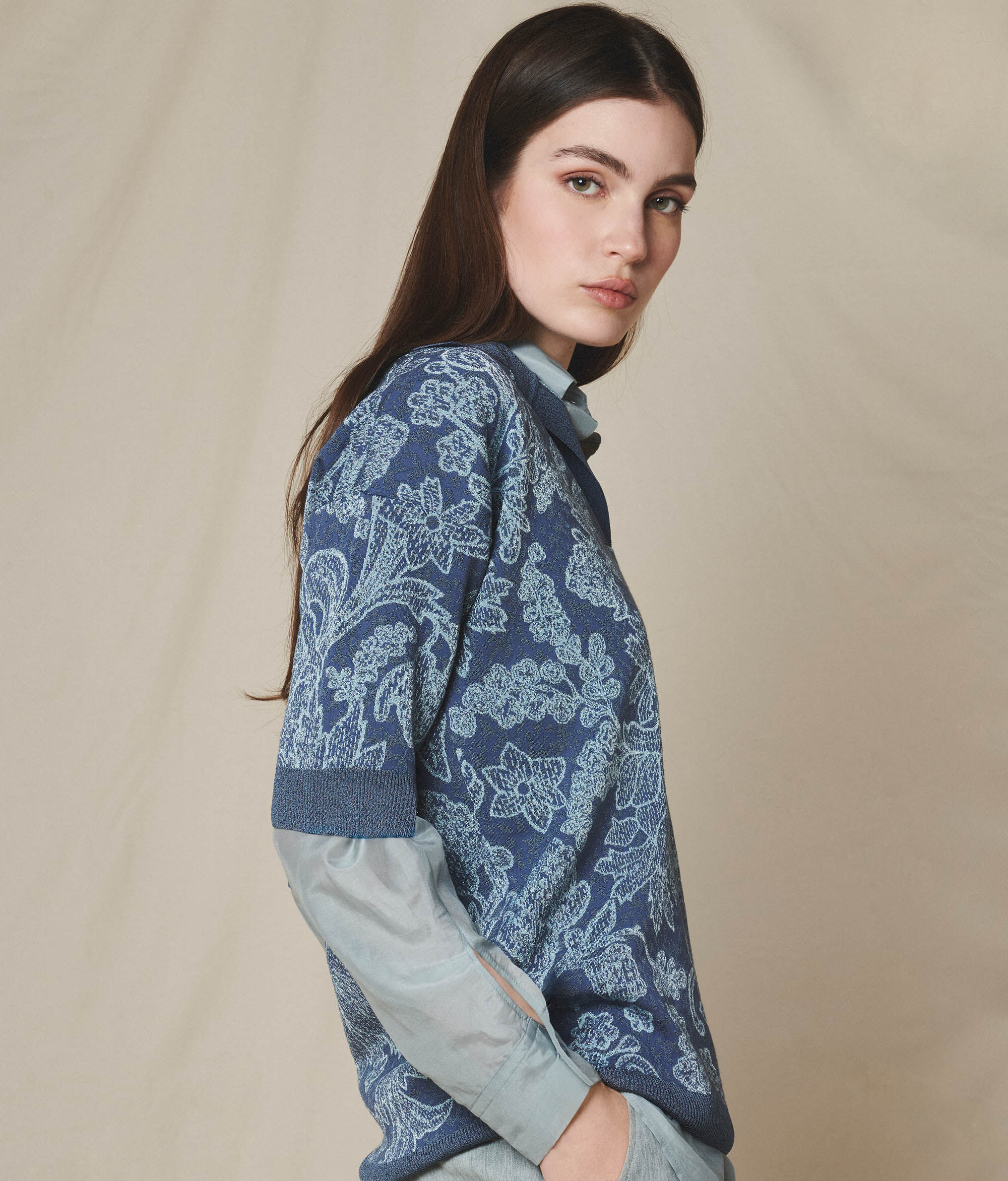 Cardigan din tricot de bumbac și viscoză cu textură jacquard și fibre lamé, înfrumusețat de o broderie rafinată cu motive botanice. Gulerul polo deschis și mânecile scurte conferă o alură relaxată și rafinată, în timp ce tivul reiat din lamé în contrast cromatic adaugă un detaliu de luminozitate. Umerii căzuți și croiala lejeră garantează confort și fluiditate naturală, pentru un stil contemporan și sofisticat.