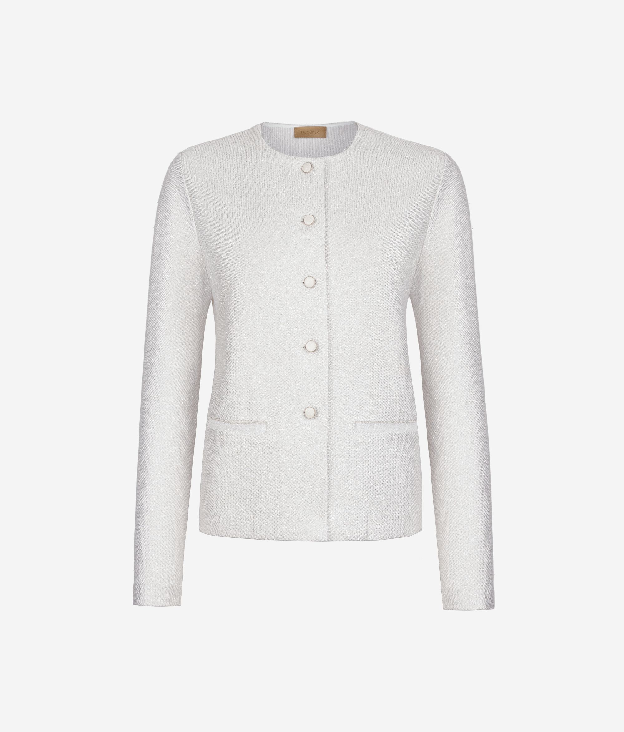 Cotton knit jacket embellished with lamé yarn for a bright and refined texture. The simple crew neck and single-breasted fastening with tonal enamel buttons create a clean and elegant silhouette. Welt pockets keep the profile understated, while the crop length and regular fit create modern, sophisticated proportions.