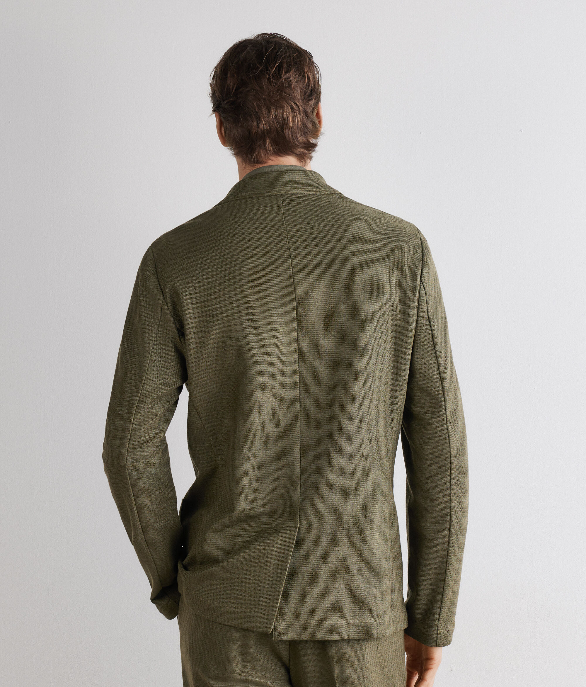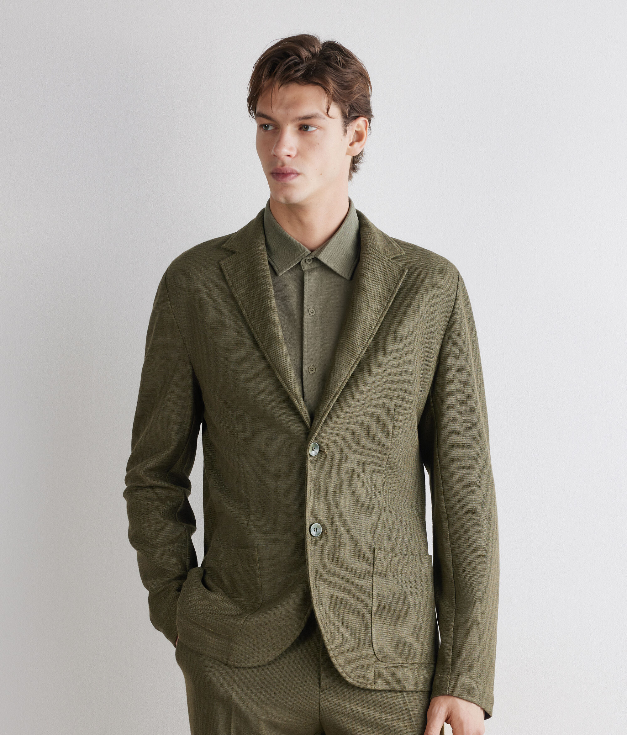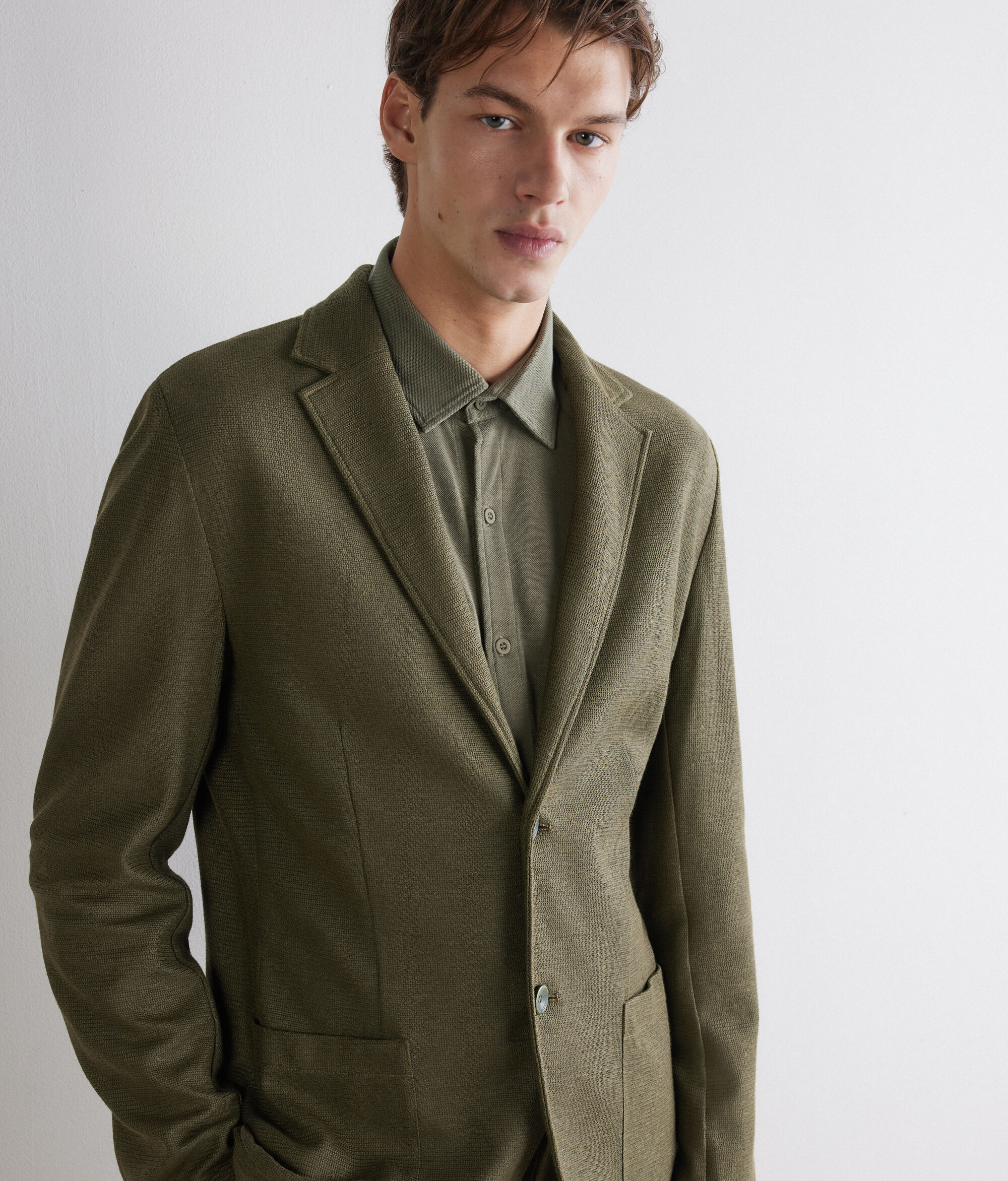 Crafted from premium linen and cotton waffle fabric, this jacket combines a sophisticated texture and contemporary design. The notched lapel and single-breasted two-button closure underline its timeless elegance, while the patch pockets and central vent on the back complete a regular and refined silhouette.