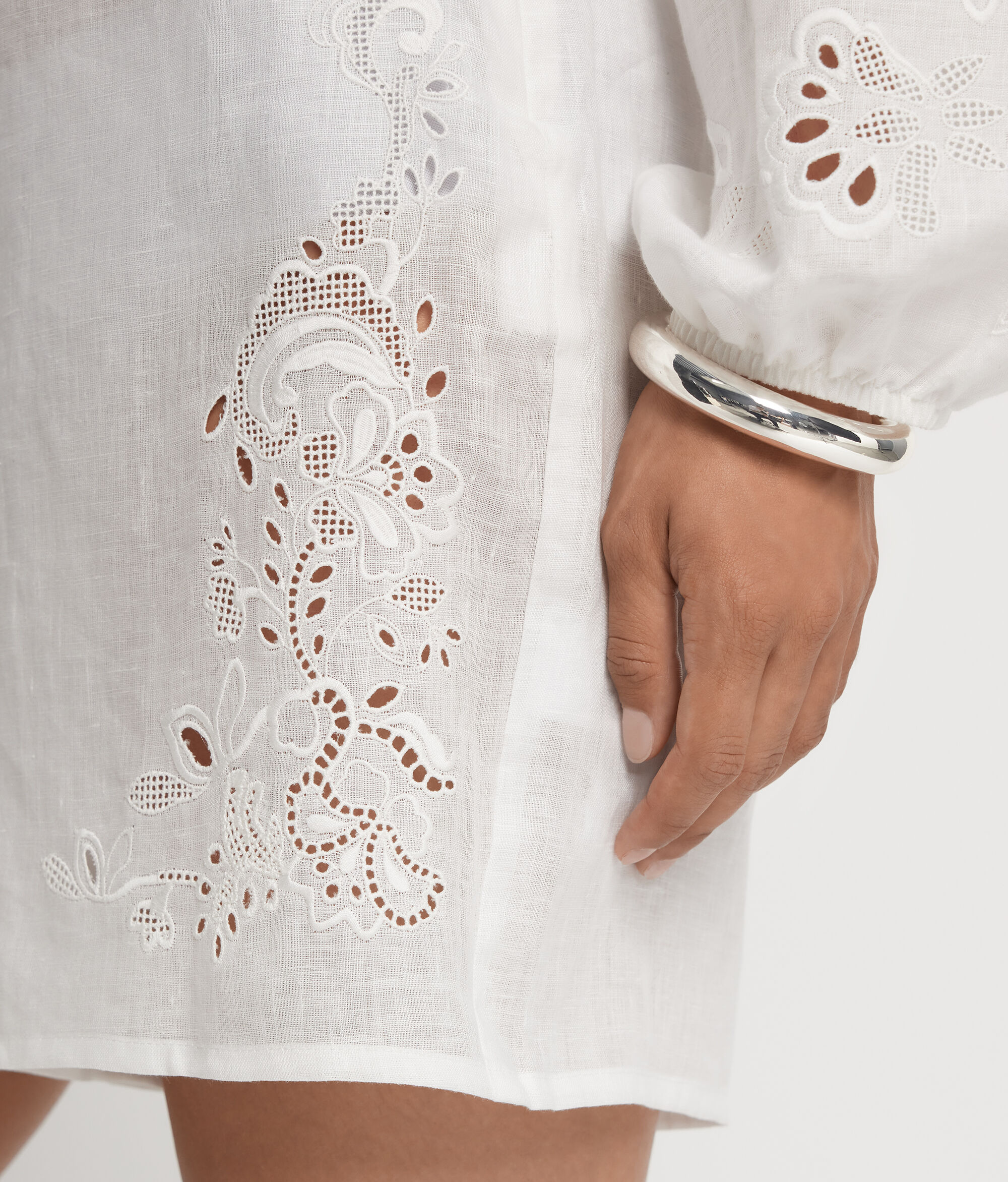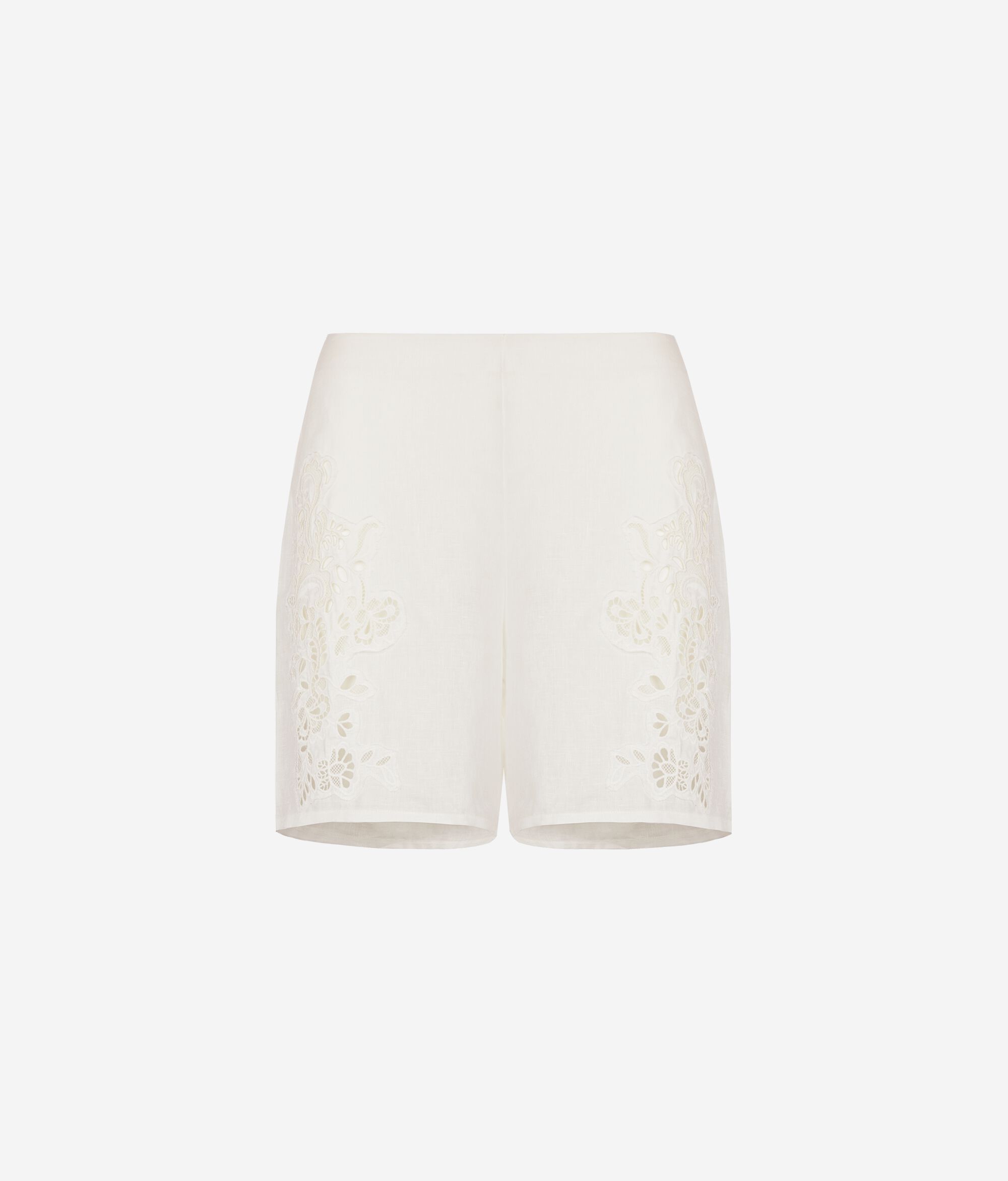 These pure linen trousers are cool and feminine, combining simplicity and grace. The knee-length cut enhances the design’s lightness, while floral embroidery on the front adds a romantic touch. The invisible back zipper maintains clean lines, while the Regular Fit. We recommend sizing up one to two sizes for the best fit provides comfortable movement with natural elegance.