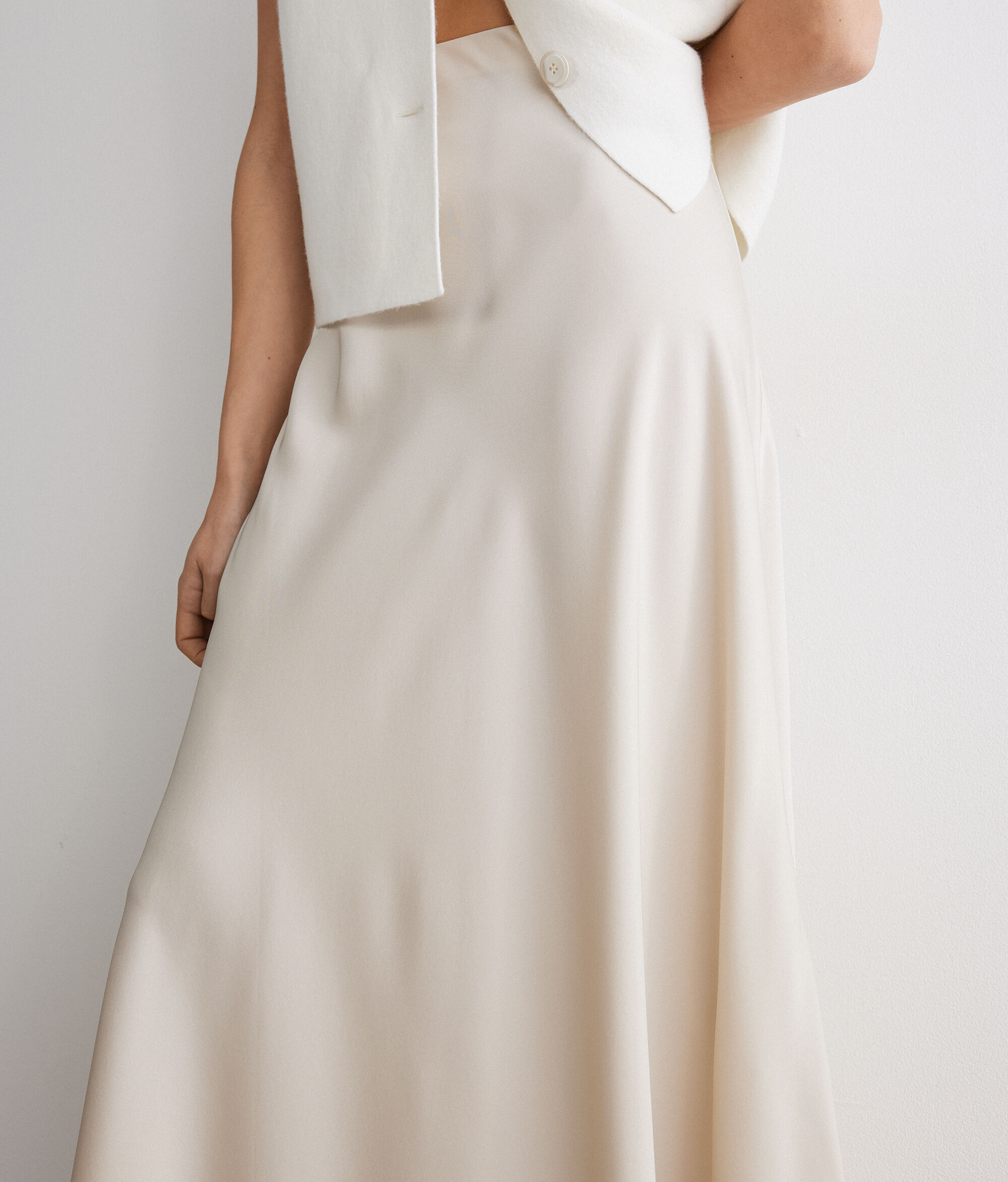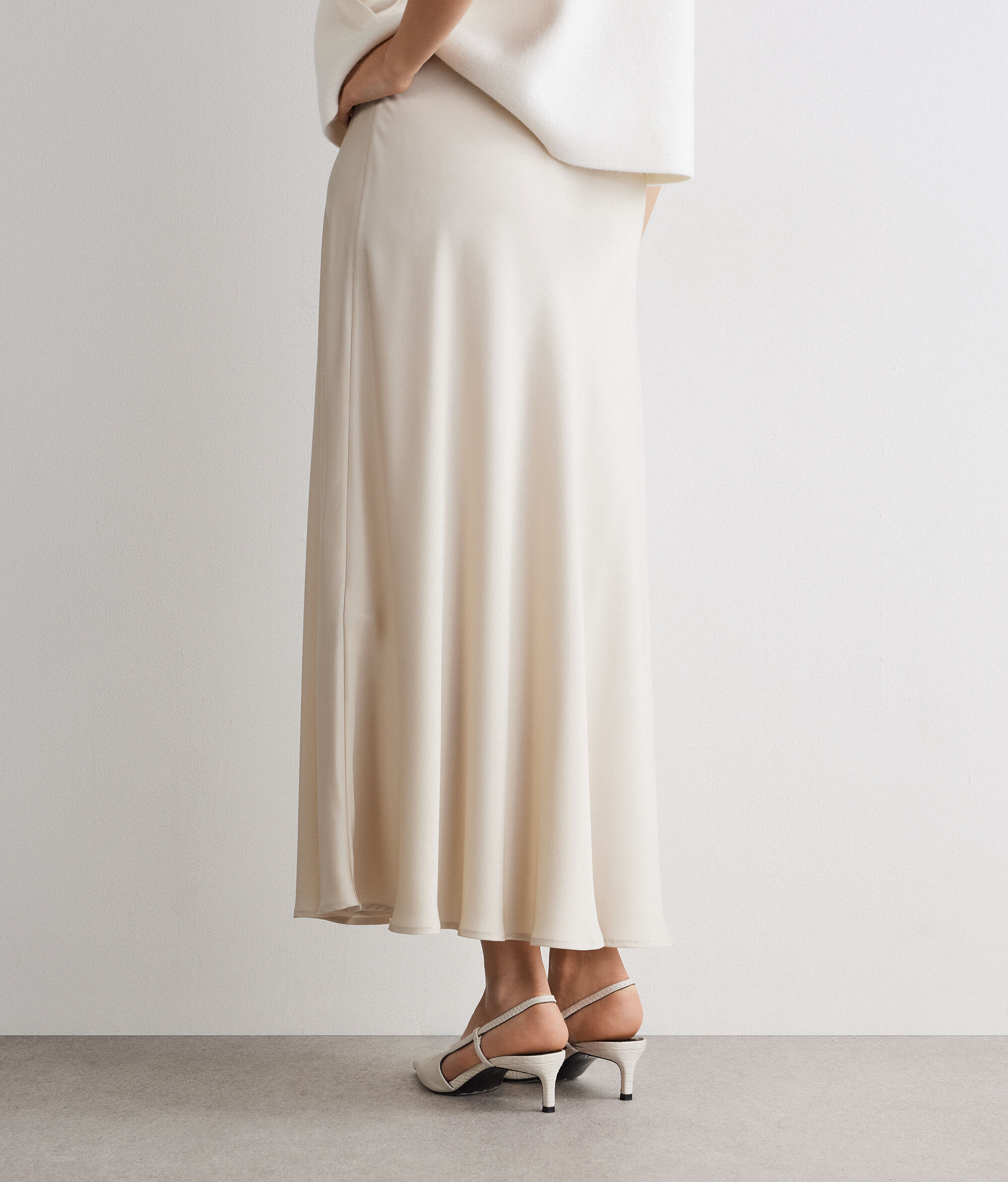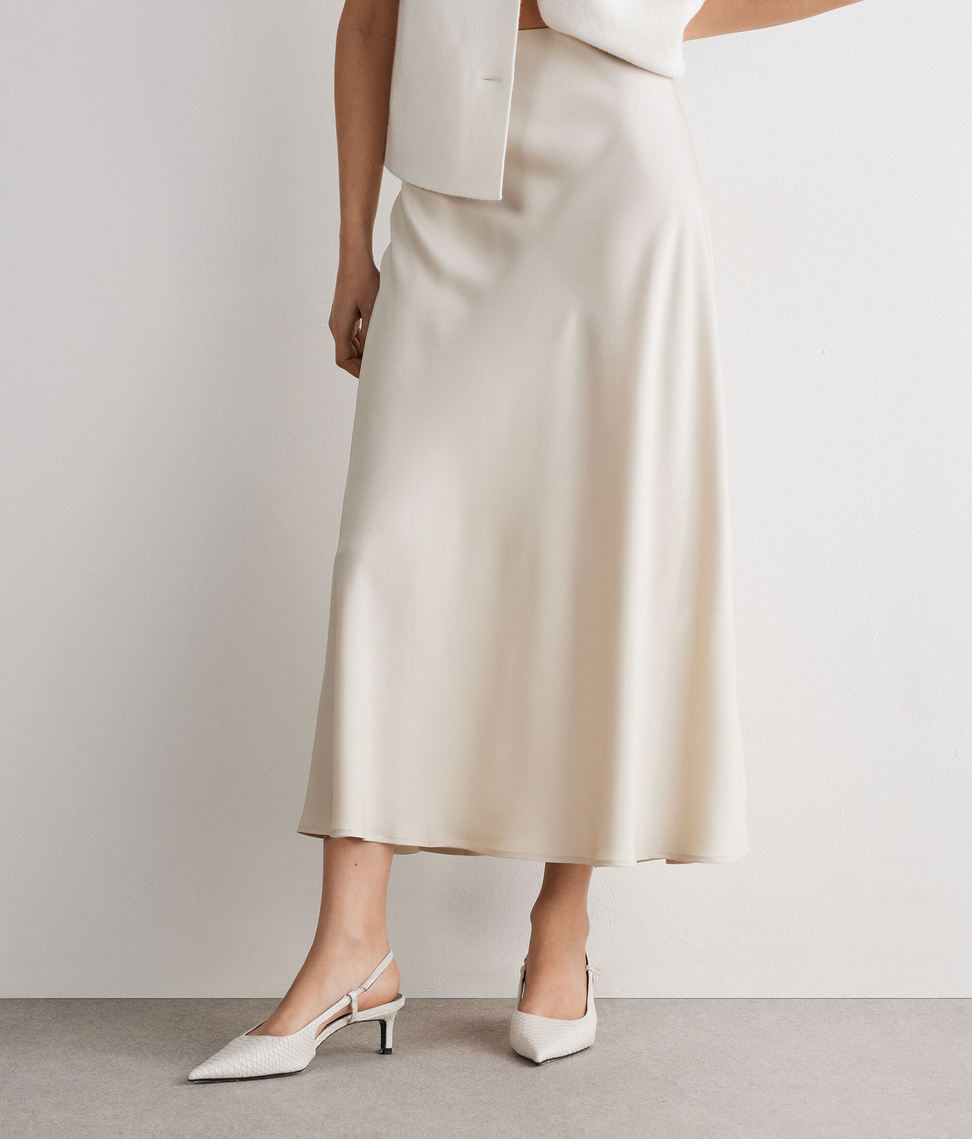 Matte silk satin skirt with flowing and feminine lines, which accompanies movement with natural elegance. The elasticated waist combines comfort and style, while the calf length creates a refined silhouette. A simple and sophisticated garment, perfect from day to evening.
