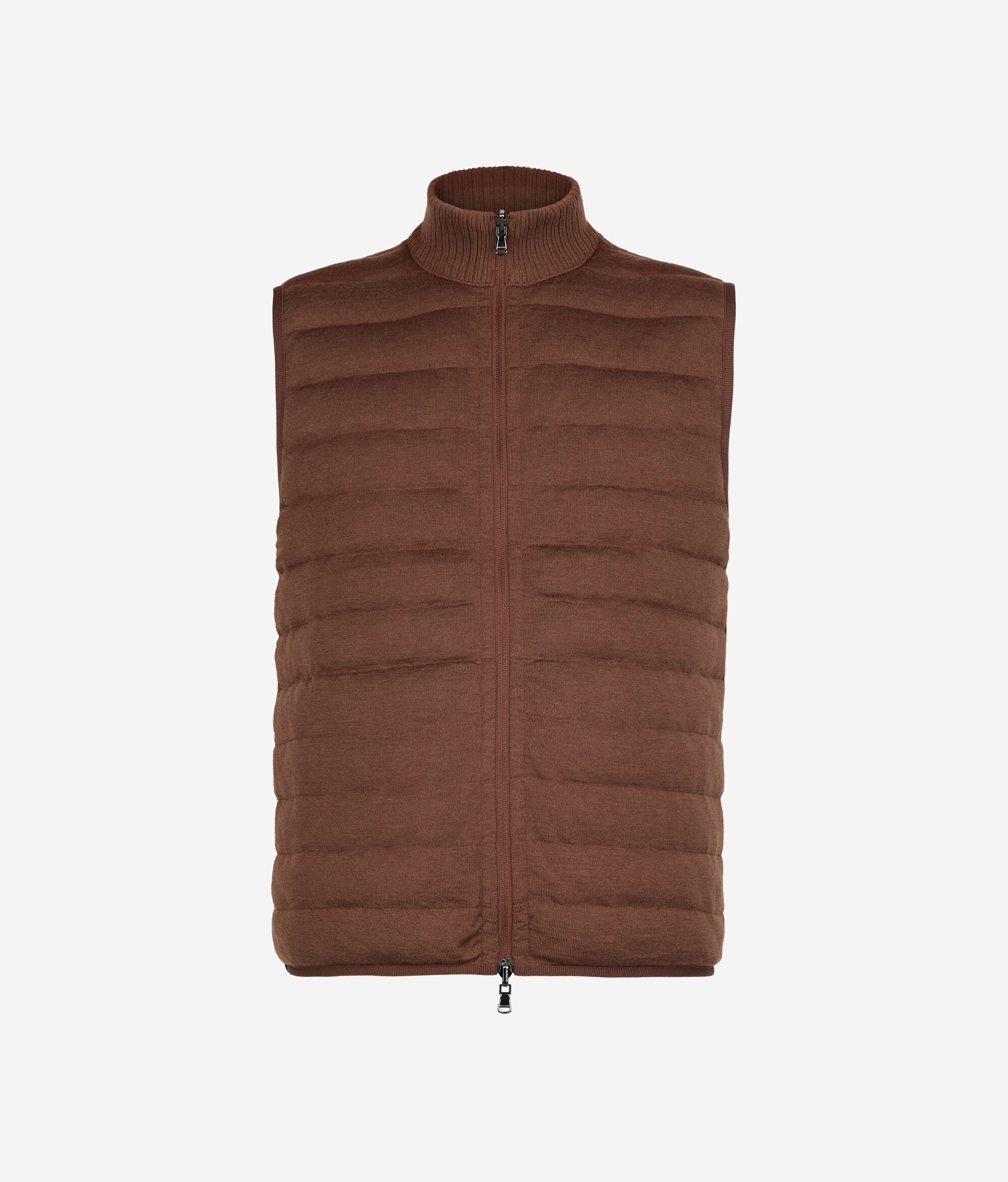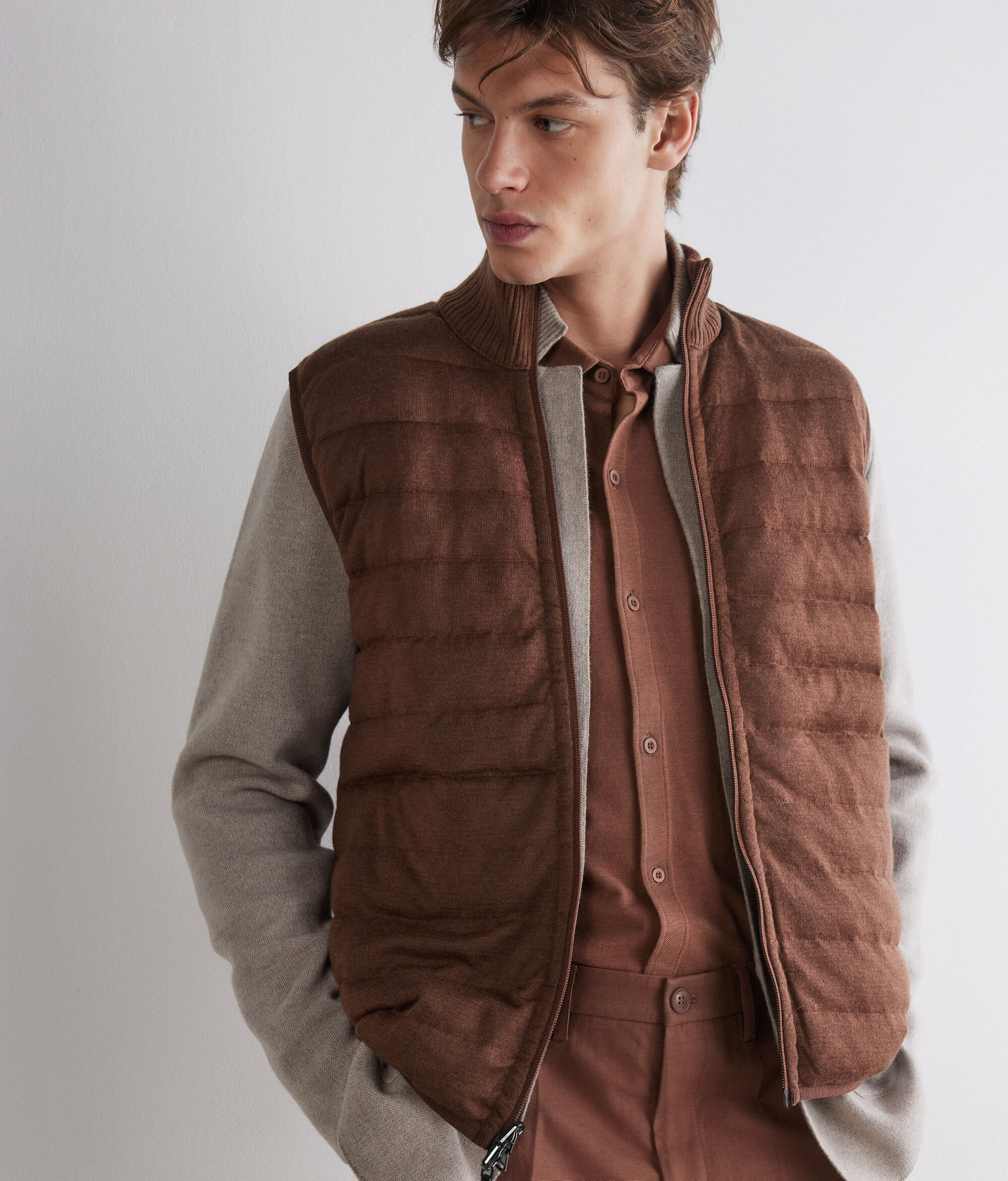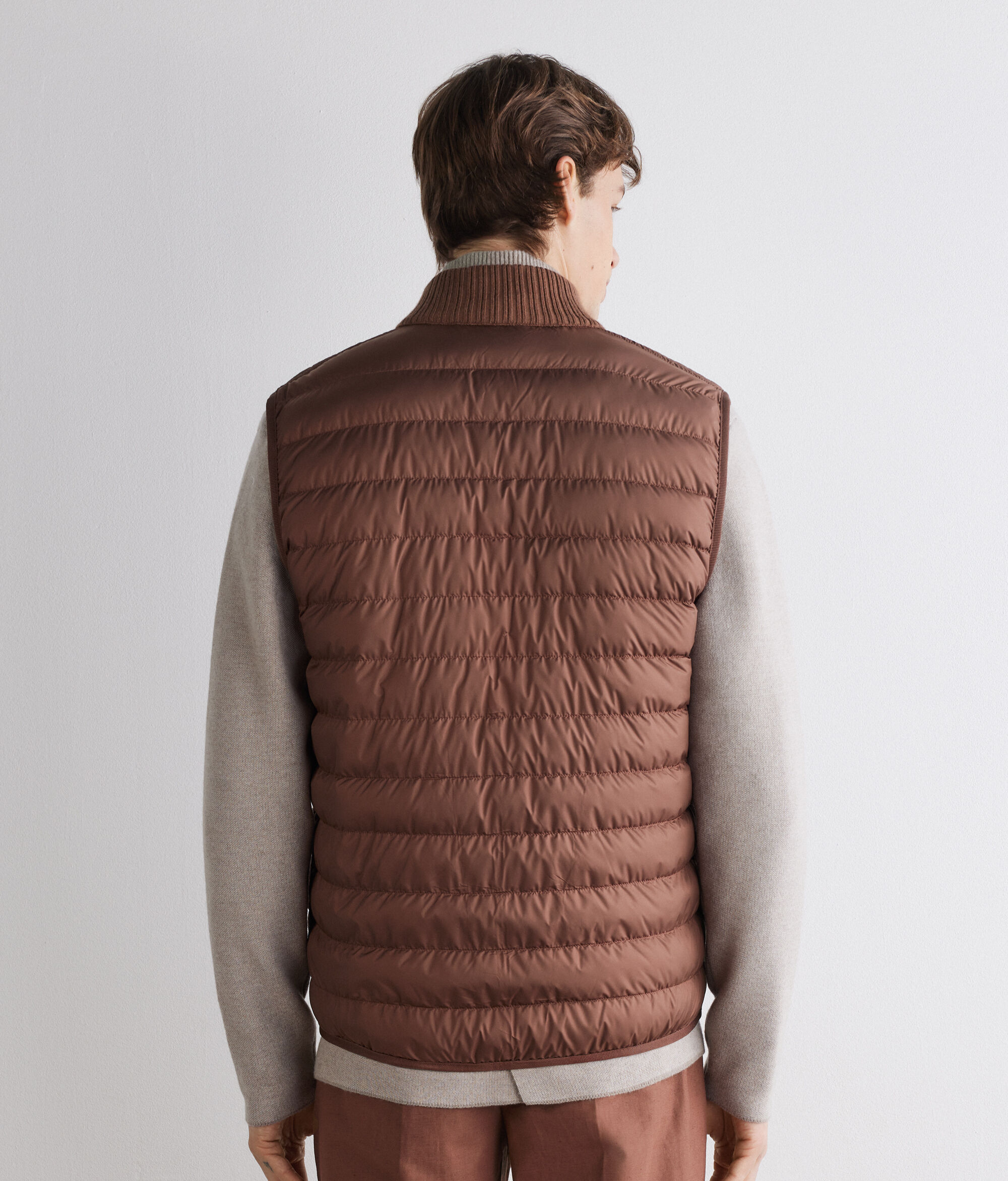 Reversible sleeveless down jacket – the perfect mix of functionality and sophistication. With one side in matte technical fabric and the other in woven Ultrafine Cashmere: a sophisticated and contemporary contrast of yarns. The high cashmere knit collar, double-slider zip and invisible pockets define practical and elegant details, while elasticated waistband finishes and a slim fit complete a versatile garment with a refined design.
