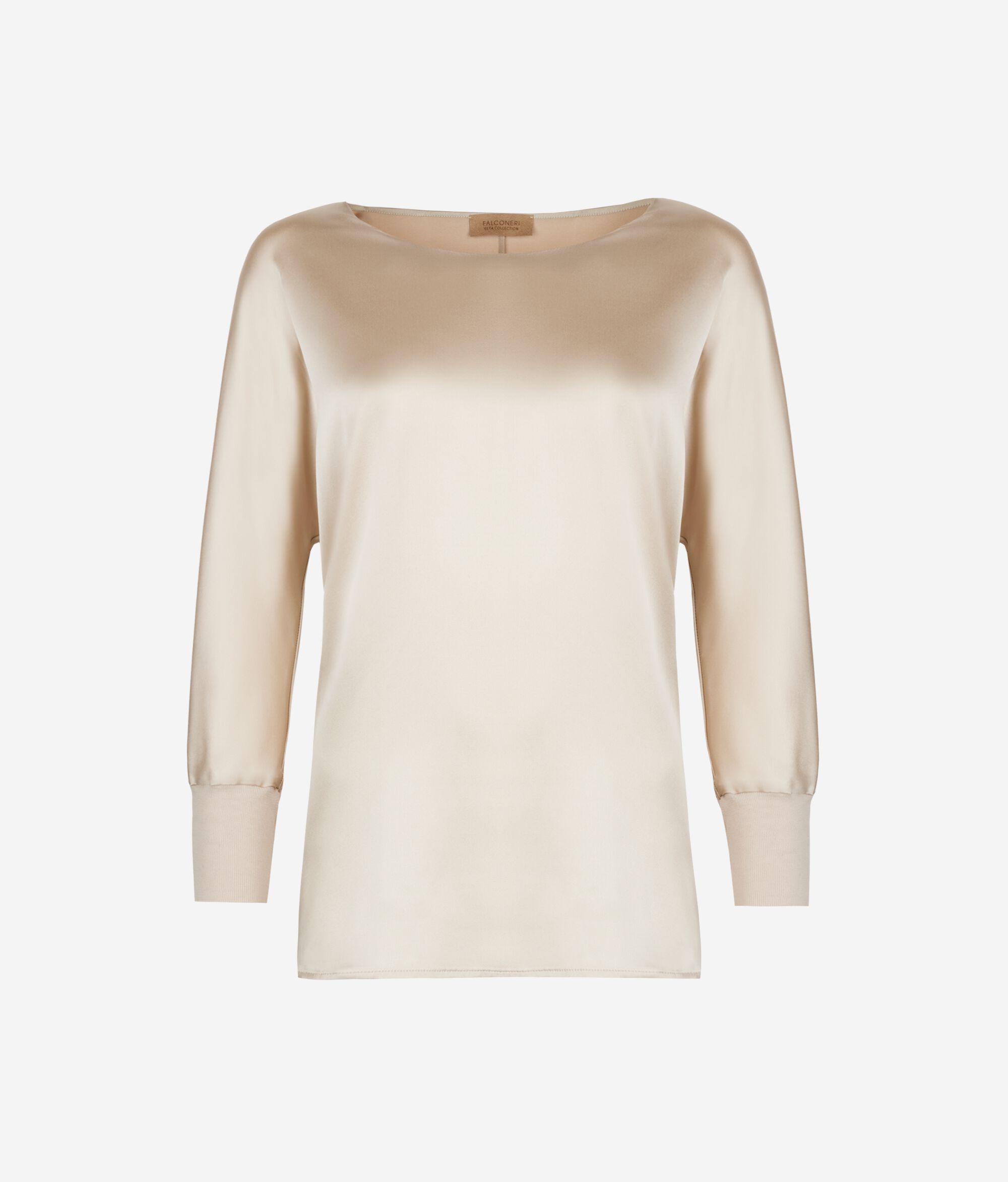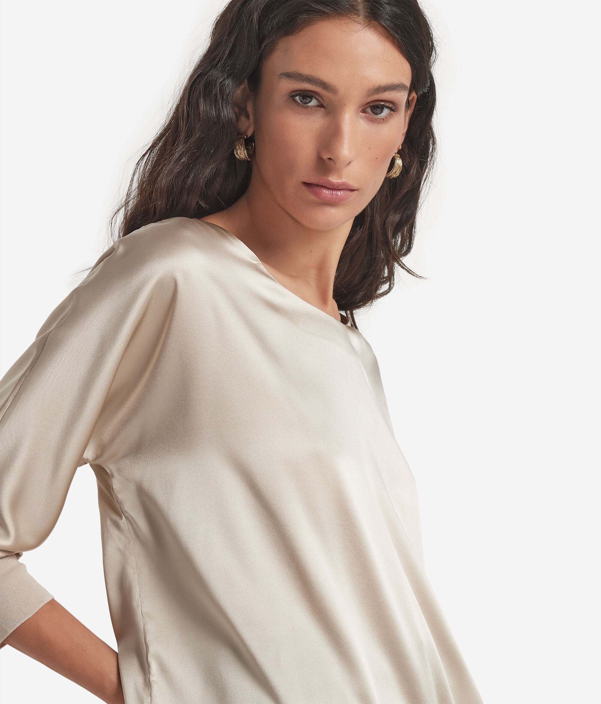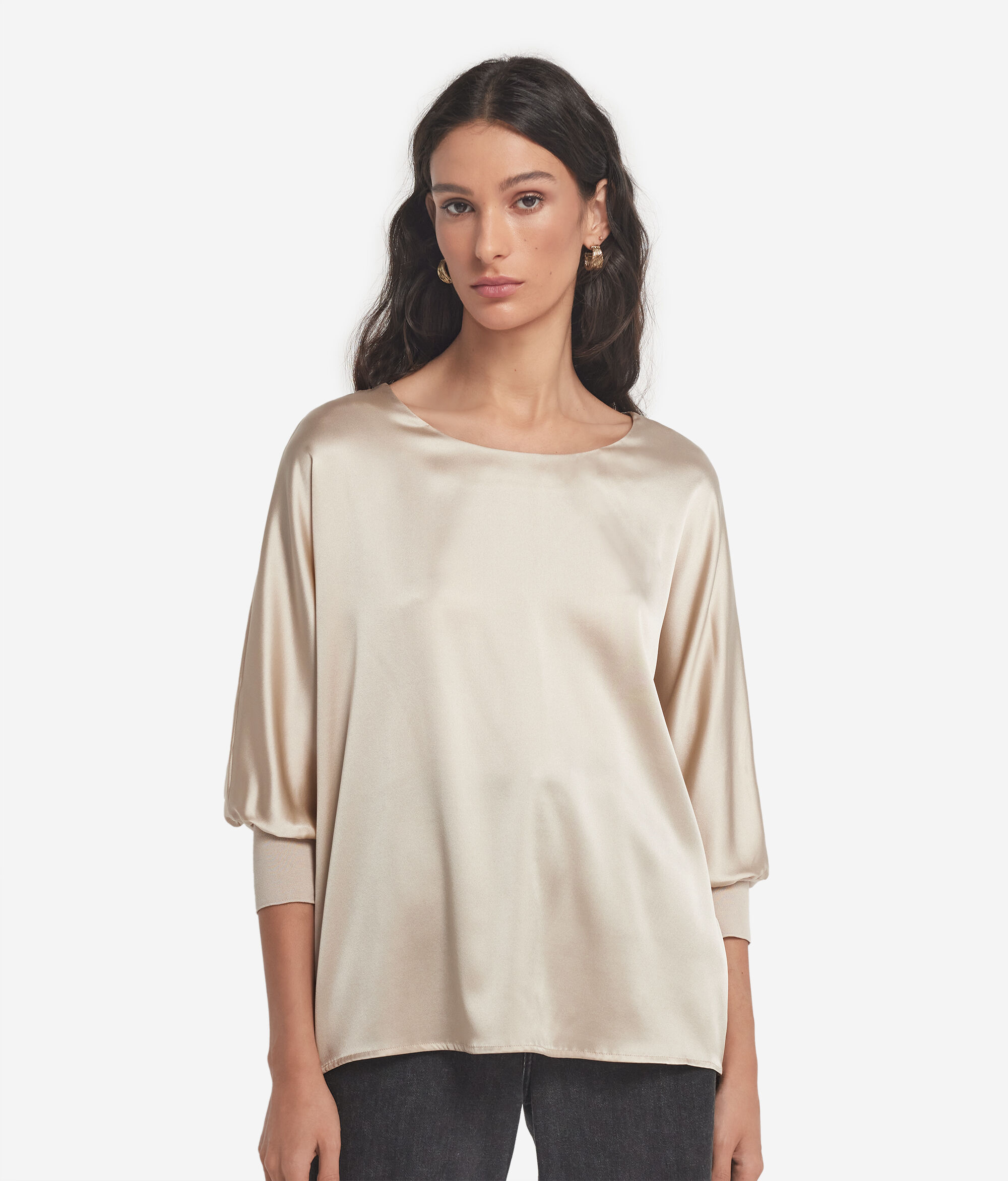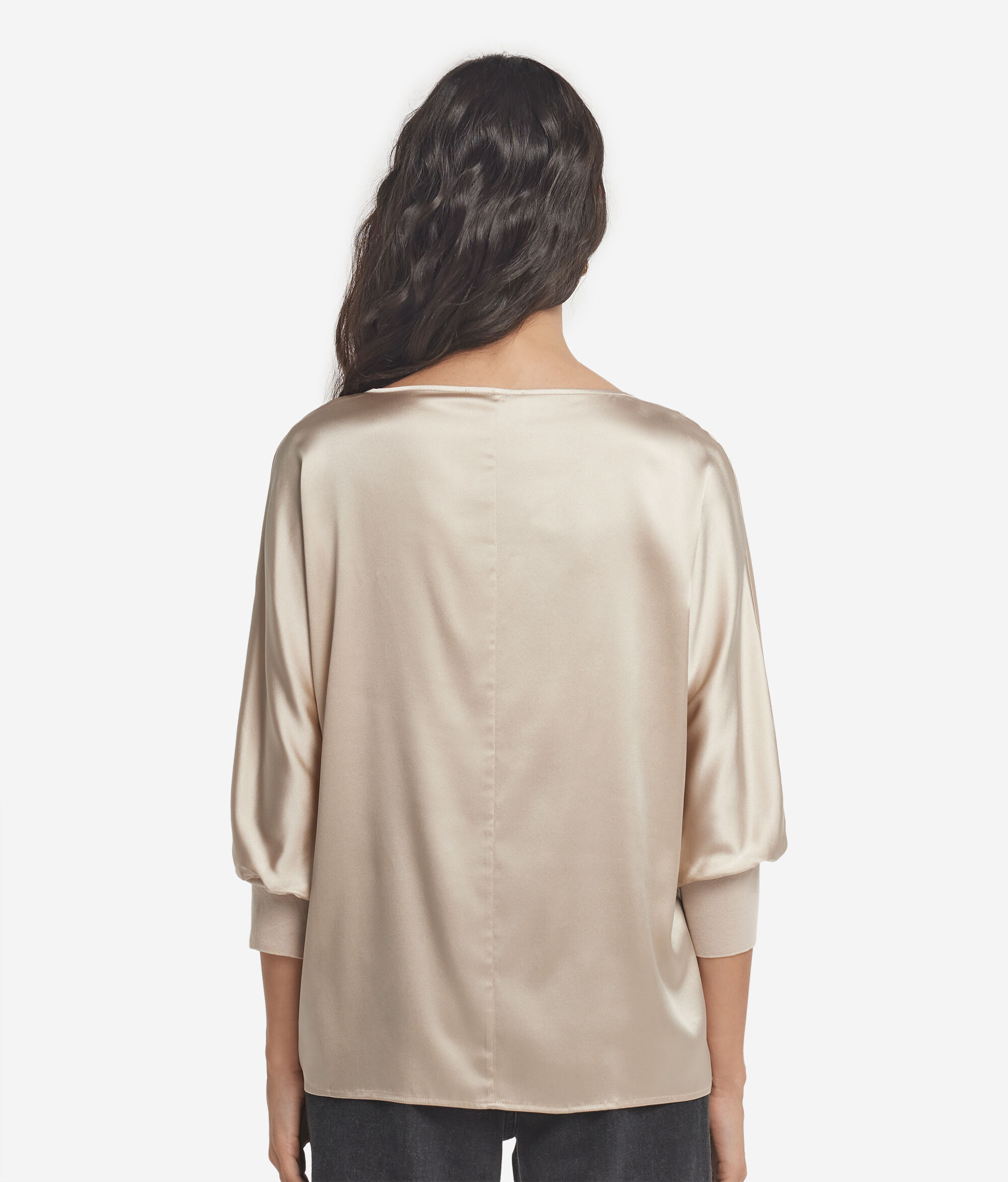 This round-neck silk satin jumper stands out for its refined and elegant style. The essential design is embellished with sophisticated details, such as the jersey cuffs and kimono sleeves, which add fluidity and character. The relaxed fit adds a touch of modernity, enhancing the soft and feminine shape.