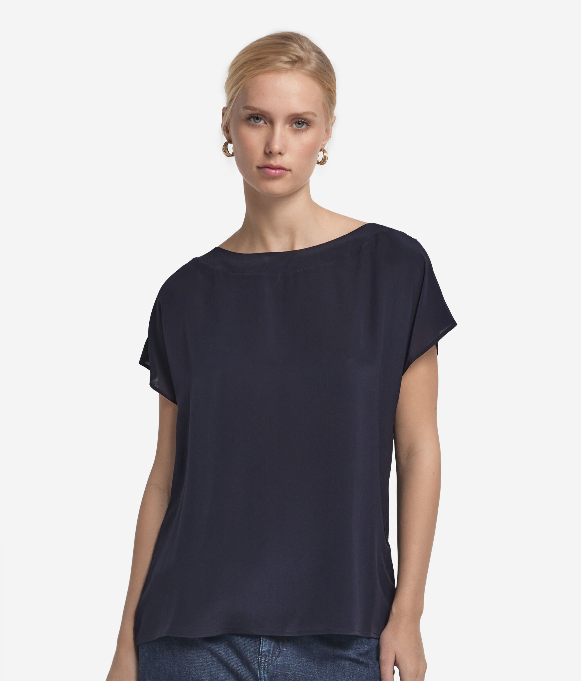 The Falconeri collection is easily recognisable for its balance between form and volume, which is always perfectly paired with natural materials. The silk has been beautifully combined with the gentle shape of this boat-neck T-shirt with kimono sleeves, featuring silk crêpe de chine on the front and modal on the rear of the garment. A versatile, refined garment for the female wardrobe. Perfect for adding a touch of elegance to your everyday look.