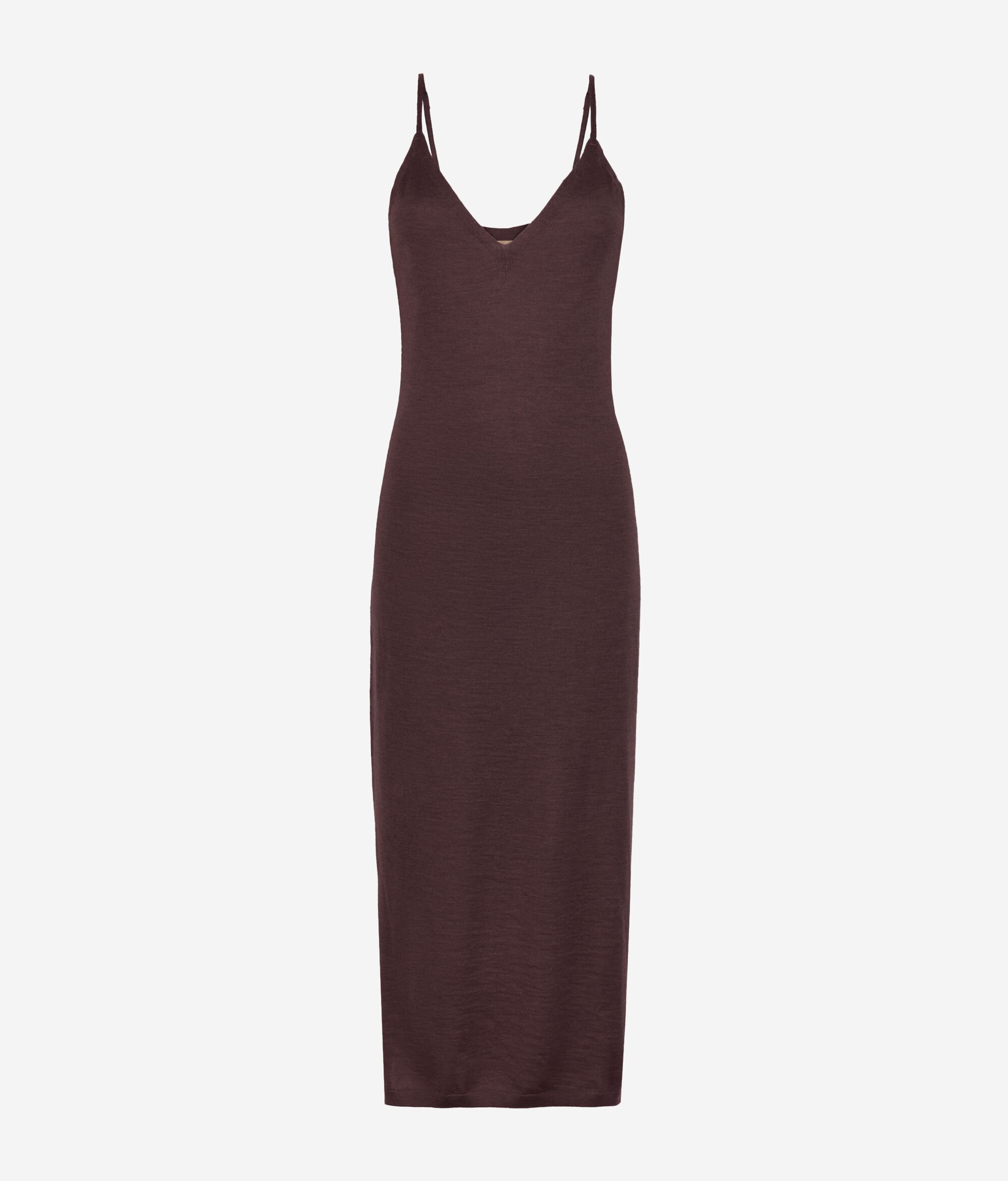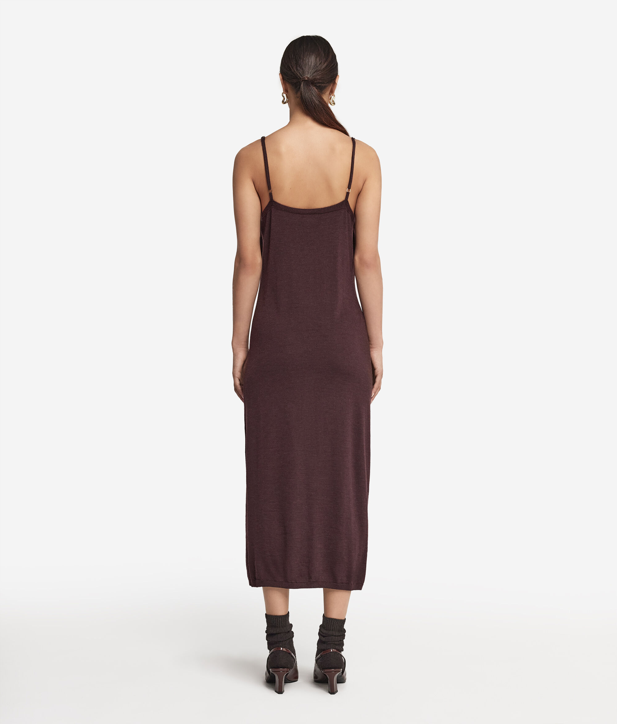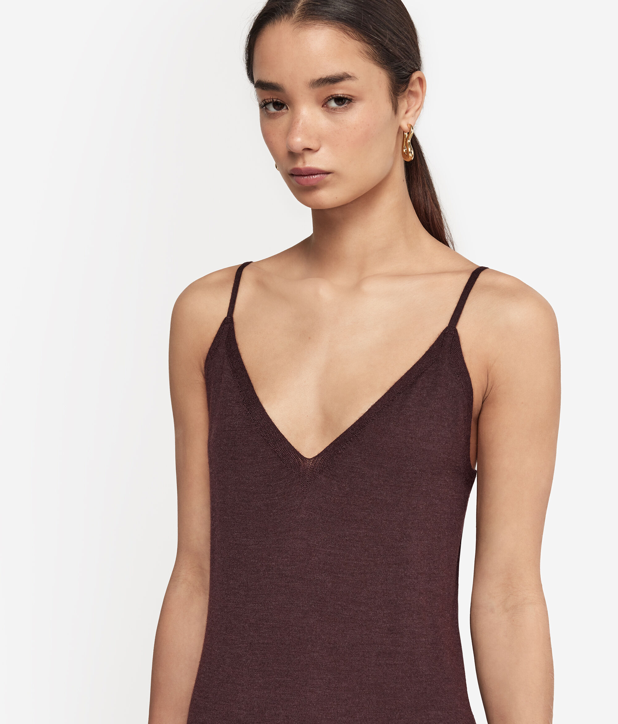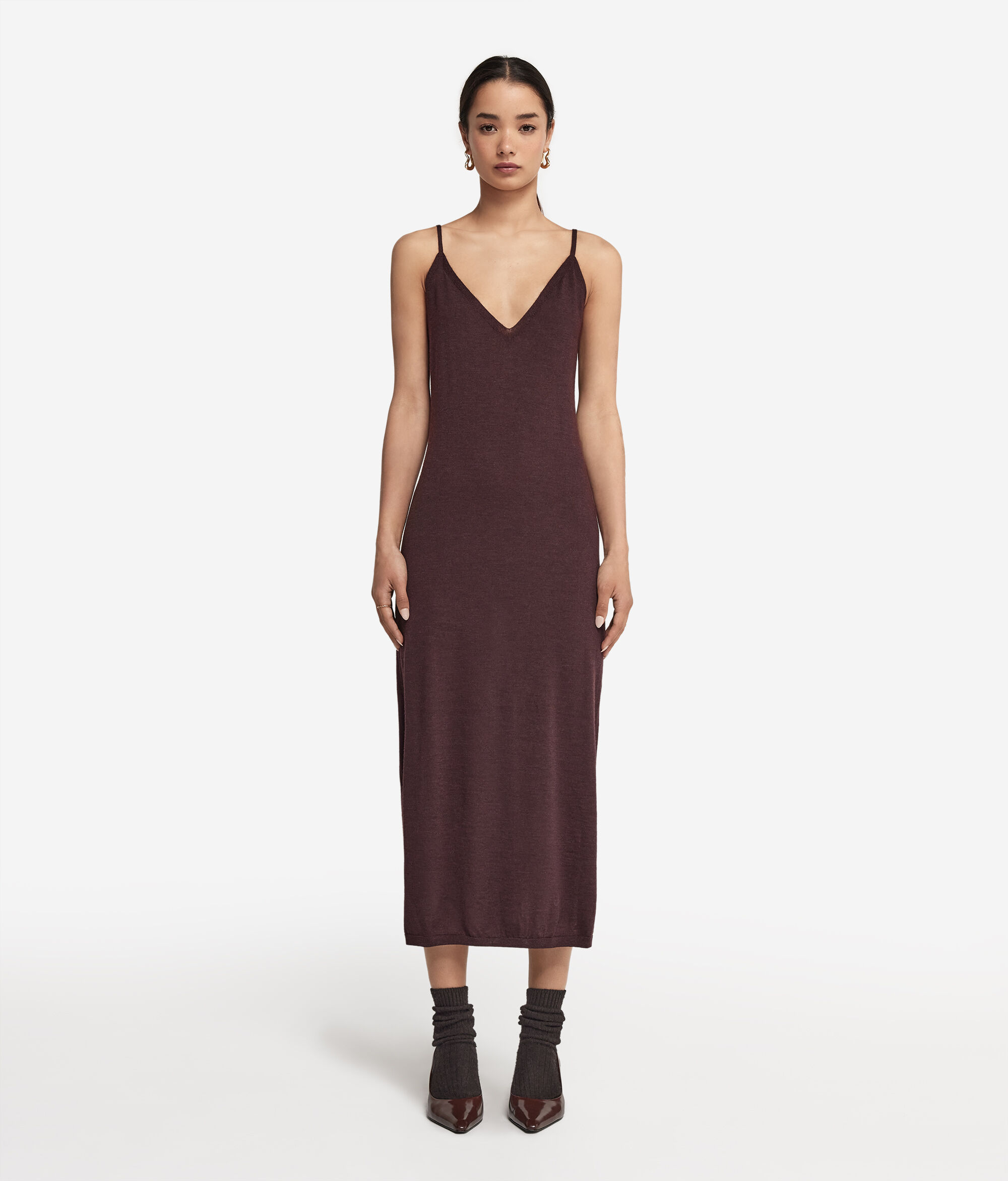 This refined petticoat dress made from Ultrafine Cashmere features an elegant V-neck and a below-the-knee length. The style marked by clean and simple lines exalts the silhouette, while the side slits add movement and femininity to the figure. The adjustable spaghetti straps and details embellished by a ribbed finish give a touch of texture and definition to the minimalist and contemporary design.