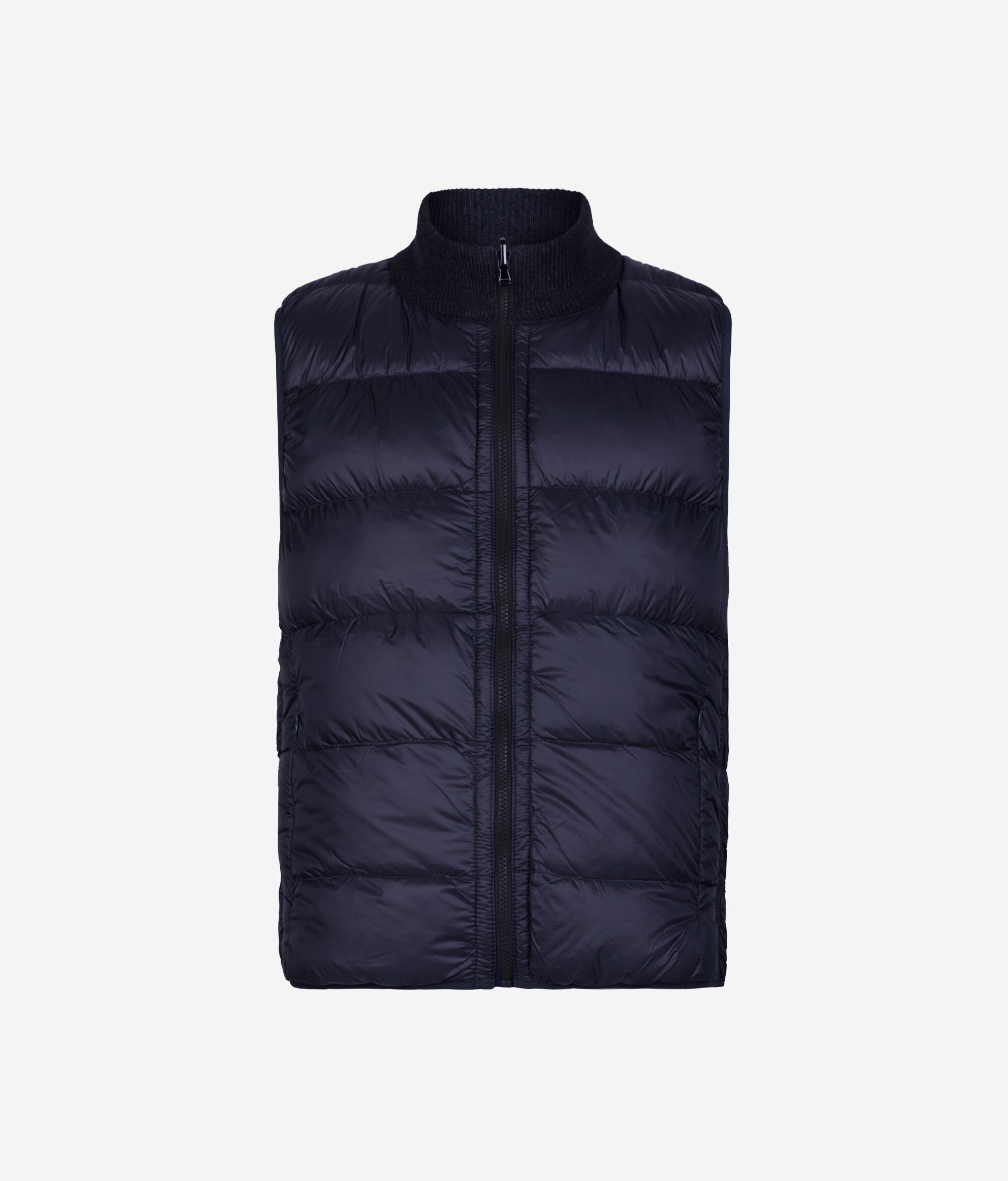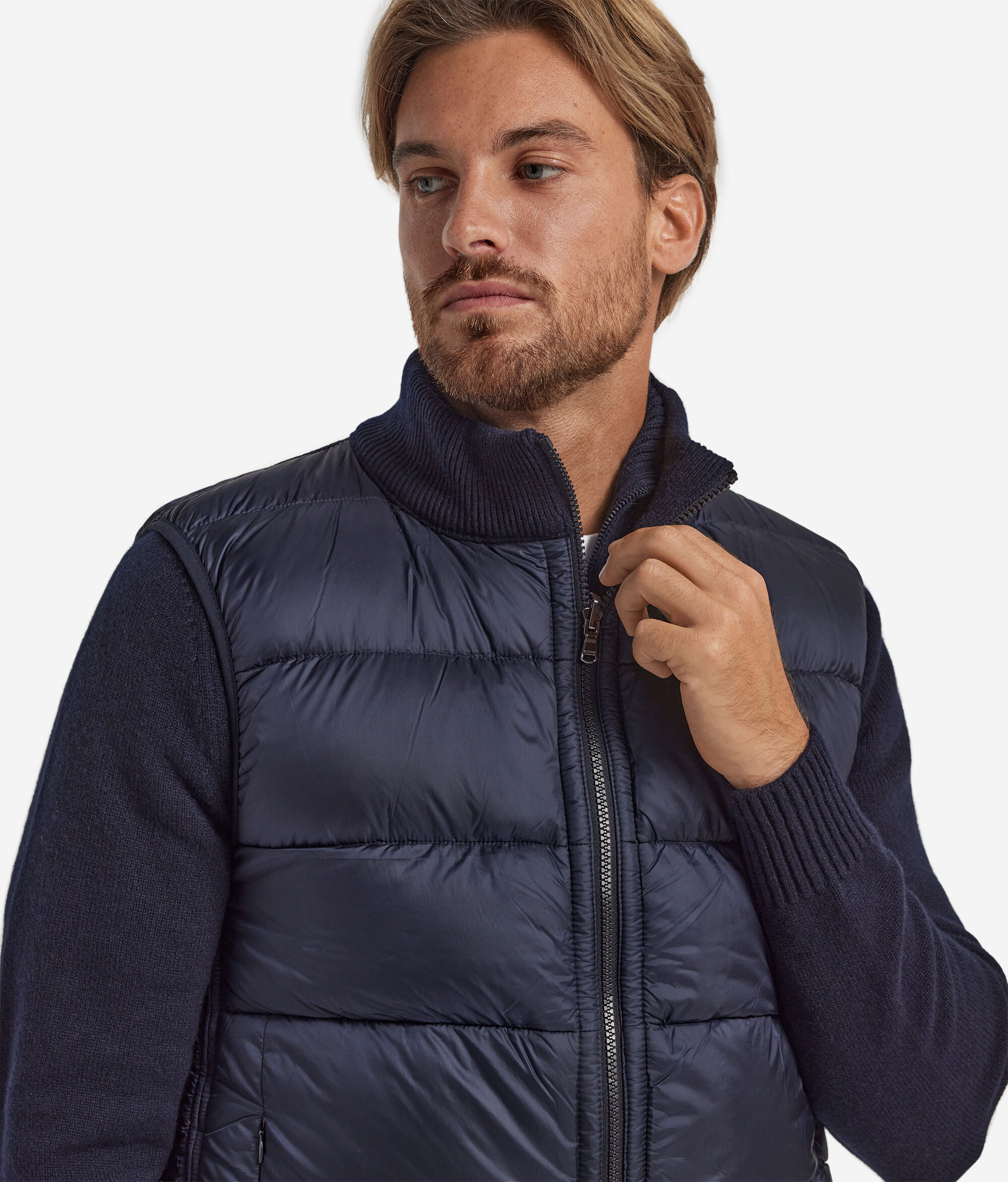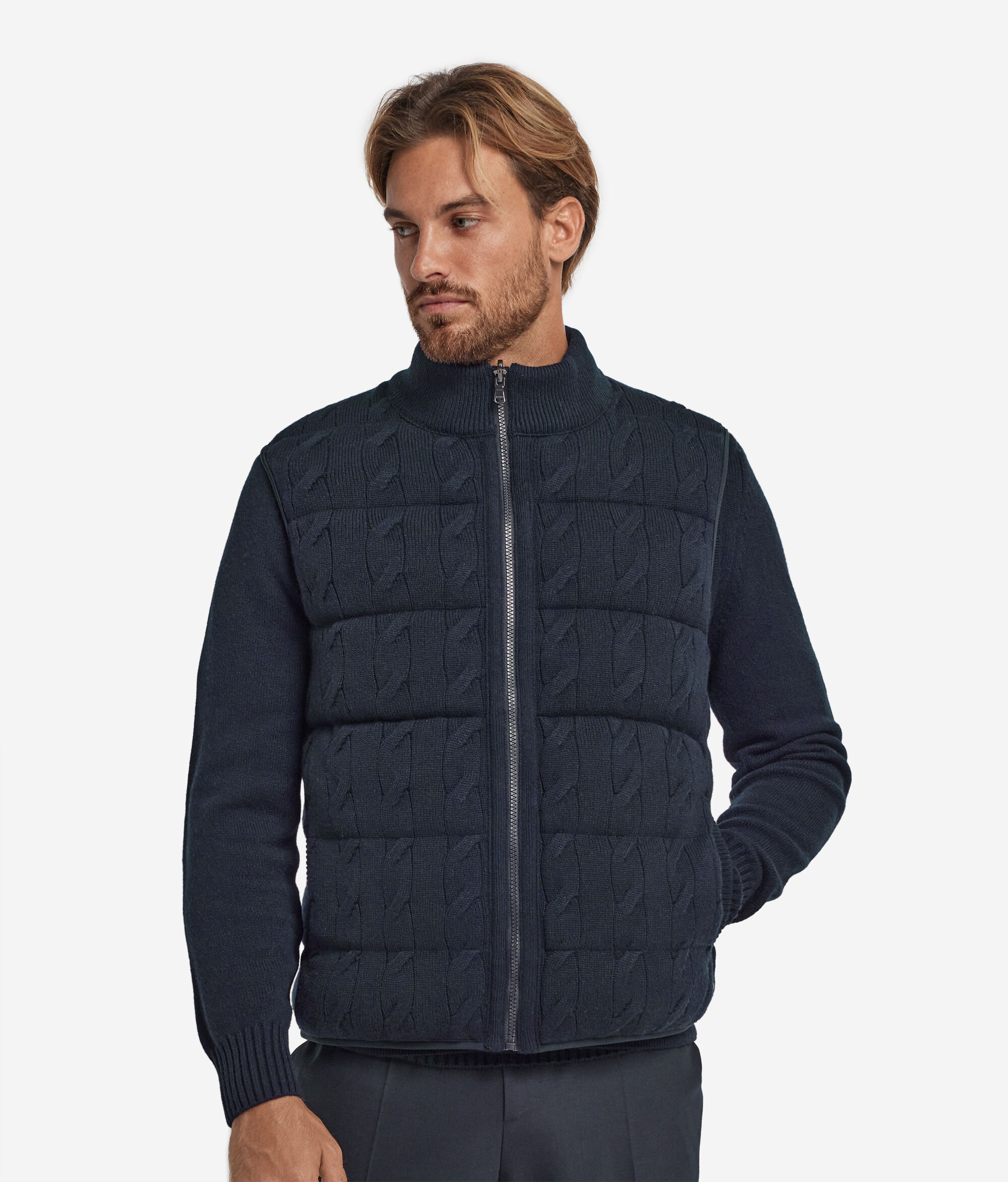 A sophisticated and versatile garment, this Ultrasoft Cashmere down vest stands out for its elegant cable knit that combines warmth and style. The reversible design features a technical fabric inner for extra protection, while the ribbed high-neck collar and welt pockets add refined and functional details, perfect for handling any occasion with class.