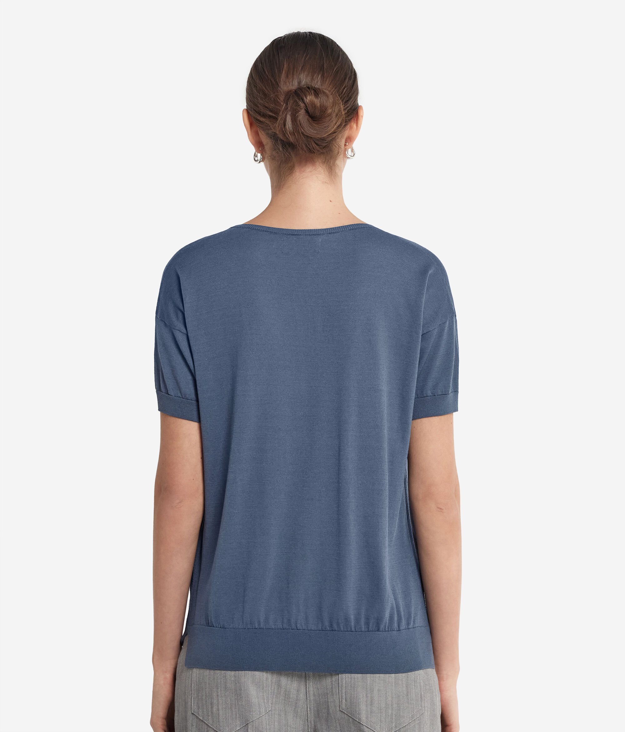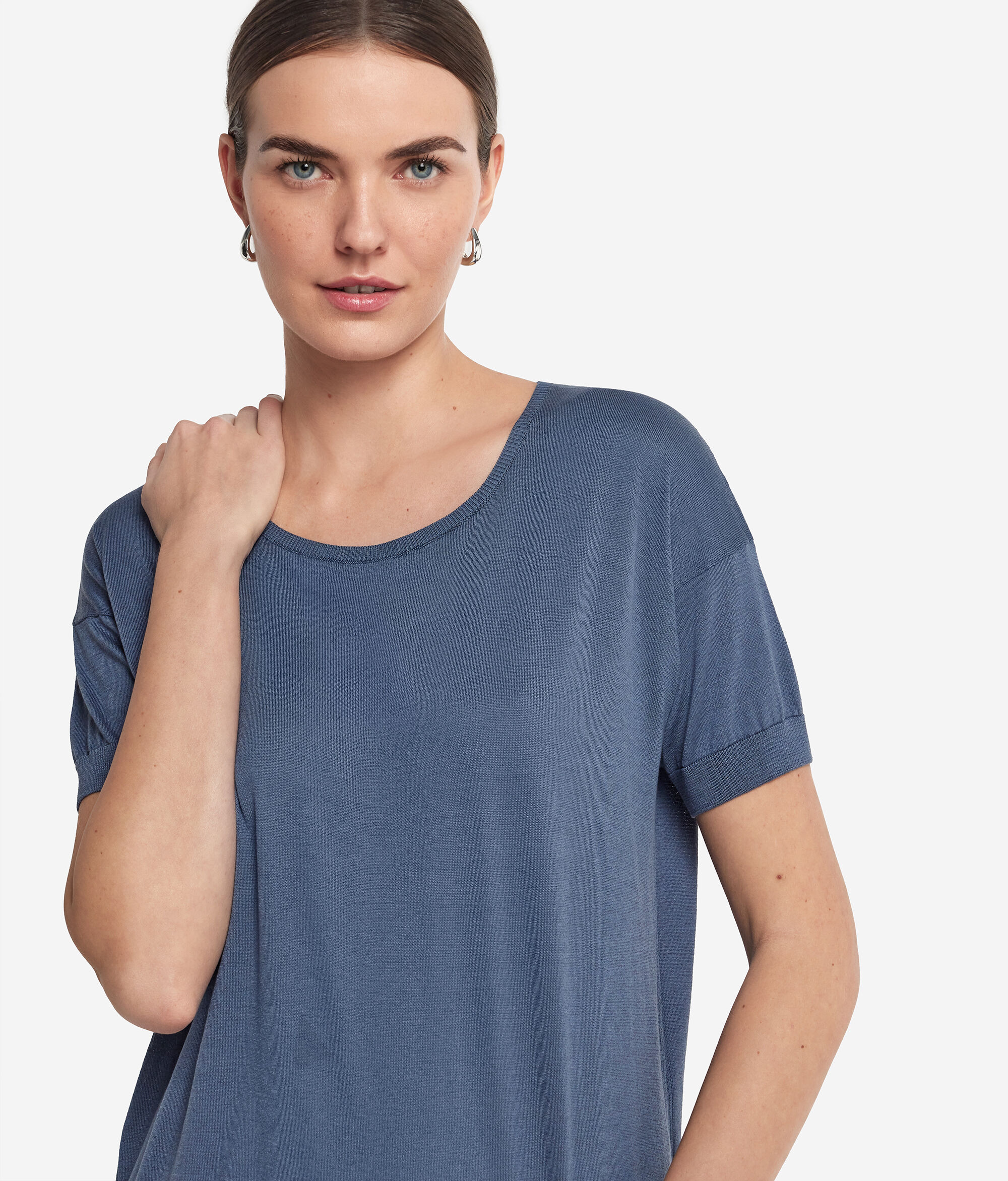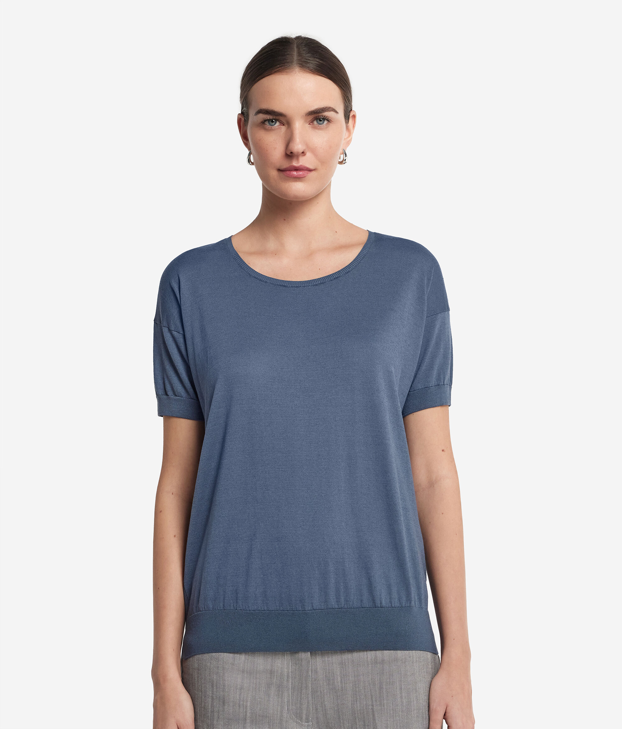 Lüks pamuklu ipek bu kısa kollu bisiklet yaka bluzun sade ve kullanışlı stiline değer katar. Pürüzsüz ve hoş dokusu sayesinde son derece rahat ve kullanışlıdır. Her türlü kombin için mükemmeldir.