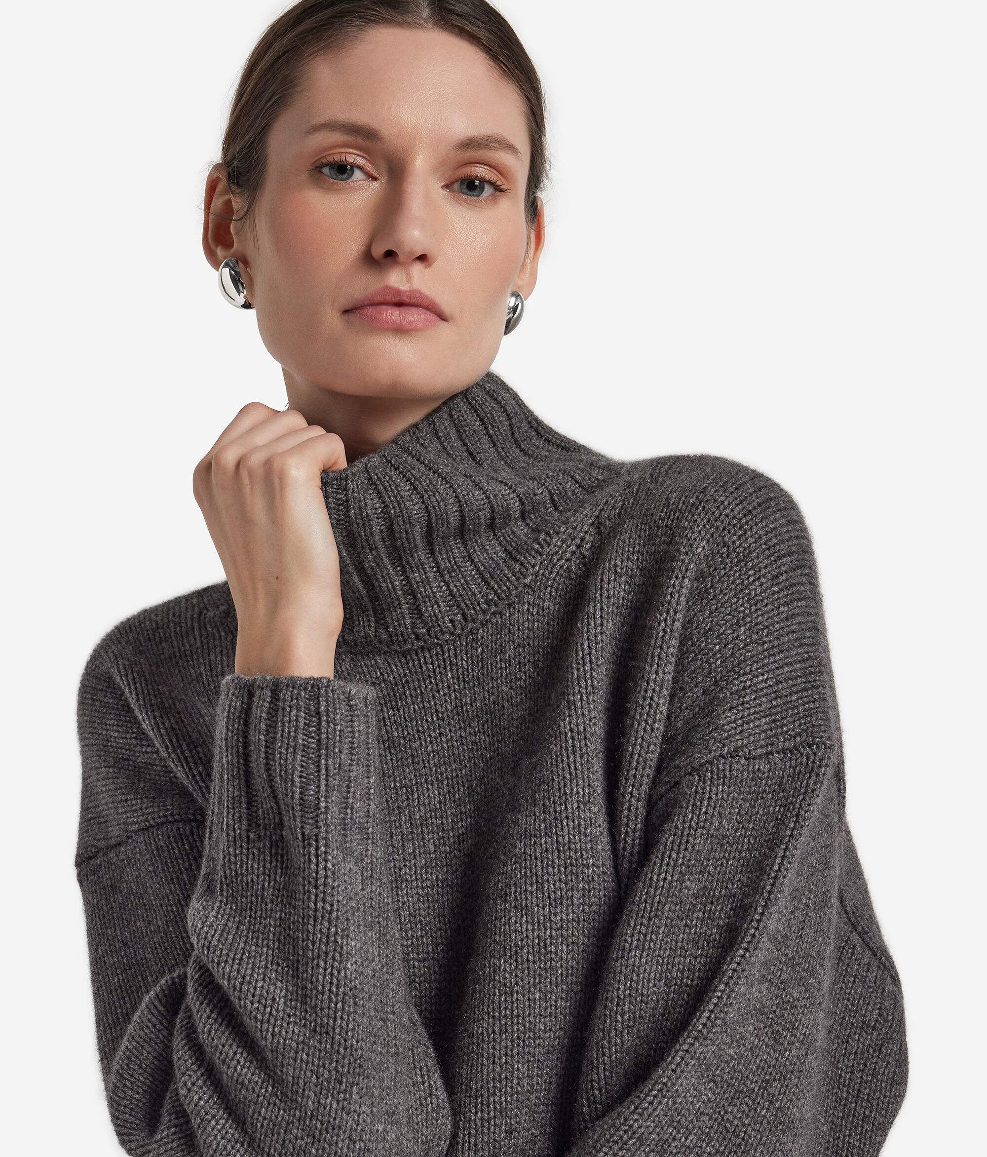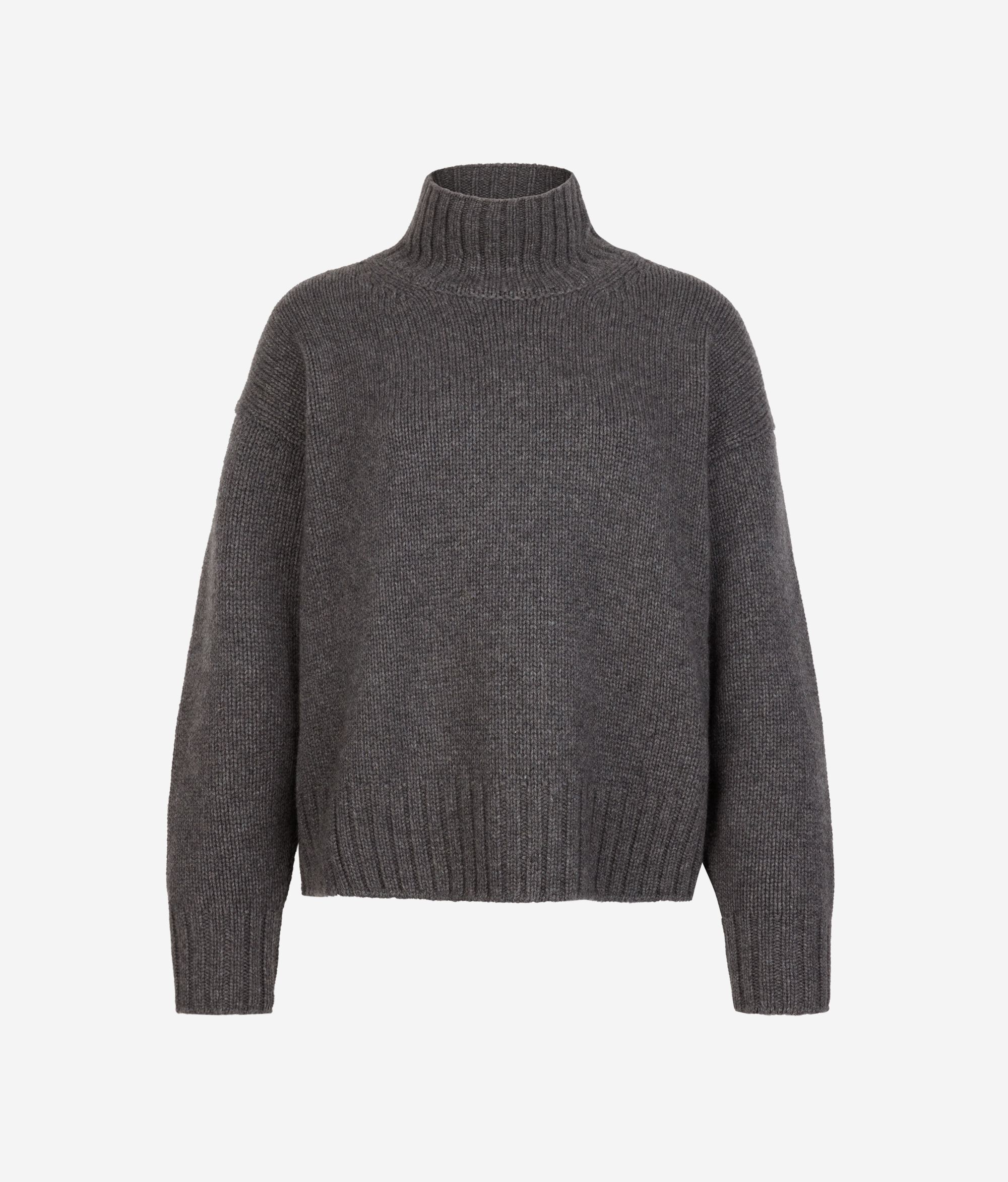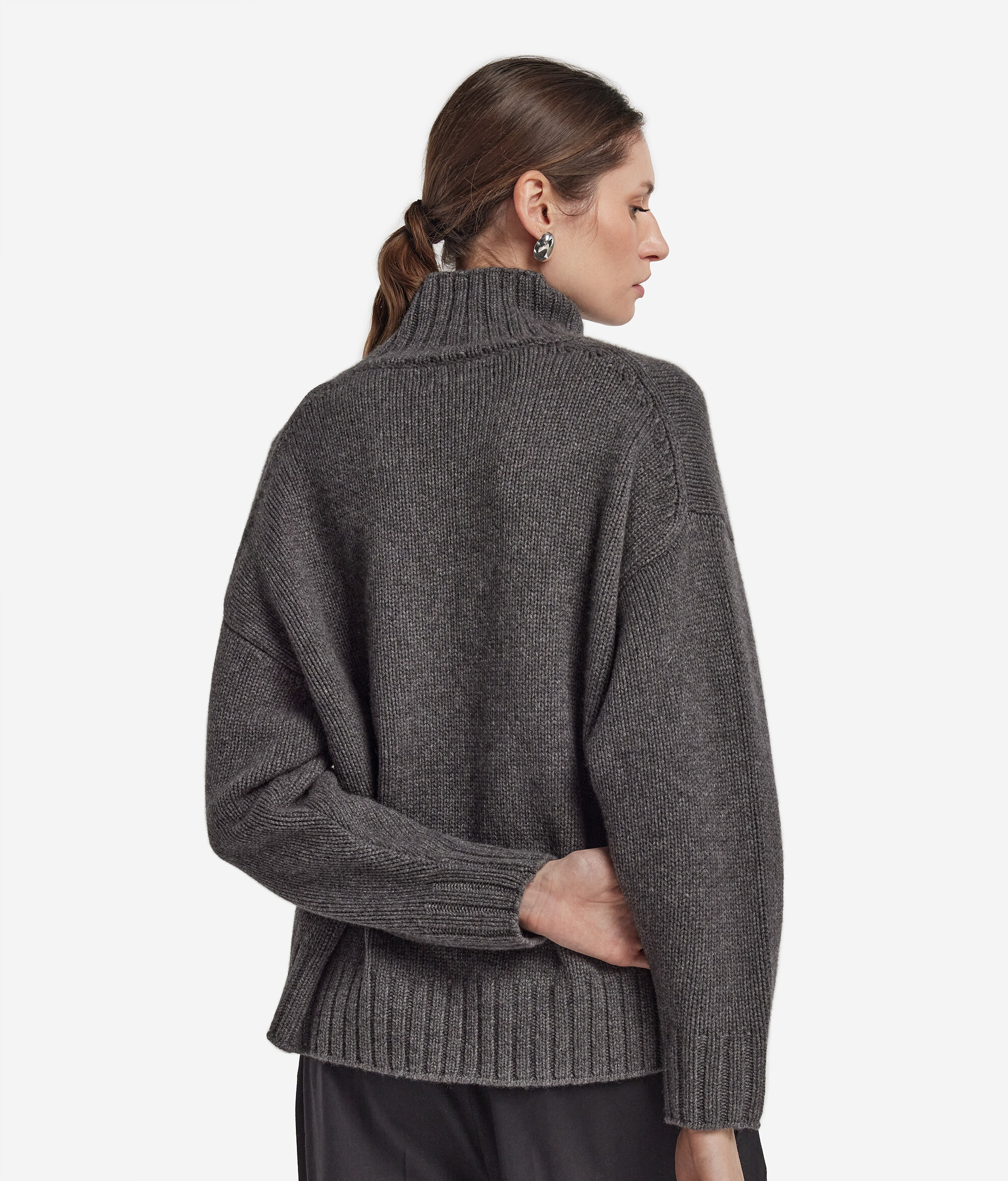 Triko Ultrasoft Cashmere'in lüks yapısı bu yüksek yakalı kazağın modern çizgileriyle buluşur. Klasik bir zevkle ipliğin doğal yumuşaklığını ve yumuşak hacimlere sahip formu, günlük kullanımda parçanın konforlu olmasını sağlayan düşük omuzlarla birleştirir.