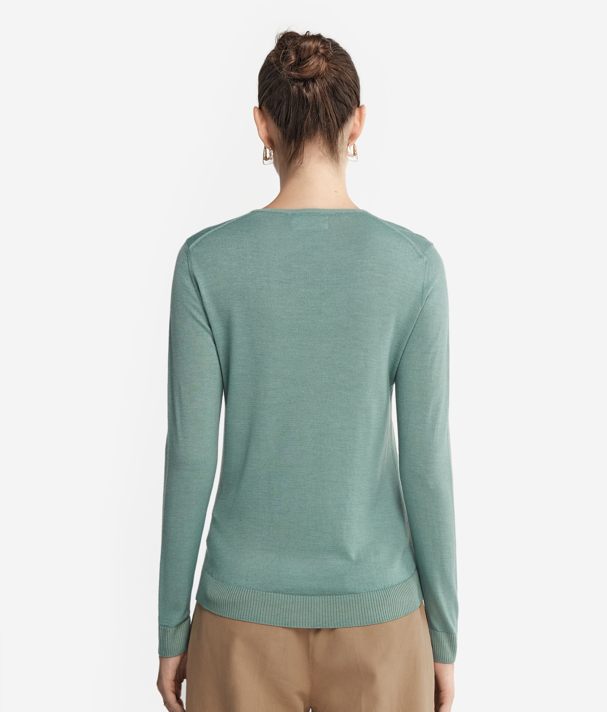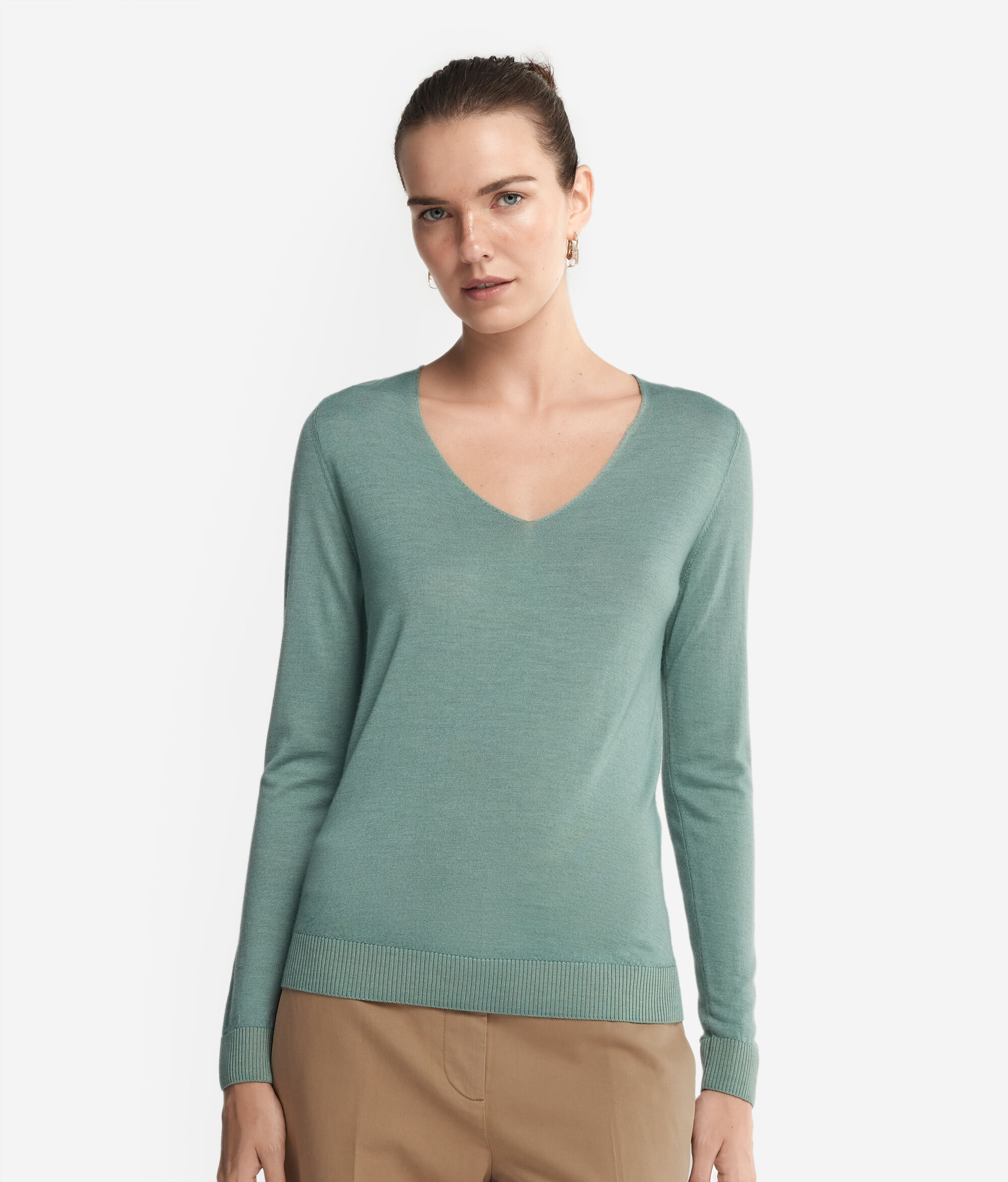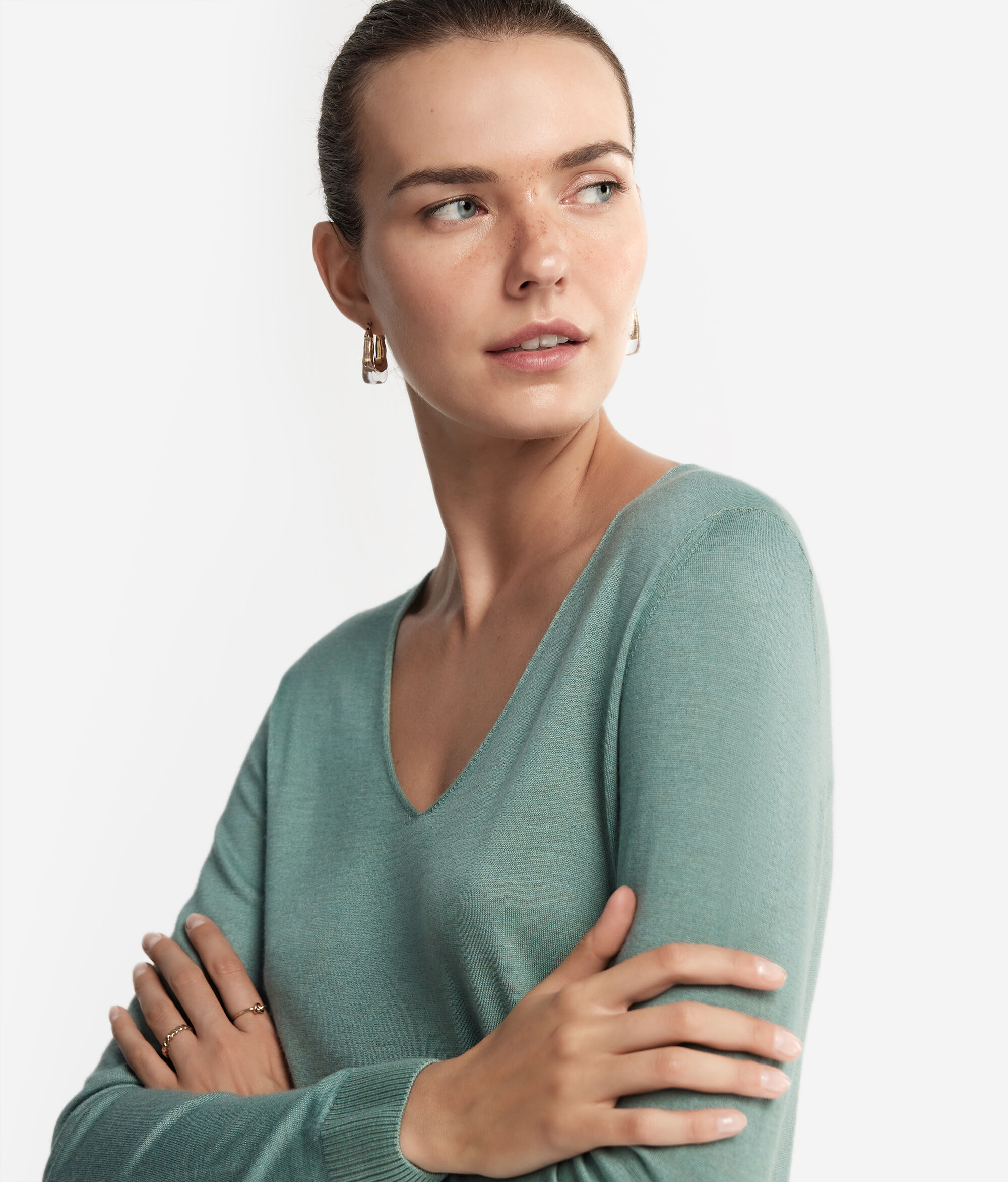 V yakalı ultrafine cashmere bu bluz, hafif düşük omuzlu uzun kollu bir modeldir. Ribanalı yaka, etek ucu ve manşetleri bulunmaktadır. Kalıp ve omuz standarttır. Parça boyamalı renk çeşitleri bulunan bu ürün geleneksel yöntemlerle boyanmıştır.