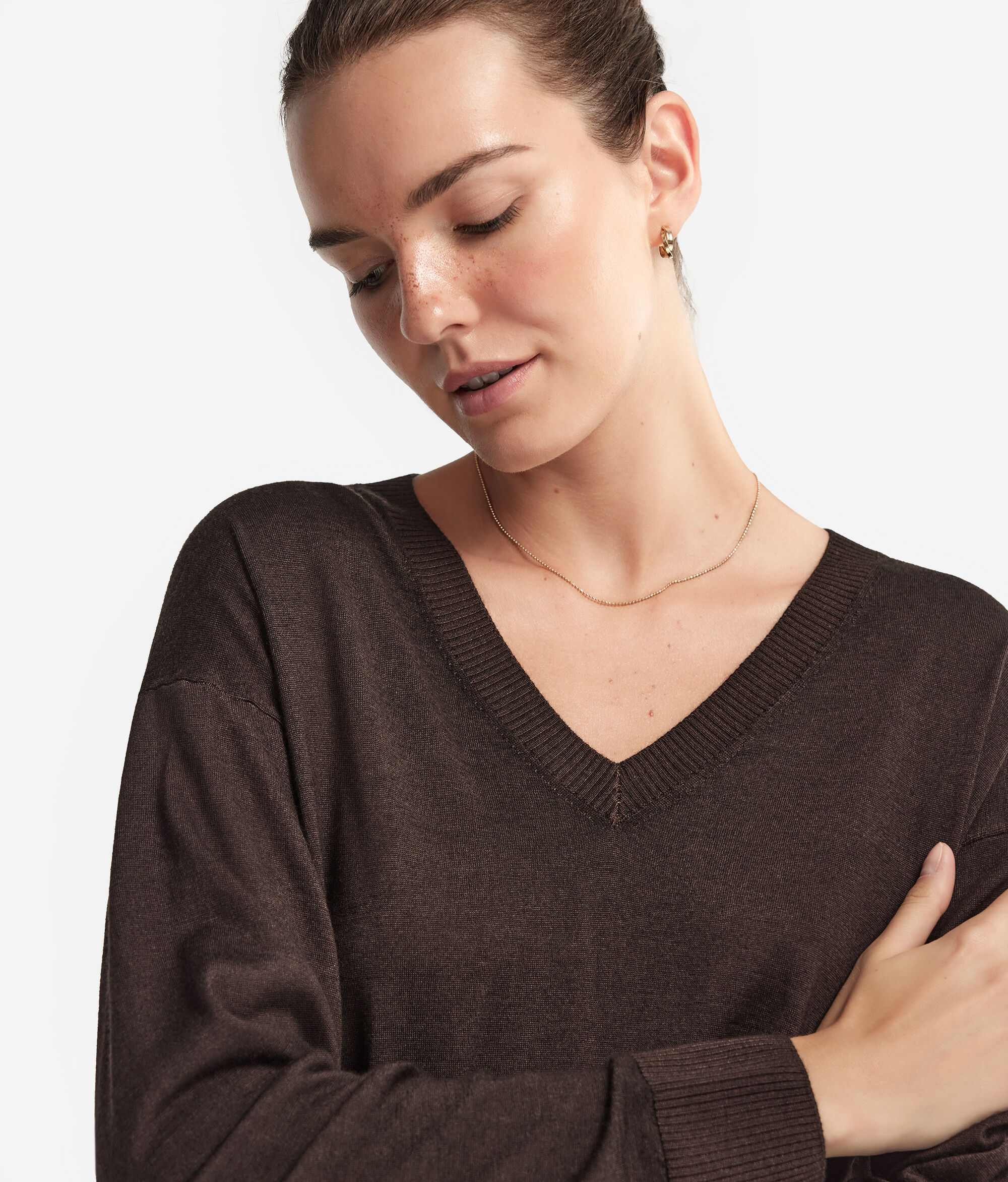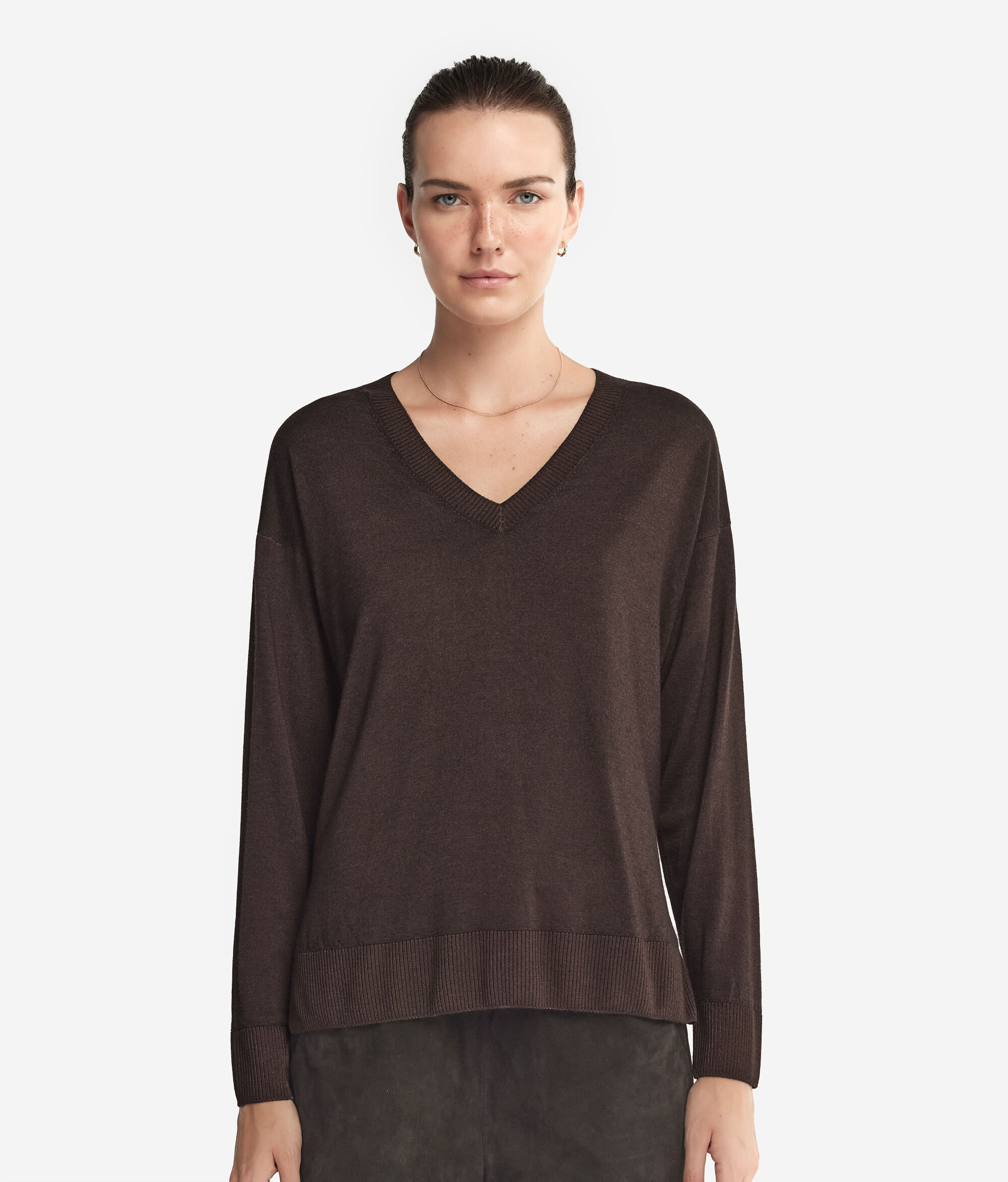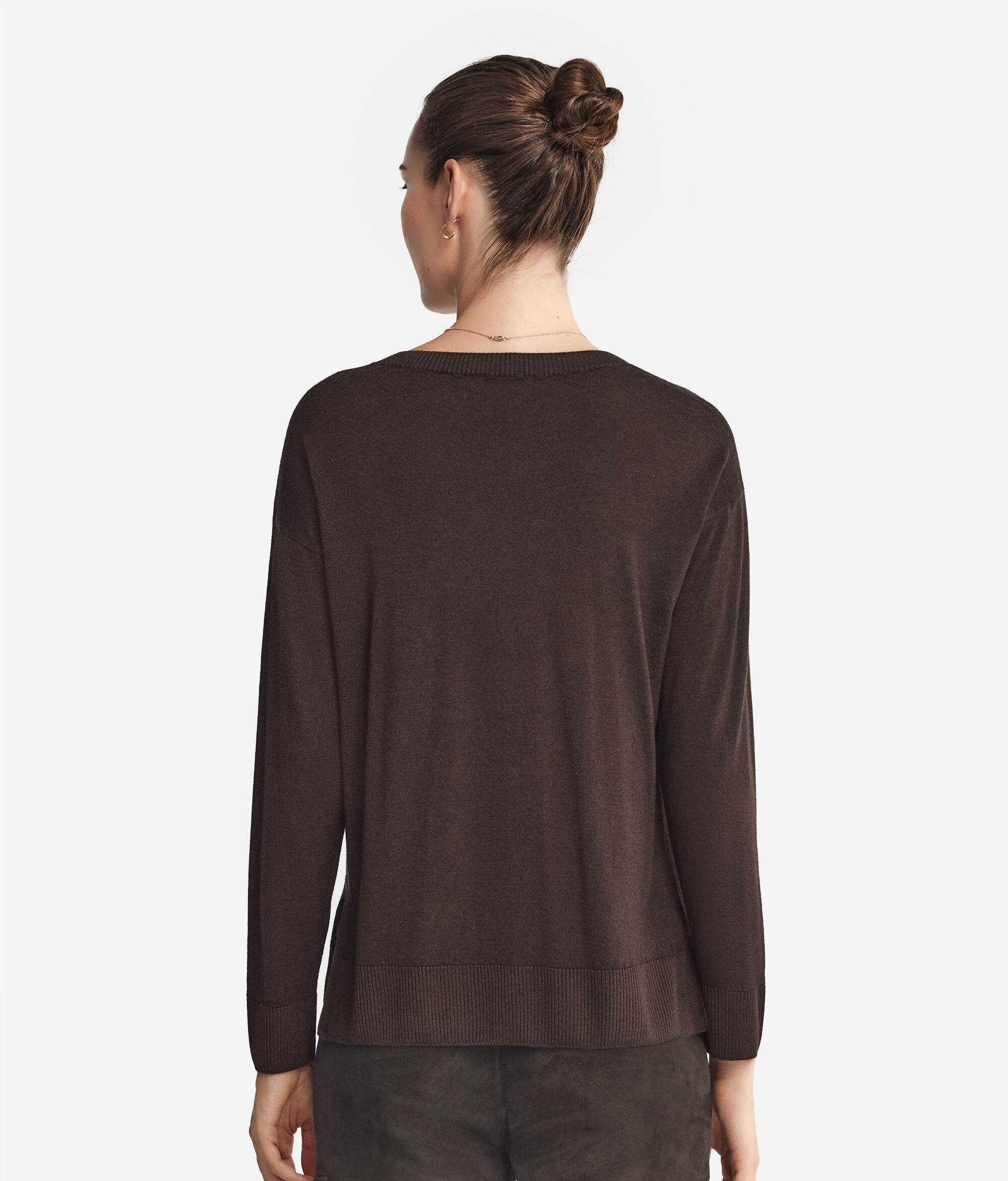 Ultrafine cashmere V yaka bluz, yakası, manşetleri ve etek ucu ribanalı, uzun kollu bir modeldir. Parçanın özelliği yanlardaki yırtmaçlarıdır. Omuzları hafif düşüktür ve yumuşak kalıptır.