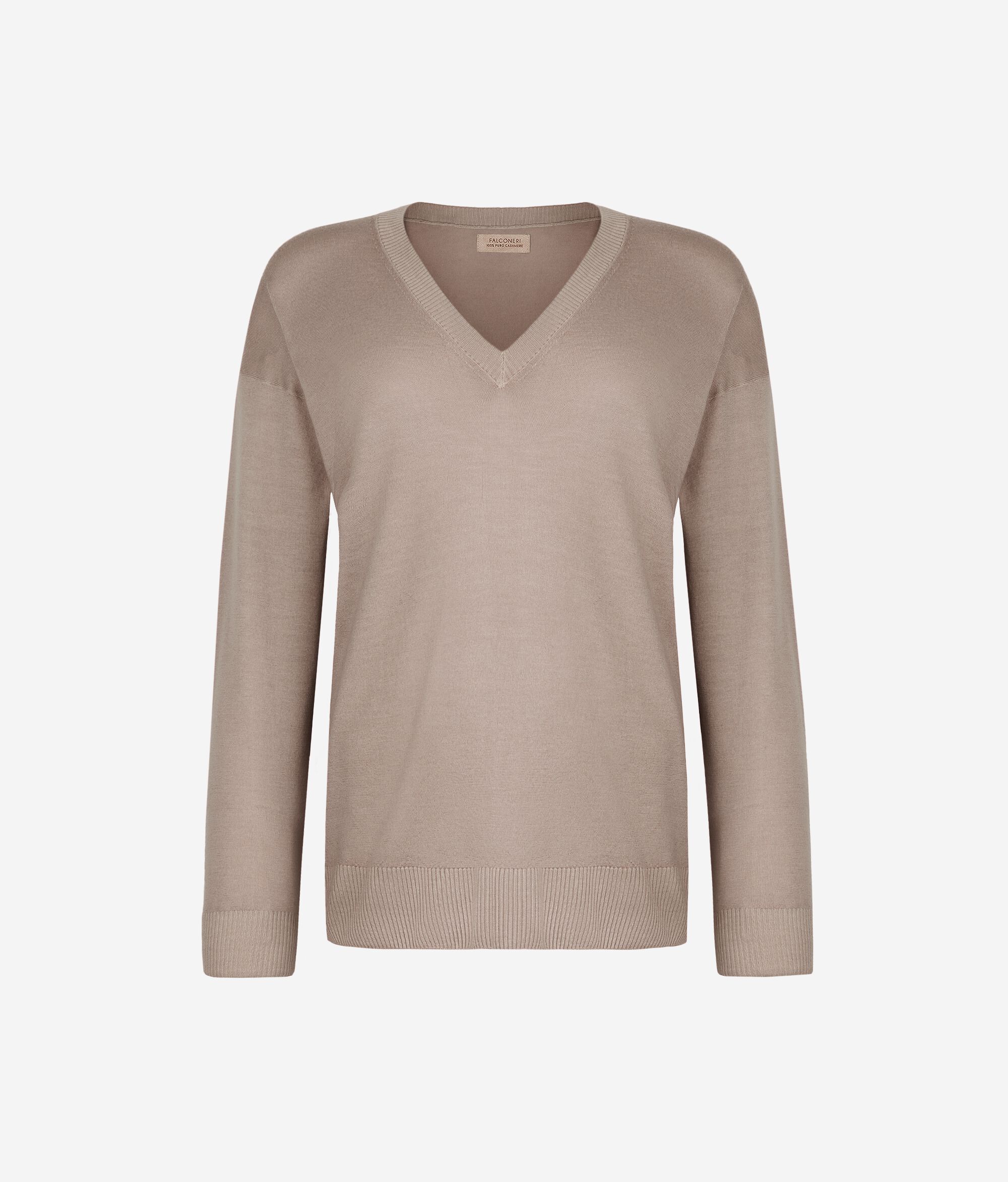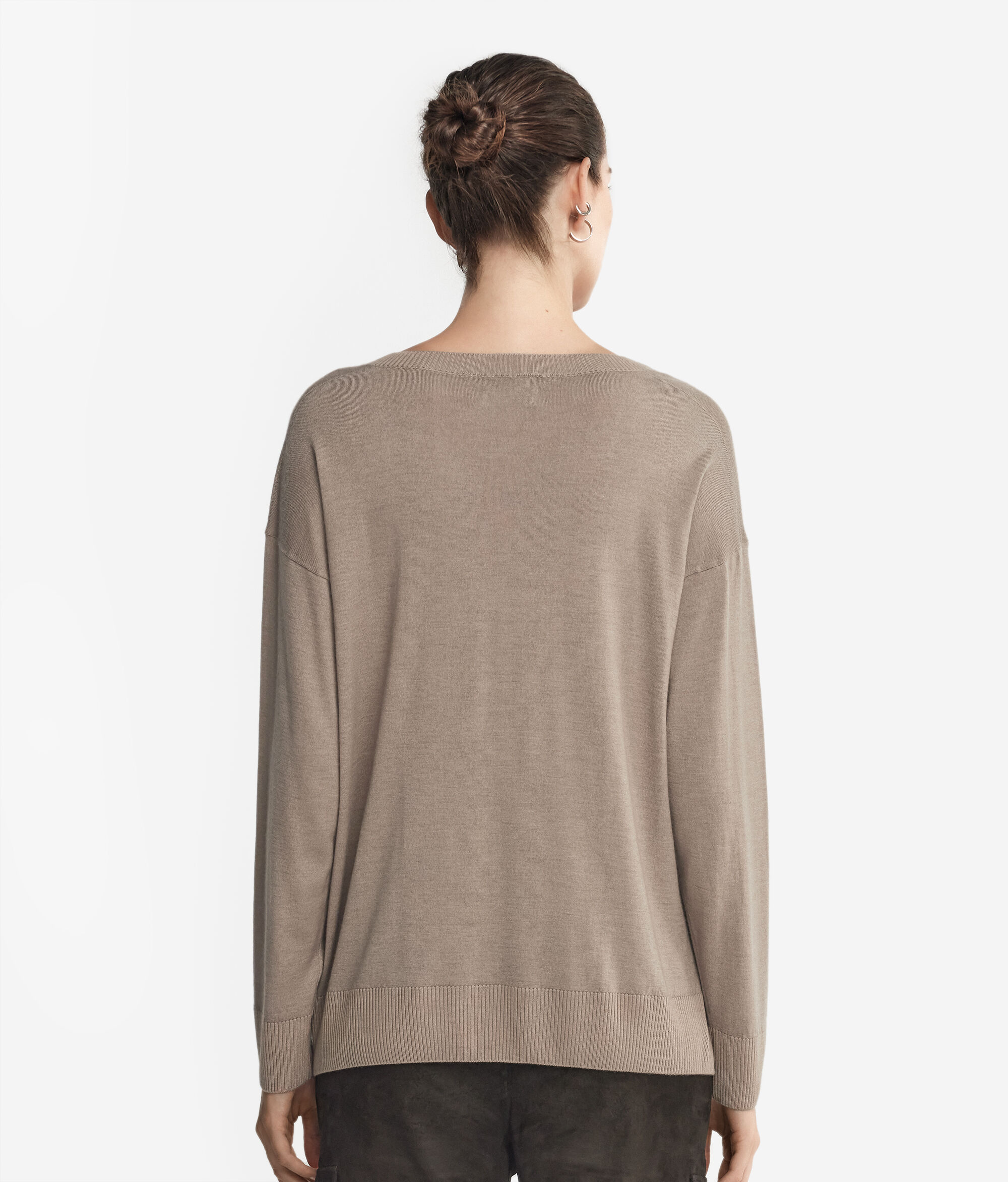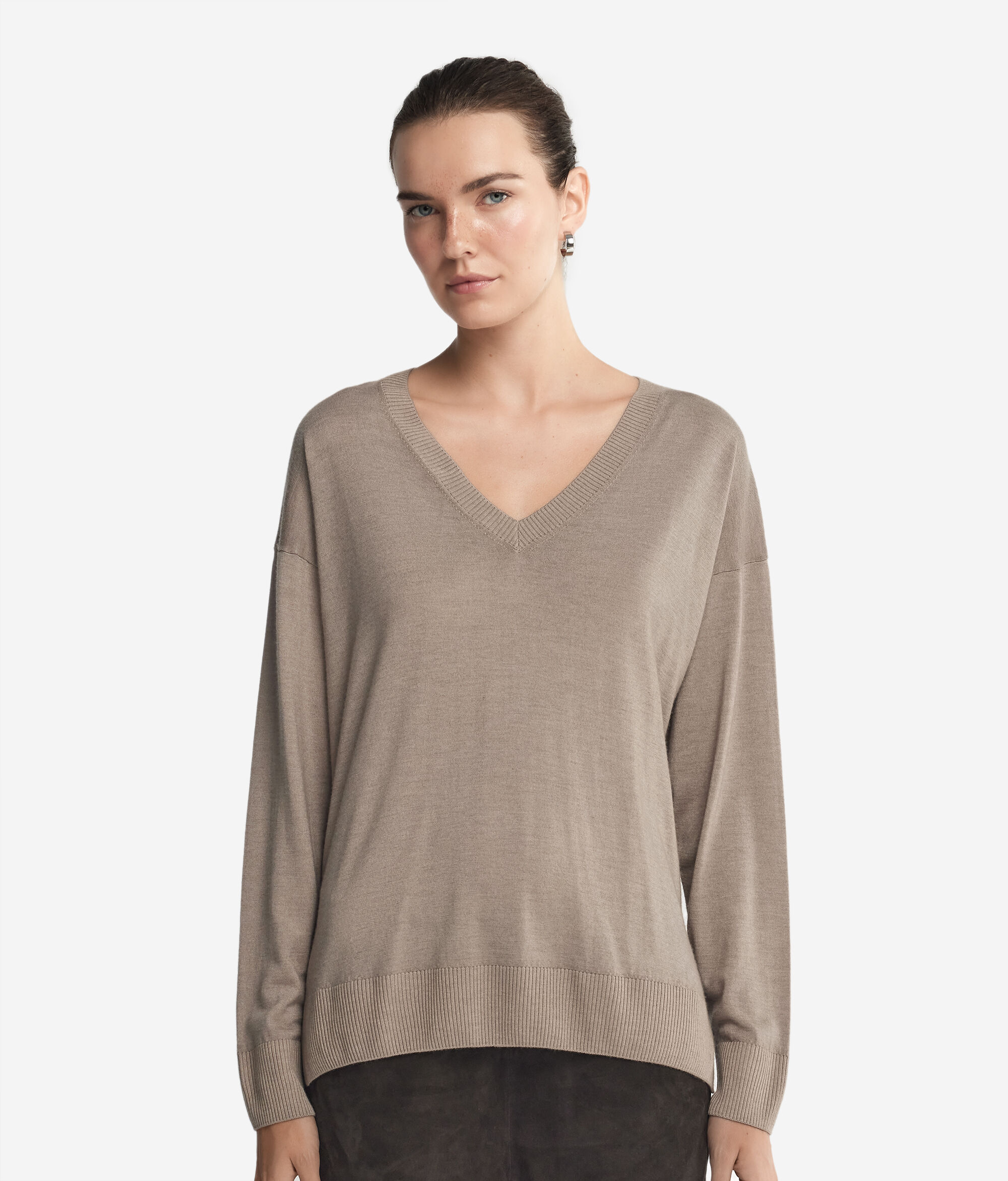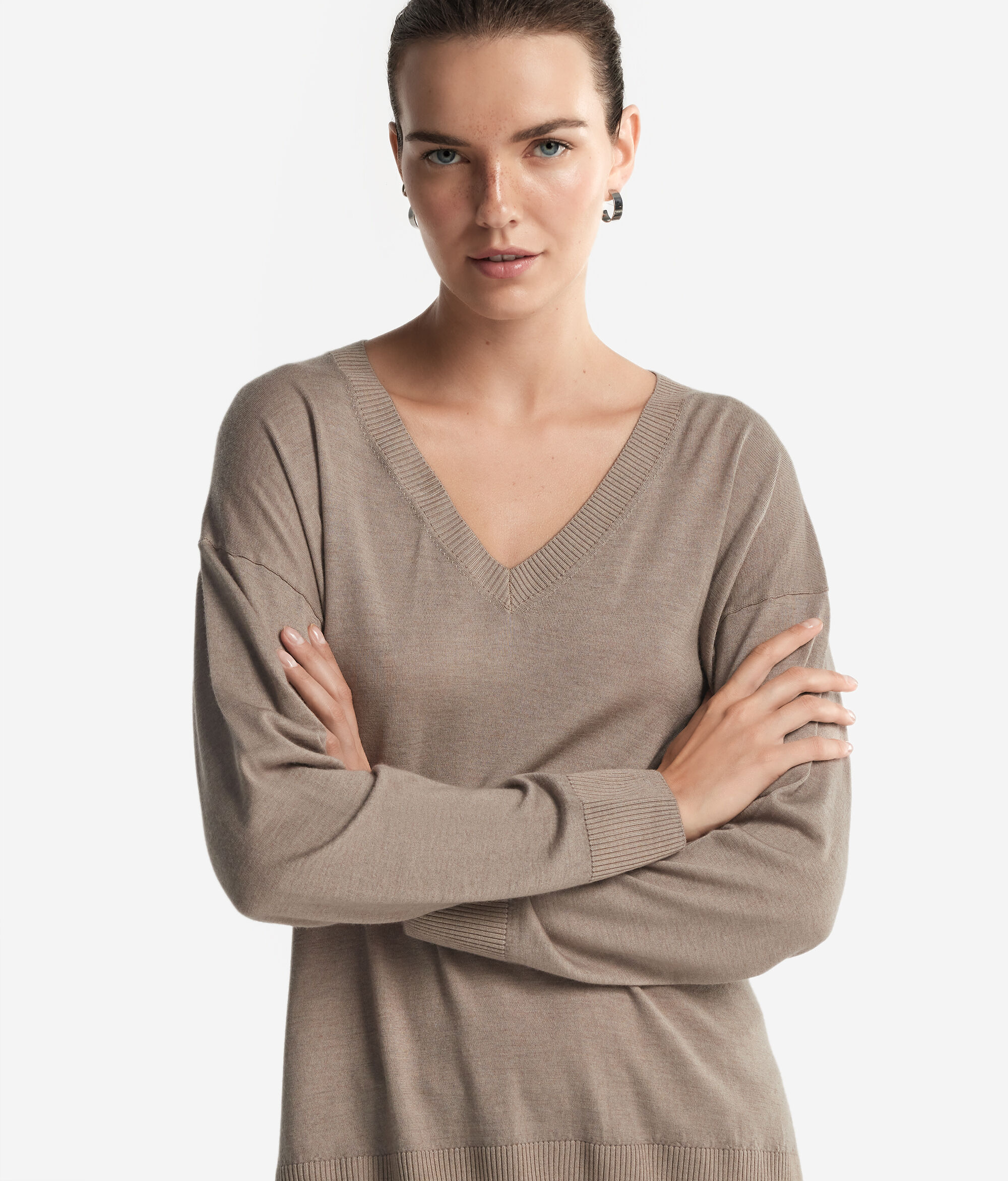 Ultrafine cashmere V yaka bluz, yakası, manşetleri ve etek ucu ribanalı, uzun kollu bir modeldir. Parçanın özelliği yanlardaki yırtmaçlarıdır. Omuzları hafif düşüktür ve yumuşak kalıptır.