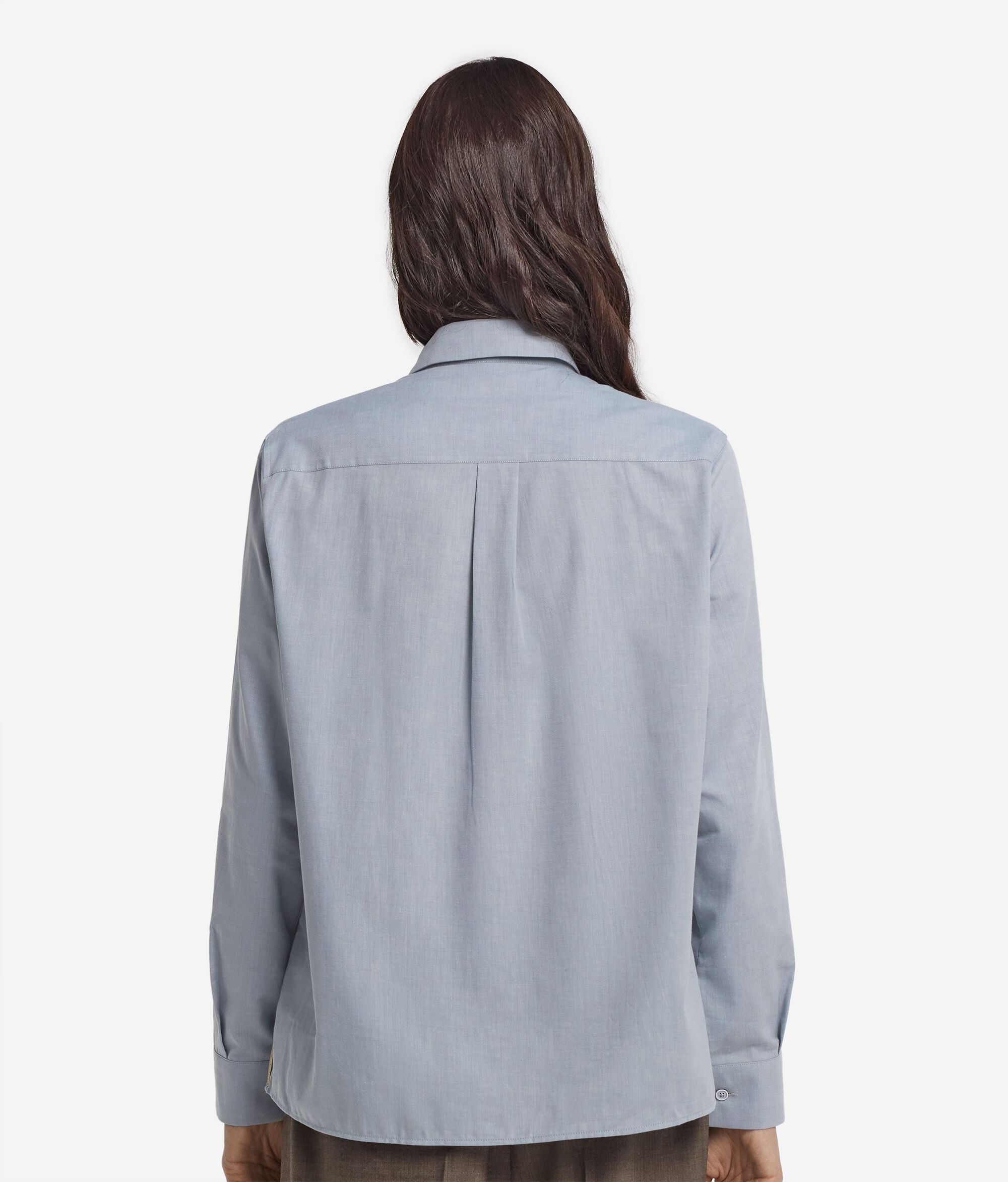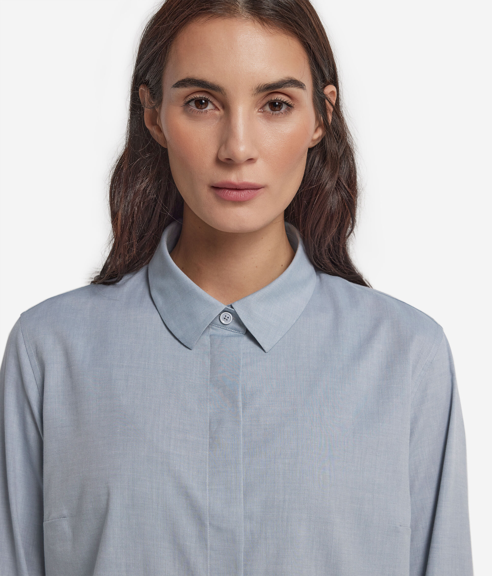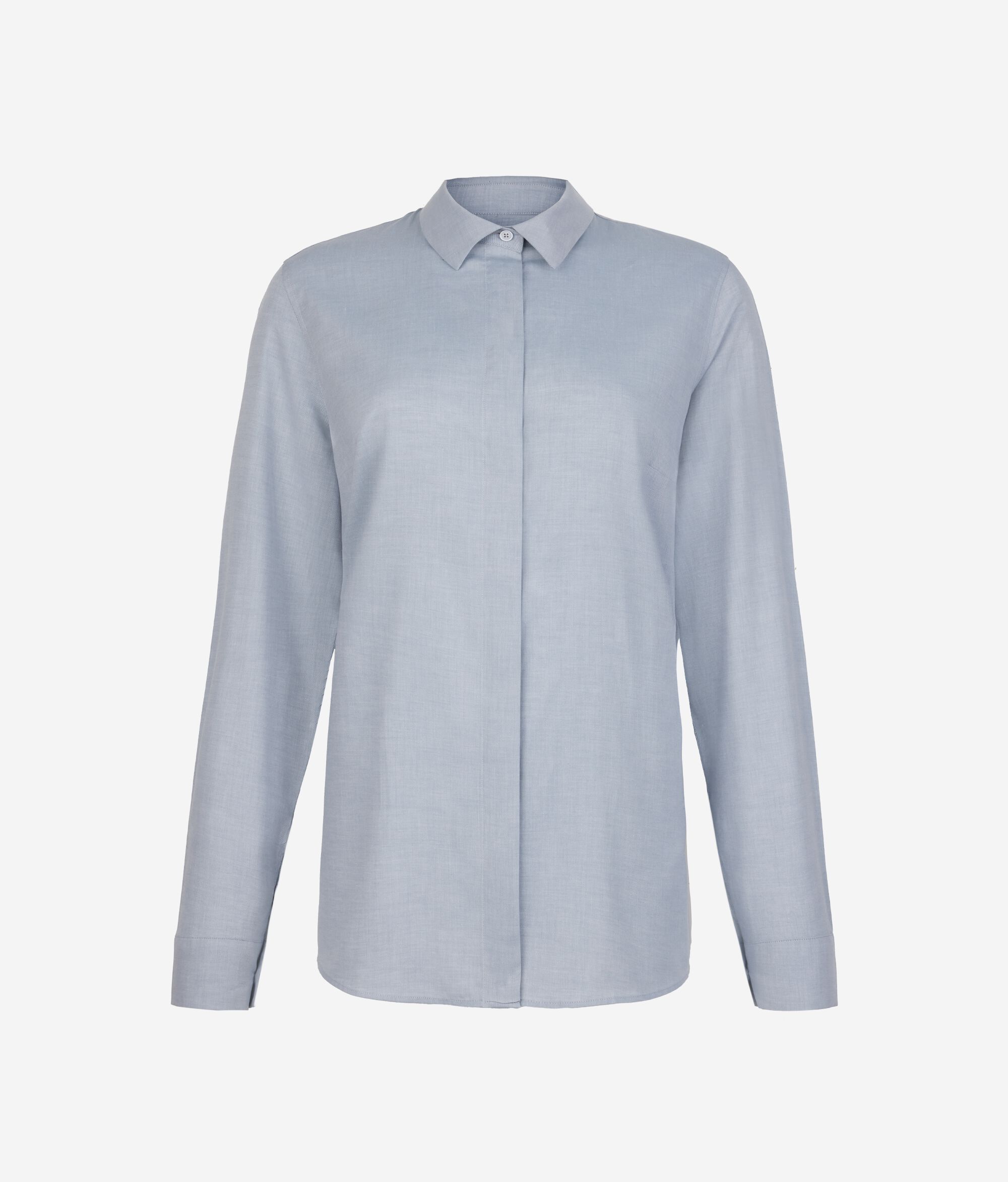 Minimalist and refined, this shirt is crafted from a luxurious cashmere-cotton blend that combines elegance with a gentle touch. The classic collar and concealed front placket create a sleek, modern look, while buttoned cuffs add a refined touch. The rounded hem and Regular Fit. We recommend sizing up one to two sizes for the best fit create a smooth, versatile silhouette, ideal for refined casual looks that can be effortlessly worn in both informal and more sophisticated settings.