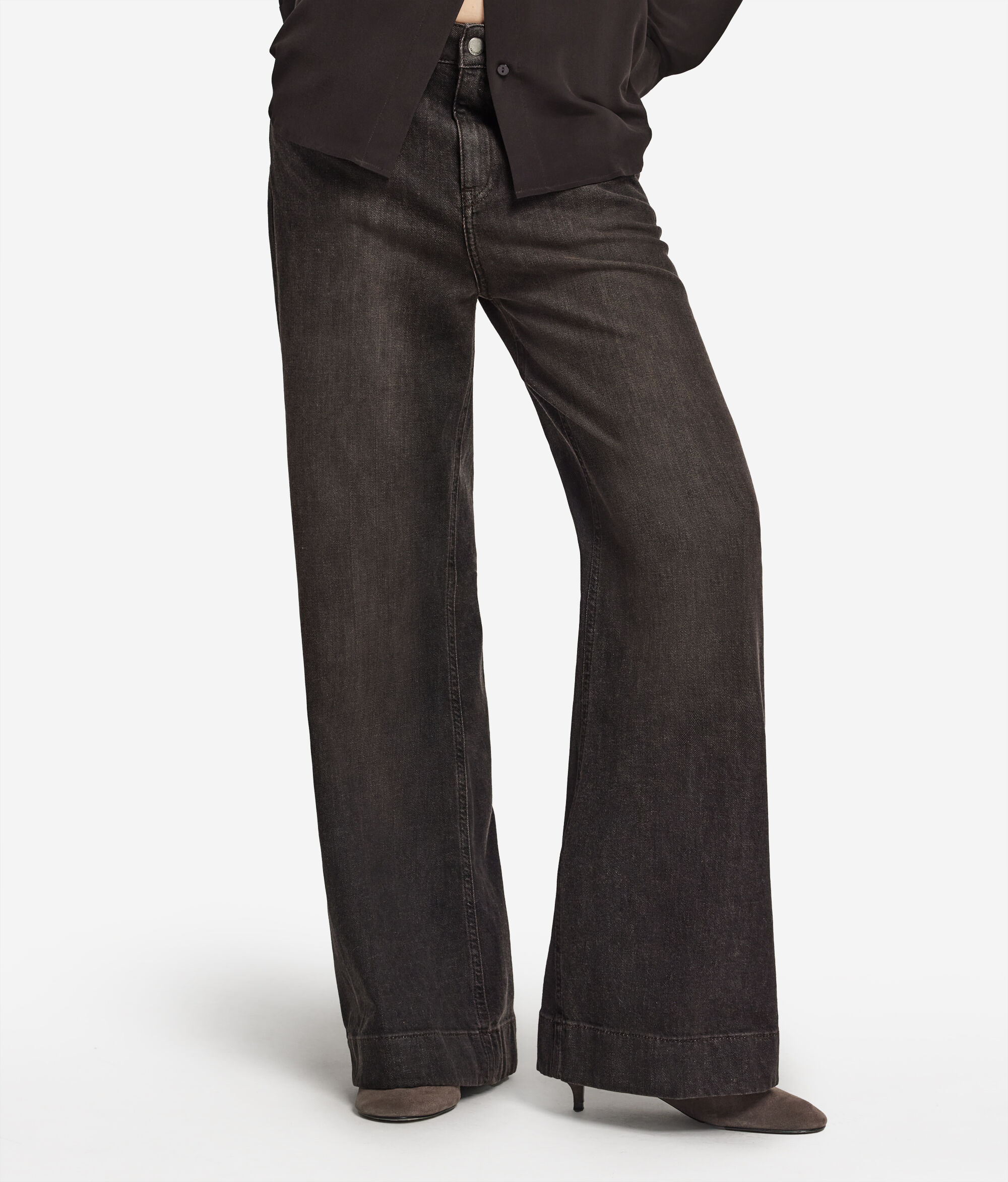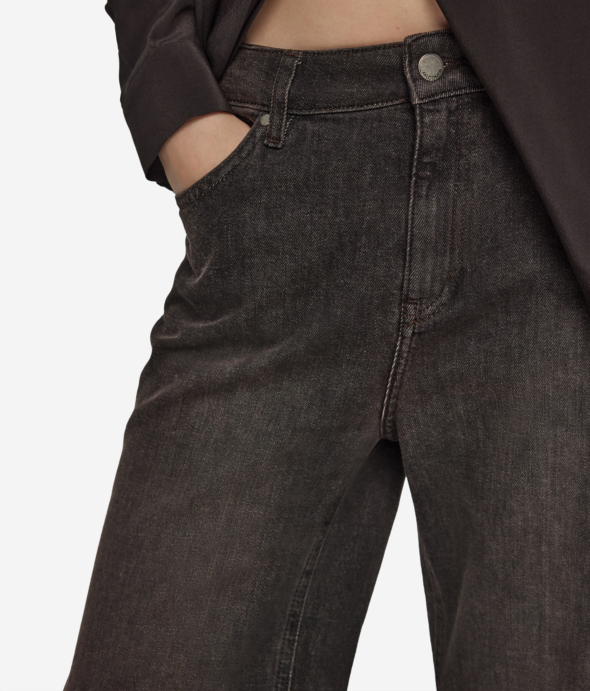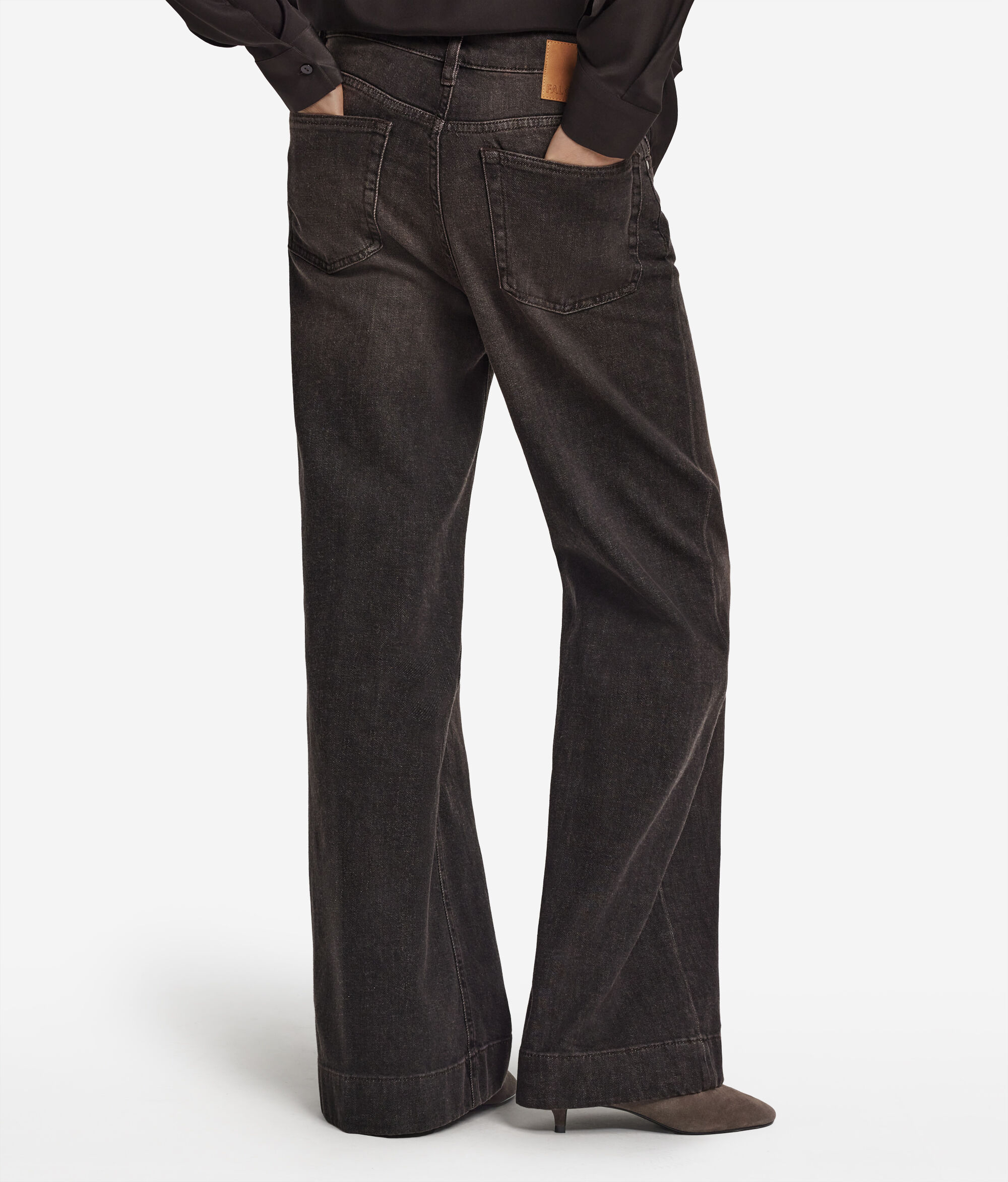 Contemporary volumes and tailored details blend in perfect harmony in these cotton and cashmere denim wide-leg trousers. They feature a zip and logo button fastening on the front and practical side and back pockets. Their floor length emphasises the svelte and elegant silhouette, while the fabric gives the item a casual appearance.