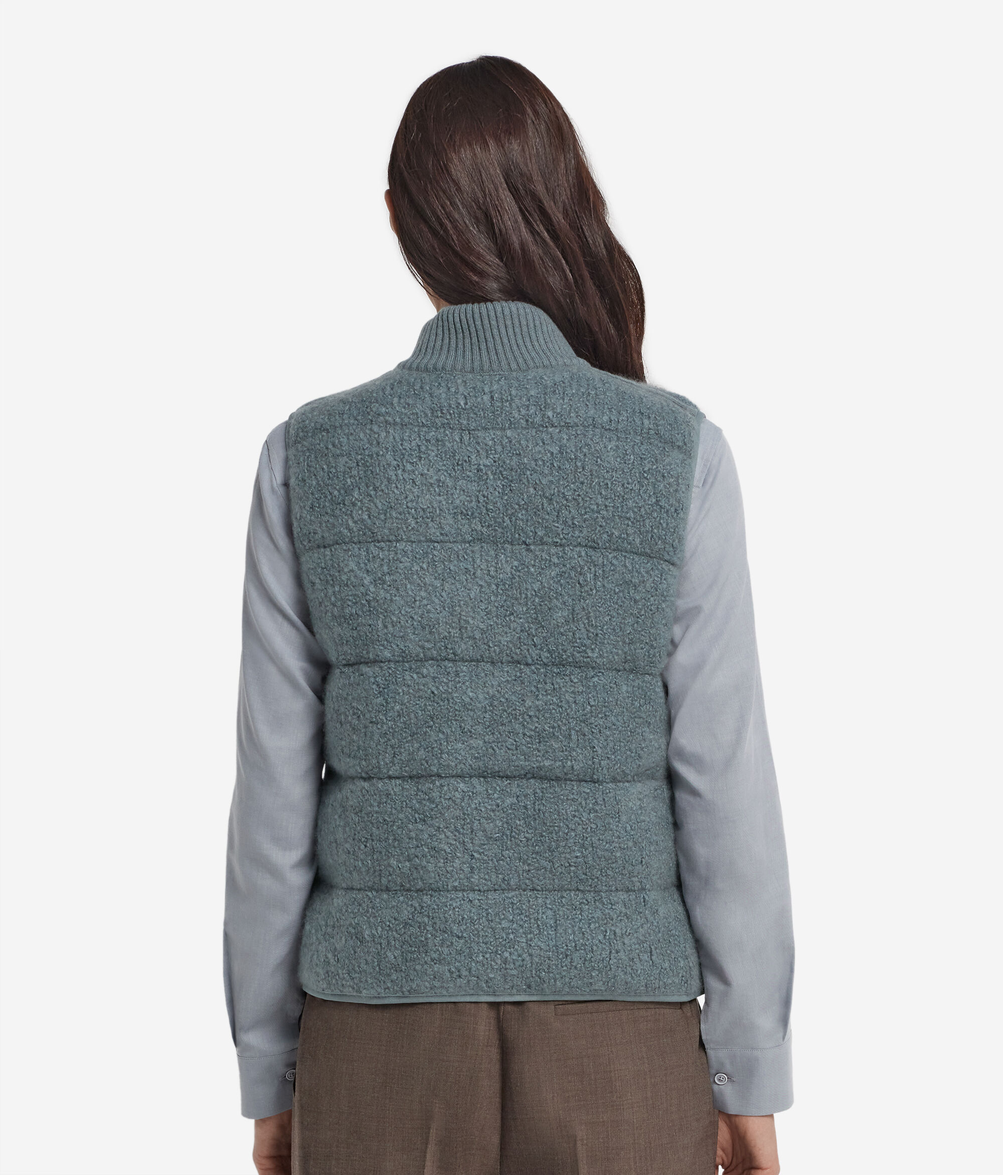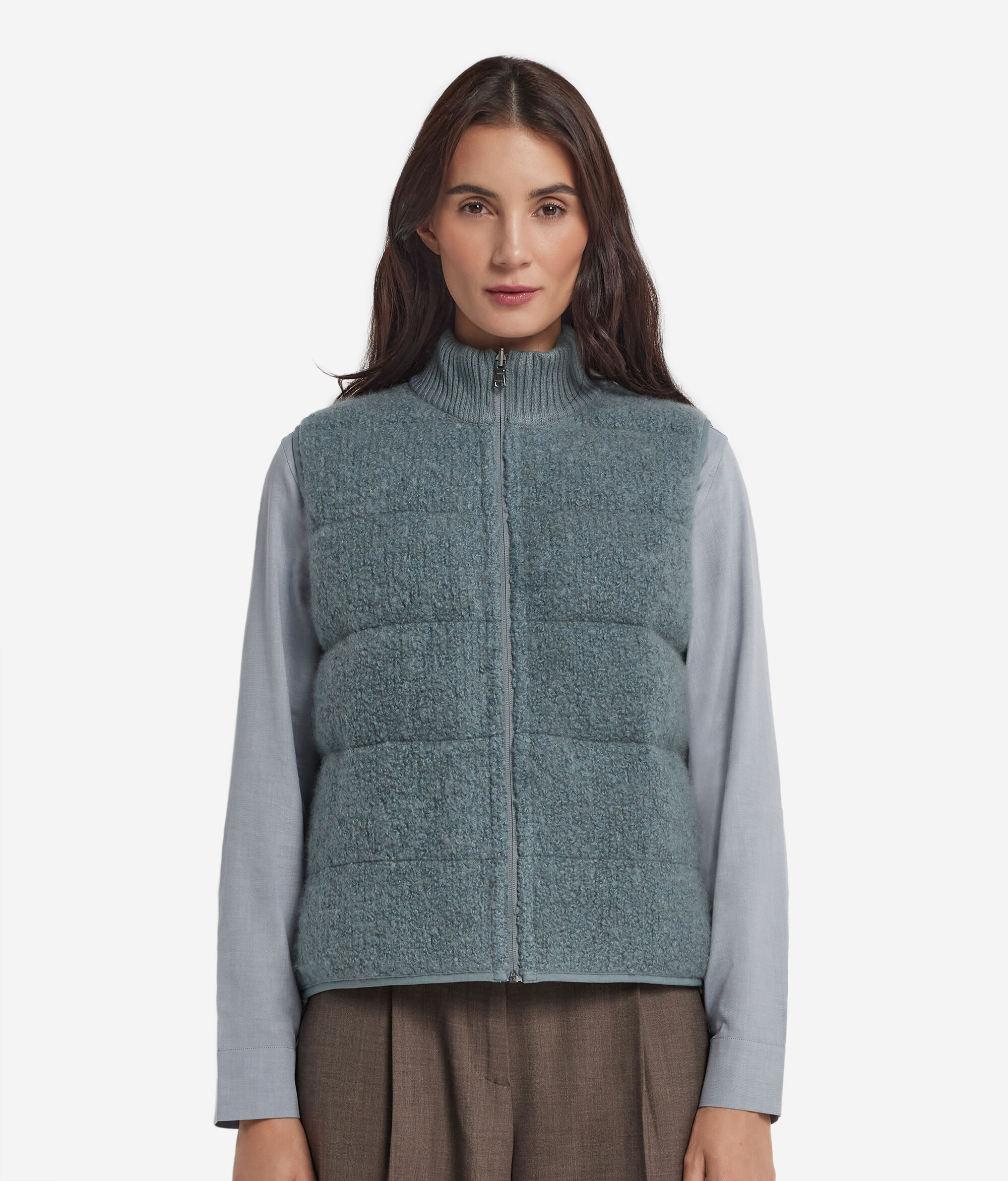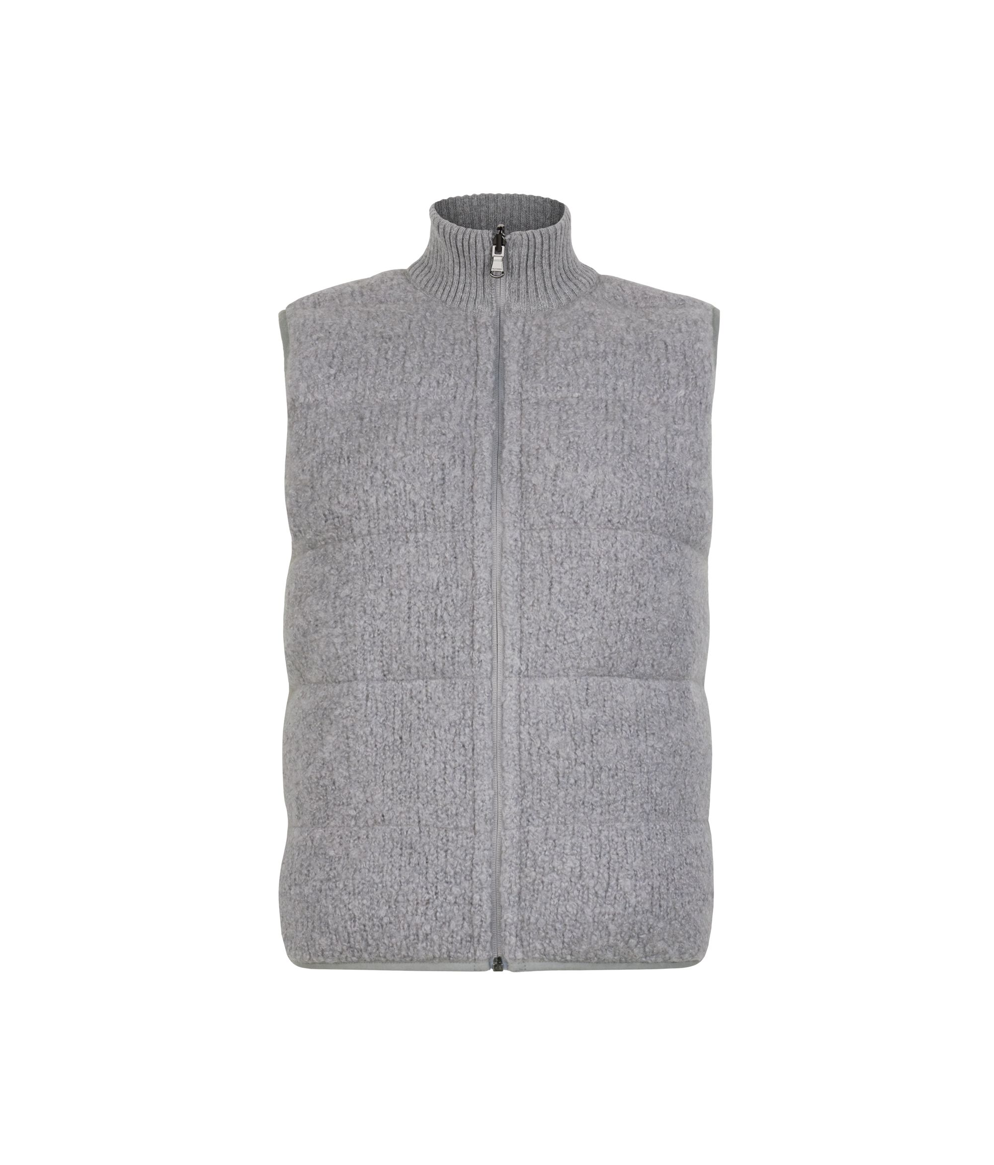 Crafted from refined bouclé cashmere and nylon, this reversible sleeveless down gilet is ideal for those looking for a versatile and stylish garment. The metal zip fastening and Ultrasoft Cashmere high-neck collar offer comfort and a touch of elegance, while the hip length and Regular Fit. We recommend sizing up one to two sizes for the best fit ensure a balanced silhouette. A practical and sophisticated garment, perfect for braving seasonal changes with class.