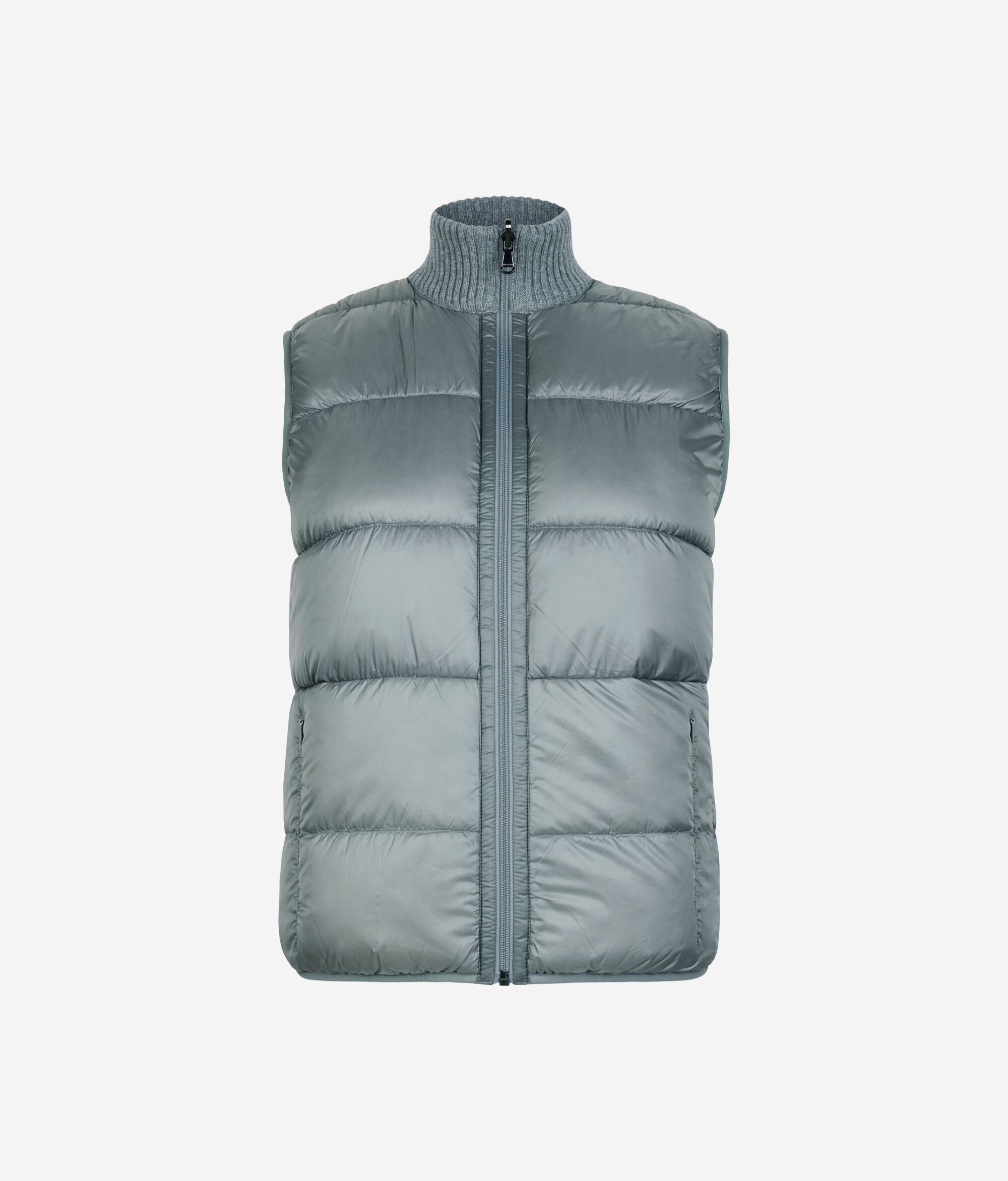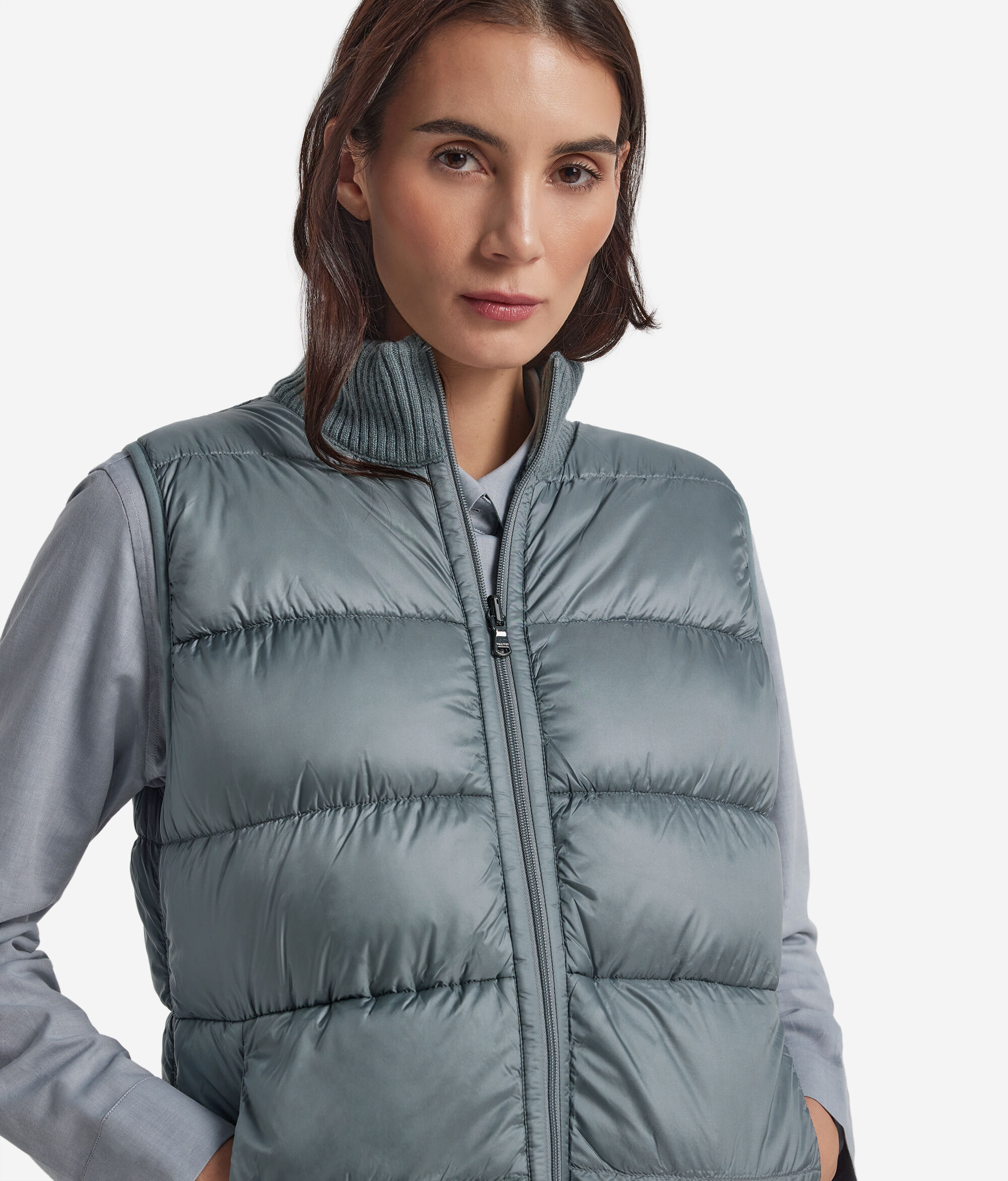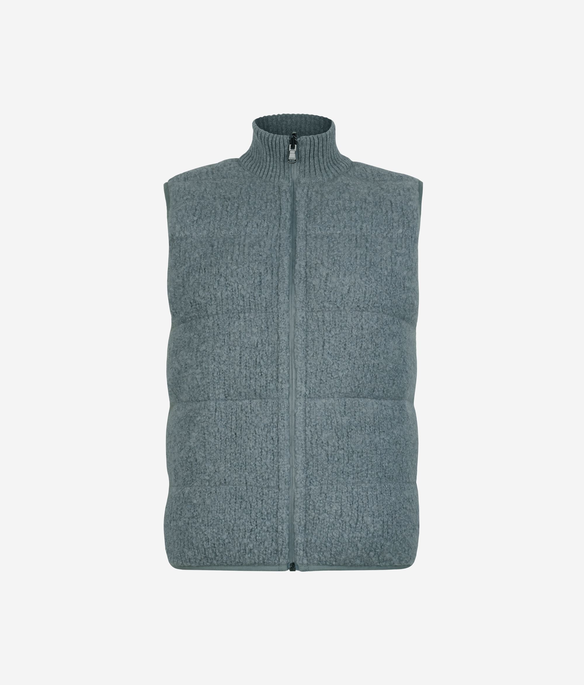 Crafted from refined bouclé cashmere and nylon, this reversible sleeveless down gilet is ideal for those looking for a versatile and stylish garment. The metal zip fastening and Ultrasoft Cashmere high-neck collar offer comfort and a touch of elegance, while the hip length and Regular Fit. We recommend sizing up one to two sizes for the best fit ensure a balanced silhouette. A practical and sophisticated garment, perfect for braving seasonal changes with class.
