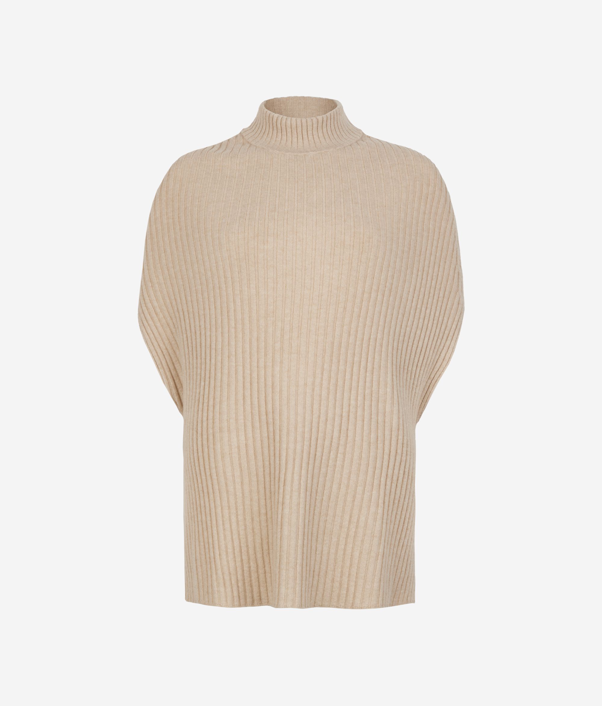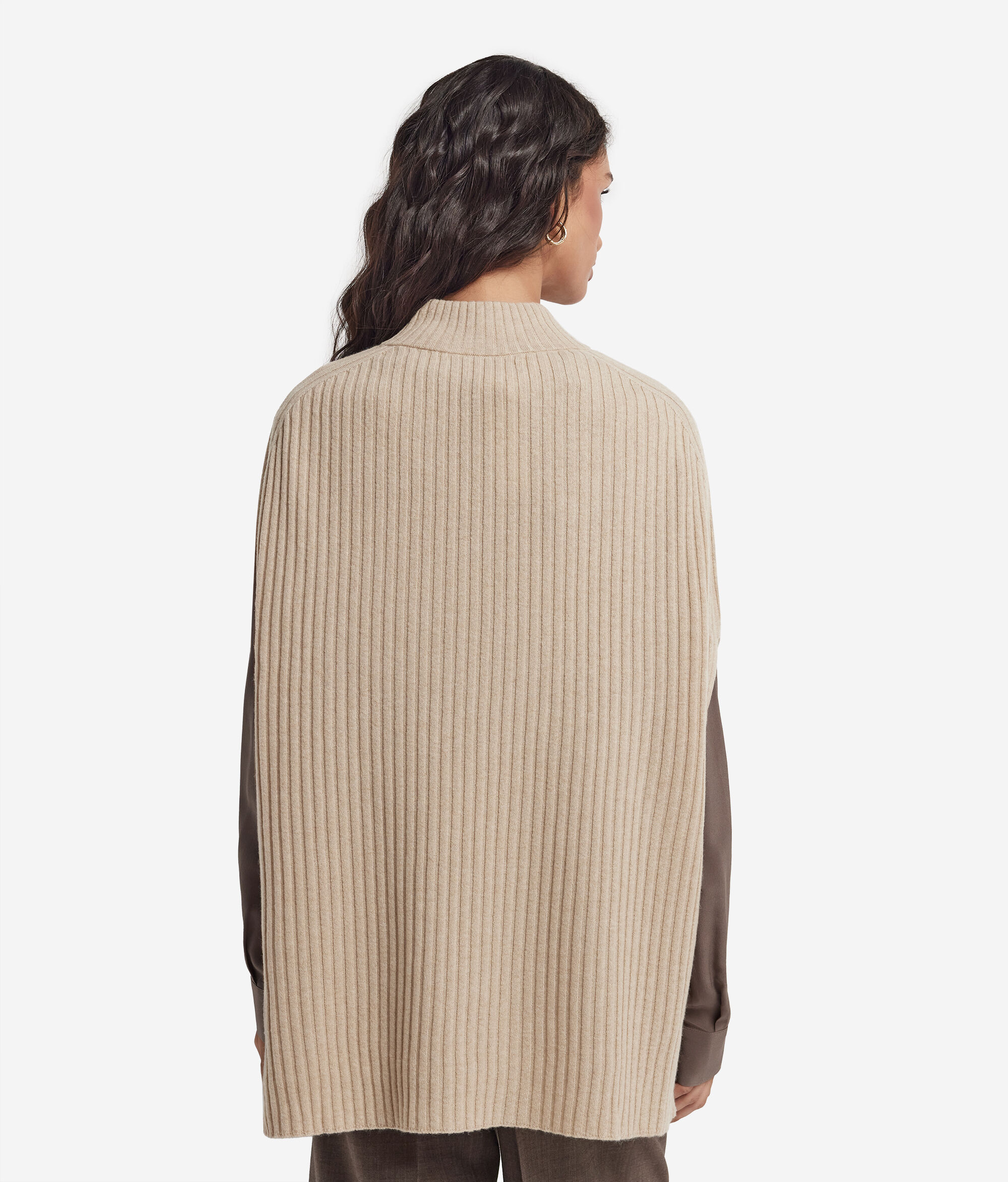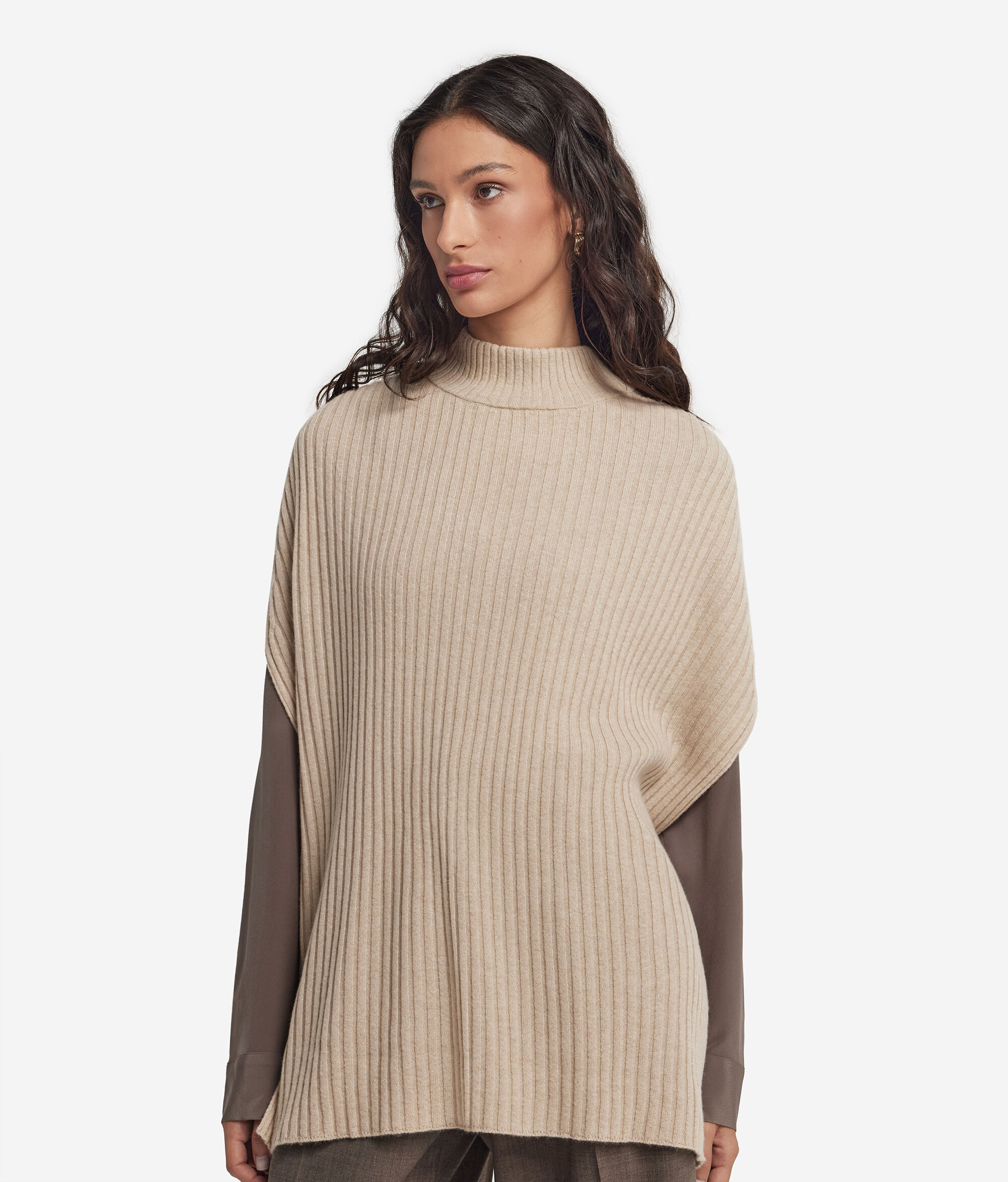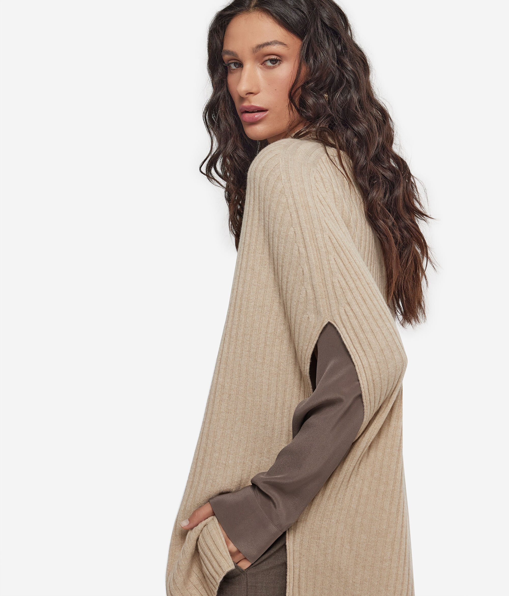 Simplicity and character come together in the design of this cape in soft Ultrasoft Cashmere. The high neck frames the face with refined elegance, while the vertical ribbed finish gives structure and a pleasant texture to the garment. The side openings and the relaxed fit create a fluid and contemporary play of volumes, ideal for creating light and dynamic layering.