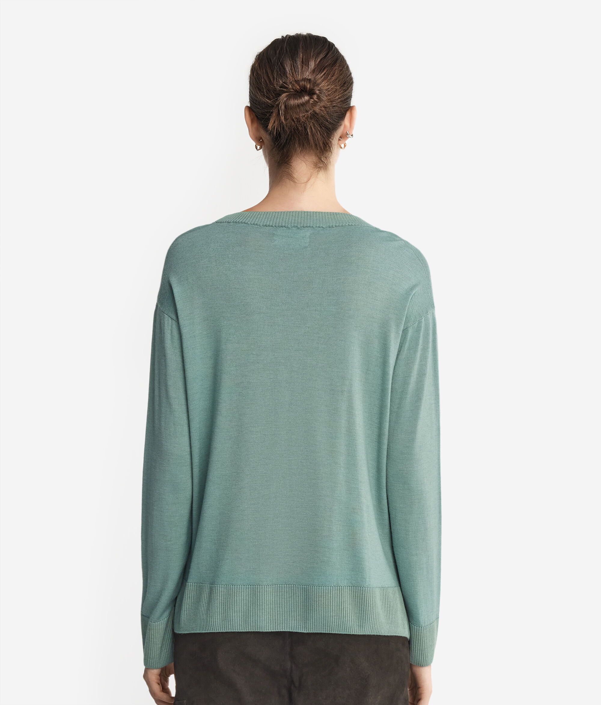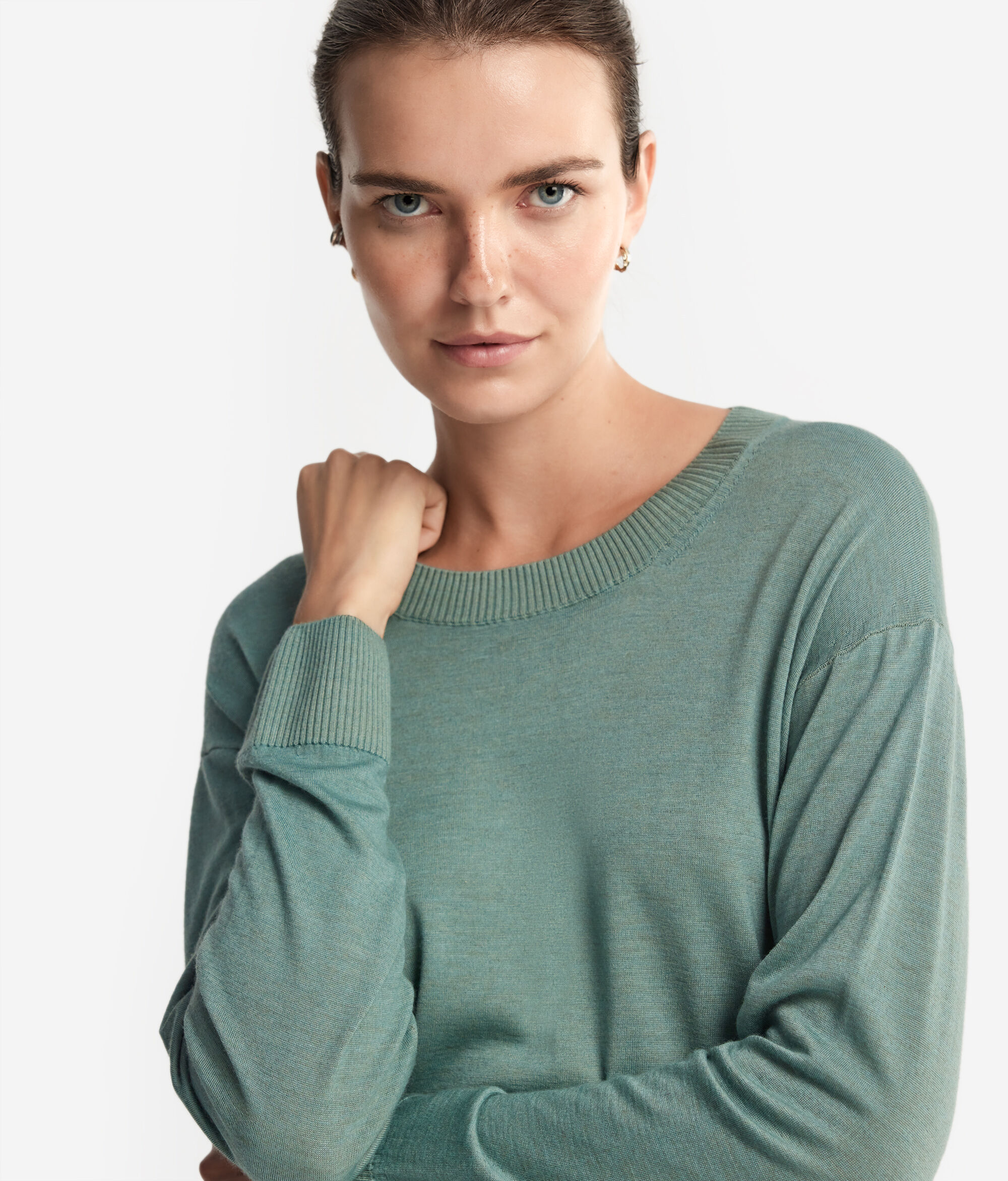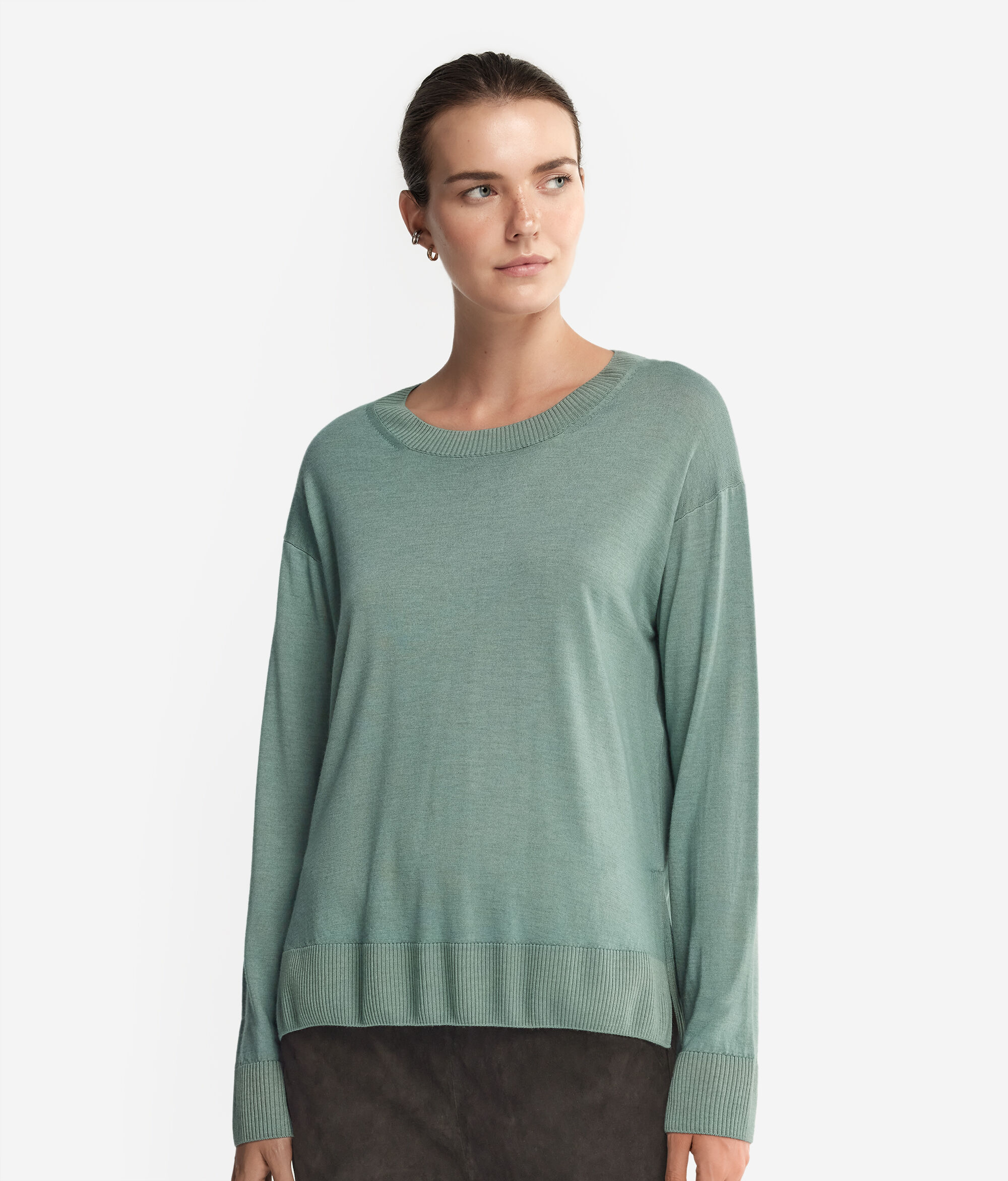 Round-neck jumper in Ultrafine Cashmere with long sleeves and ribbing on the neckline, cuffs and hem. This piece stands out for its side slits. The shoulders are slightly dropped, and it has a regular fit.