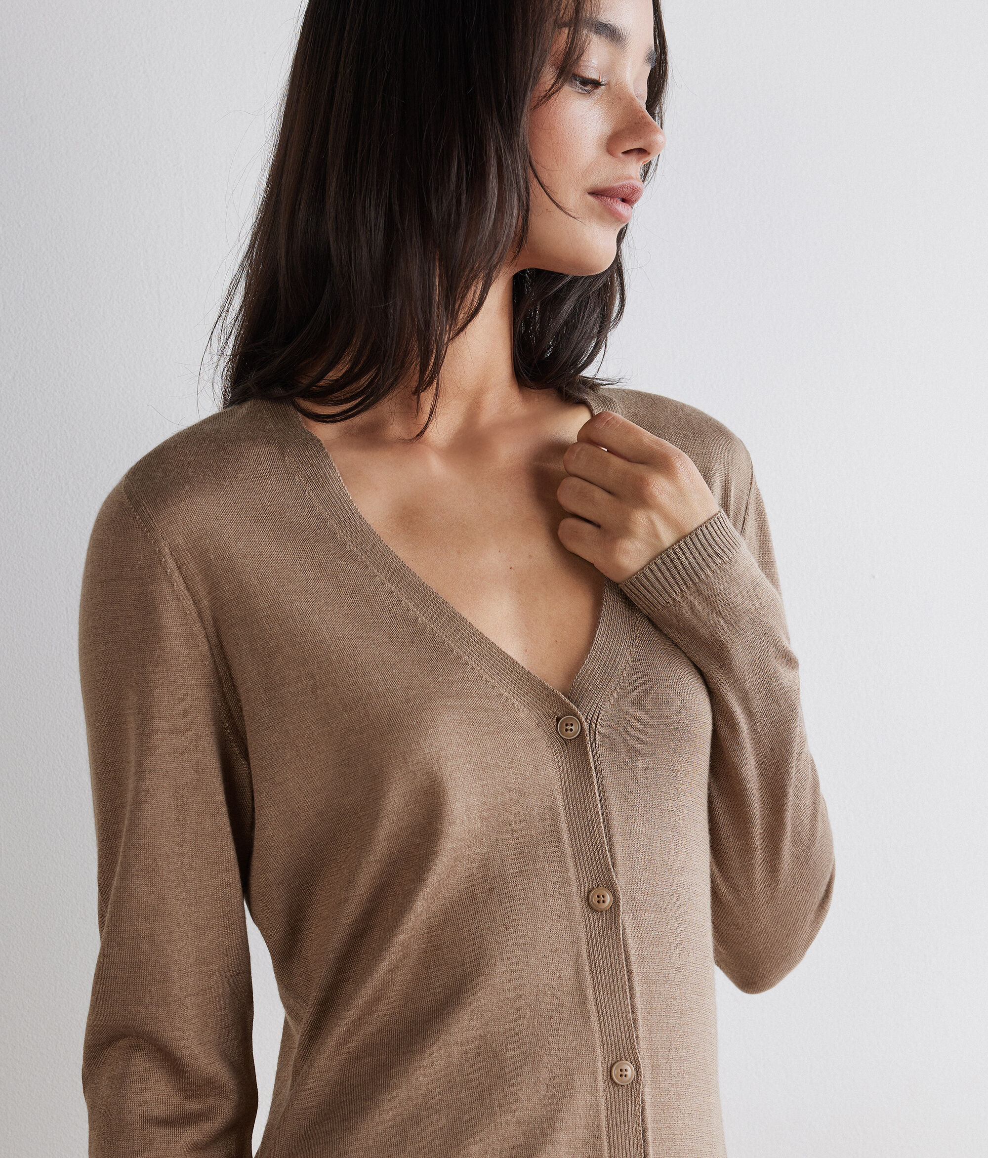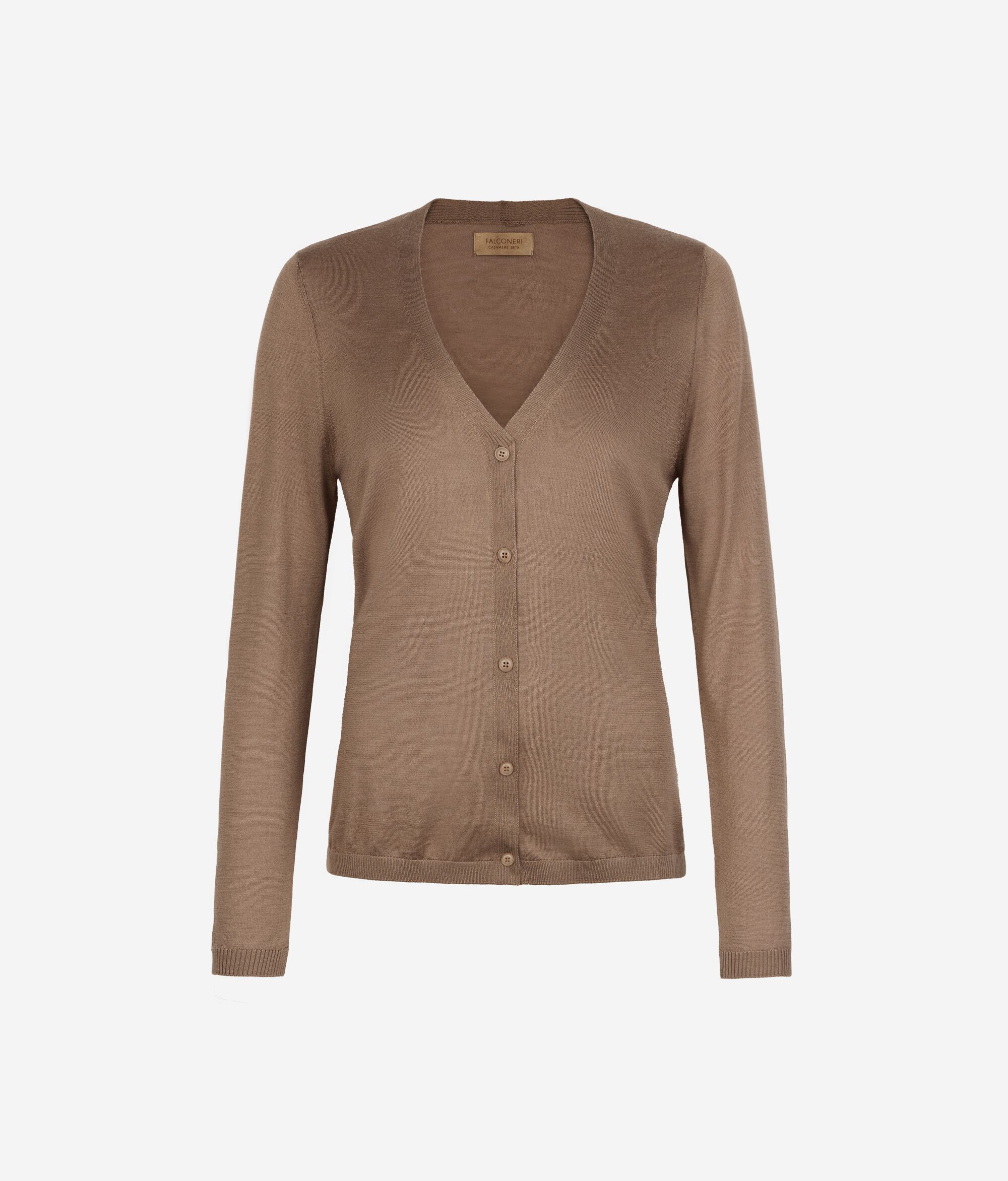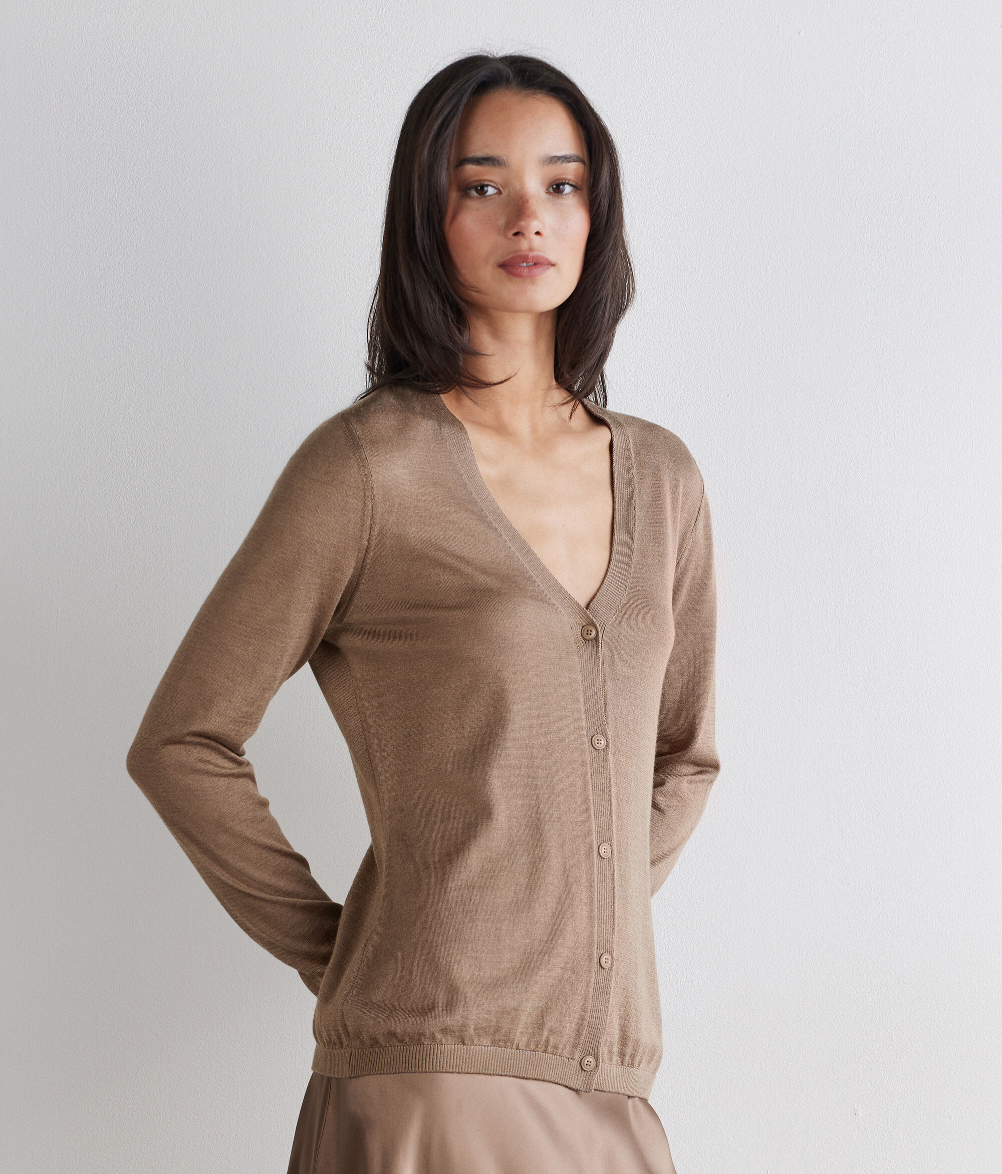 The softness of cashmere meets the sheen of silk in this timelessly charming sweater. Perfect for layering, it features a V-neck, front button fastening and ribbed trim, while the regular fit ensures comfort and a balanced silhouette.