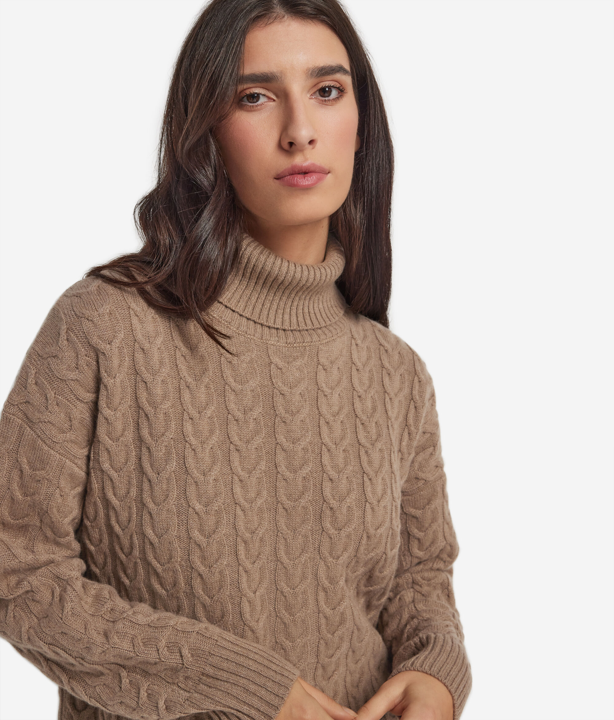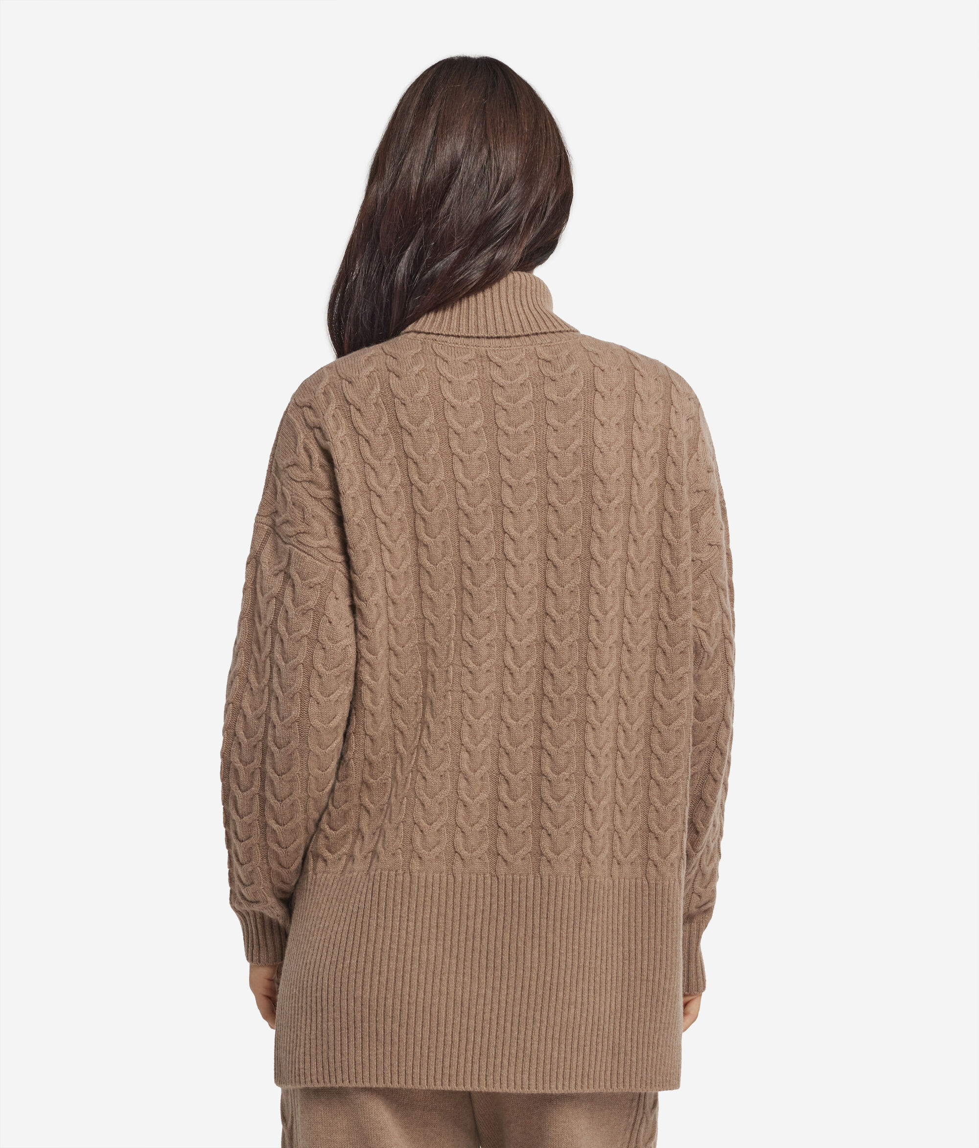 Soft and enveloping, this ultrasoft cashmere turtleneck blends comfort and elegance. The high collar and gently dropped shoulder create a refined allure, while the vertical cable stitch weave shapes the line. Ribbed details enhance the design with texture, while delicate slits at the hem add a touch of movement. The below-the-waist length and relaxed fit make it an essential companion on cooler days.