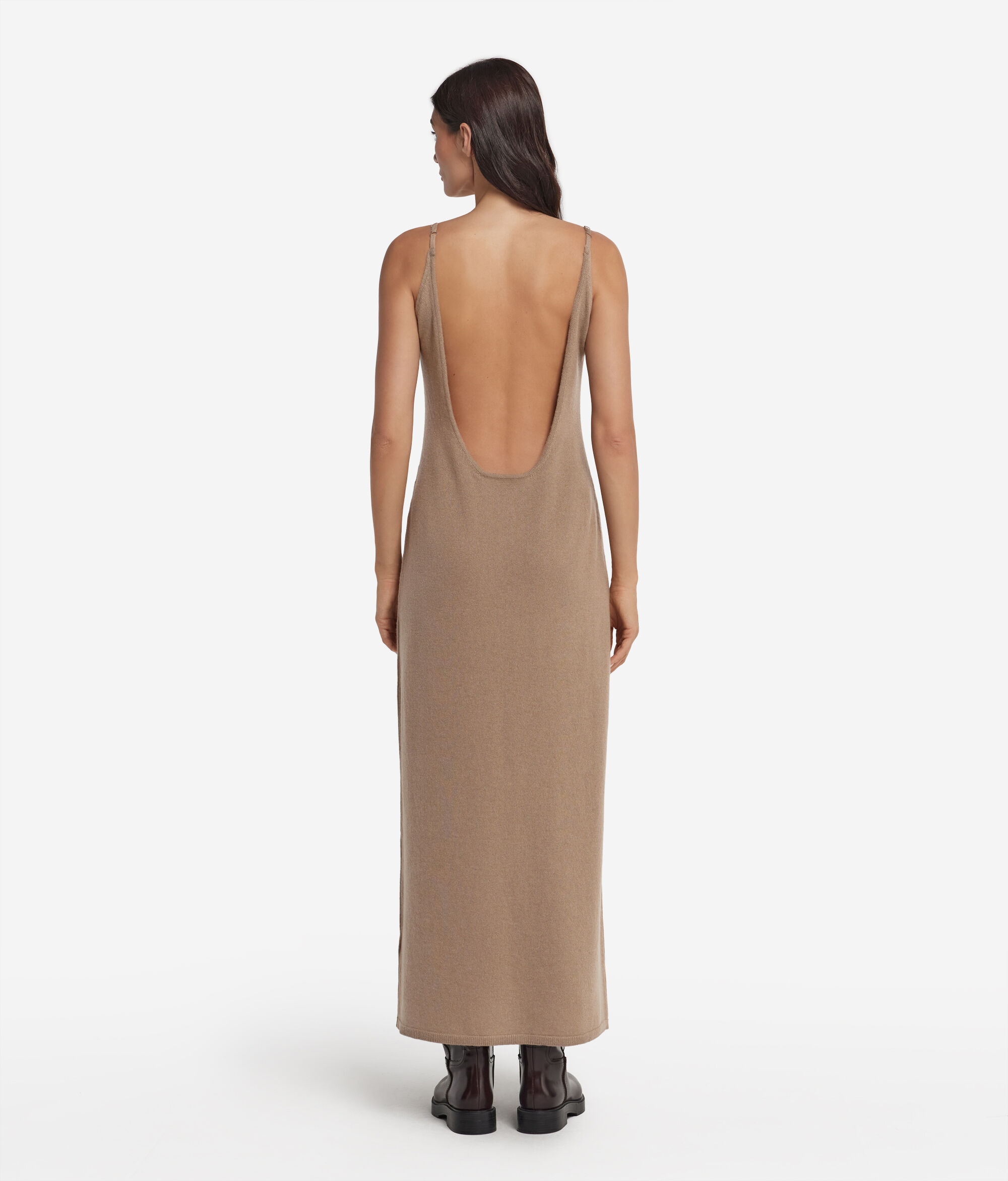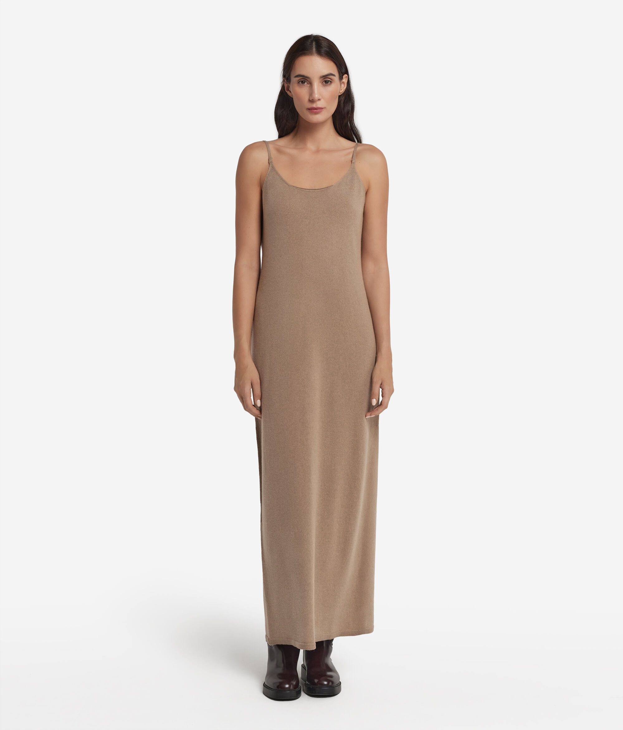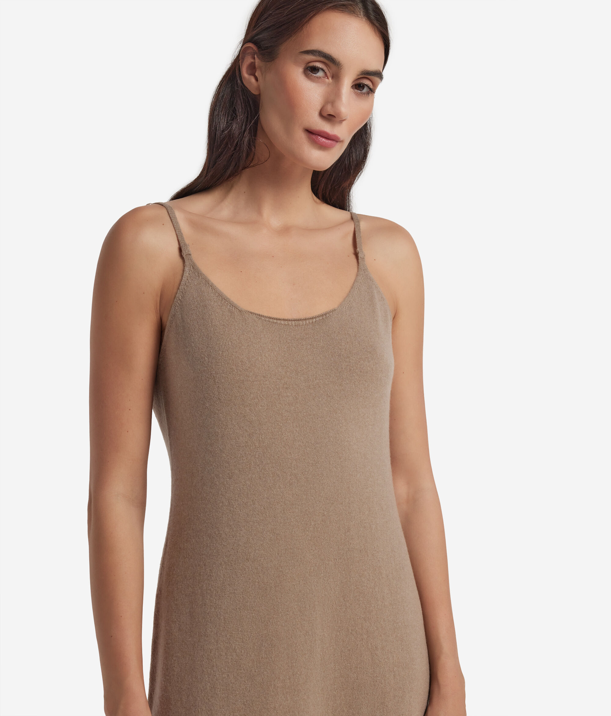 Essential and sophisticated, this slip dress in Ultrasoft Cashmere combines softness and lightness in a minimal silhouette. The round neckline at the front meets a deep opening at the back, while the thin adjustable shoulder straps allow you to delicately adapt the fit. The ribbed hem adds a refined touch while the calf length completes a design designed to elegantly accompany both everyday moments and special occasions.