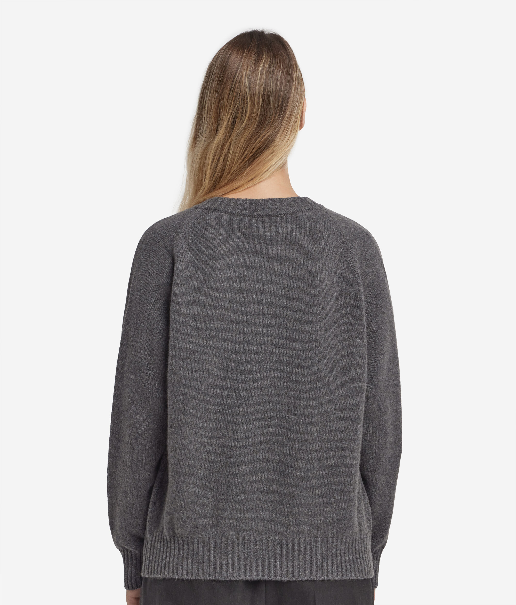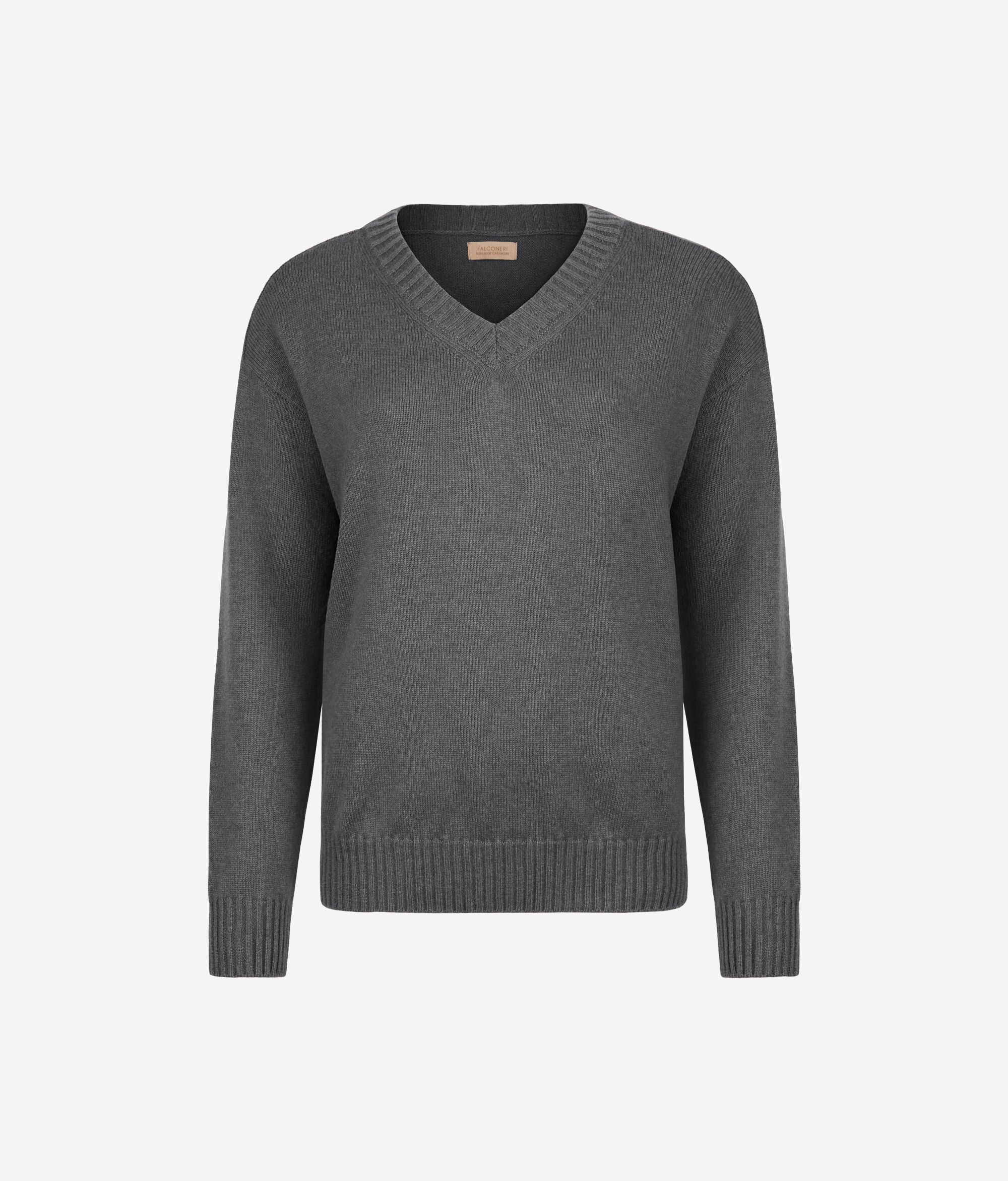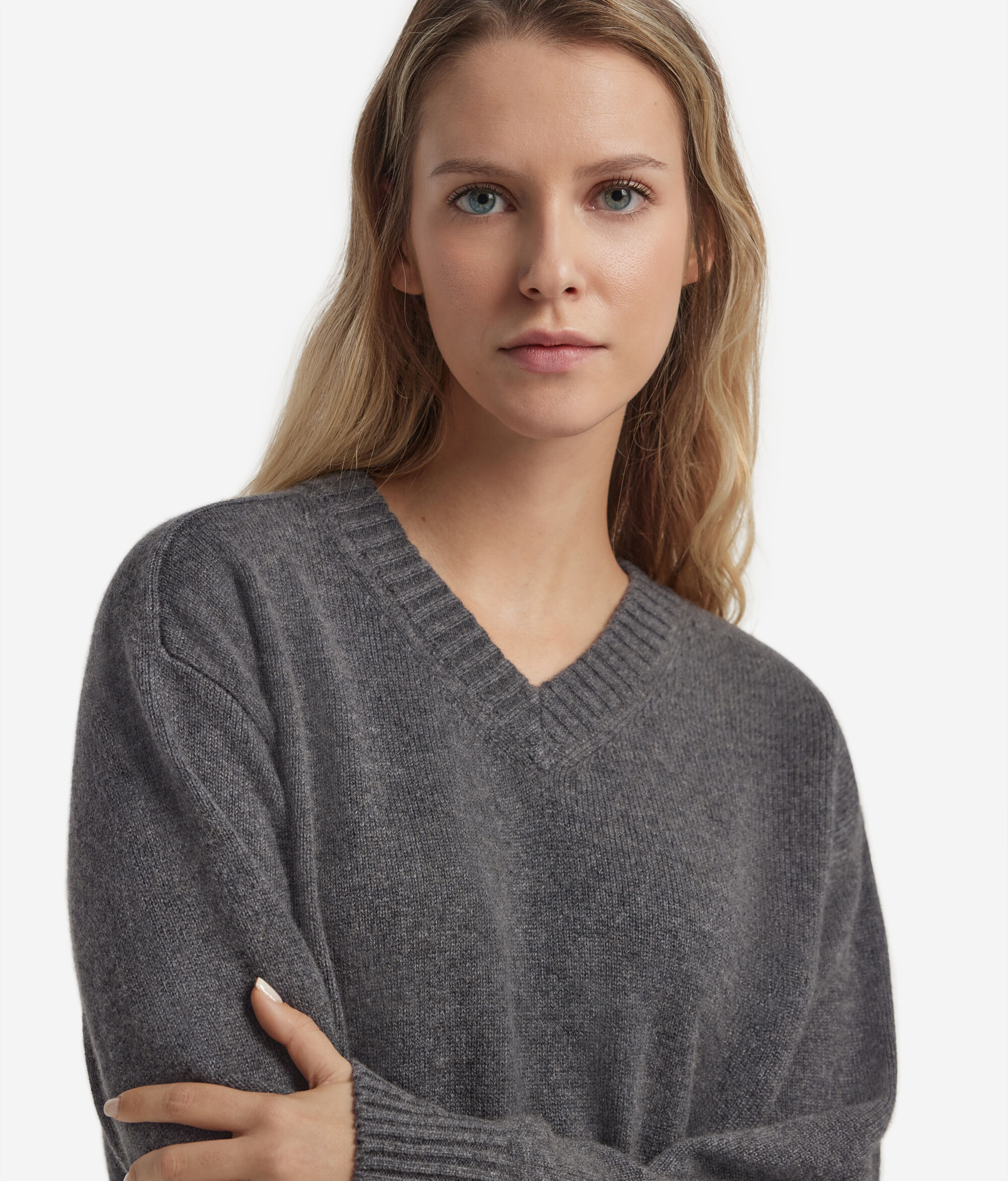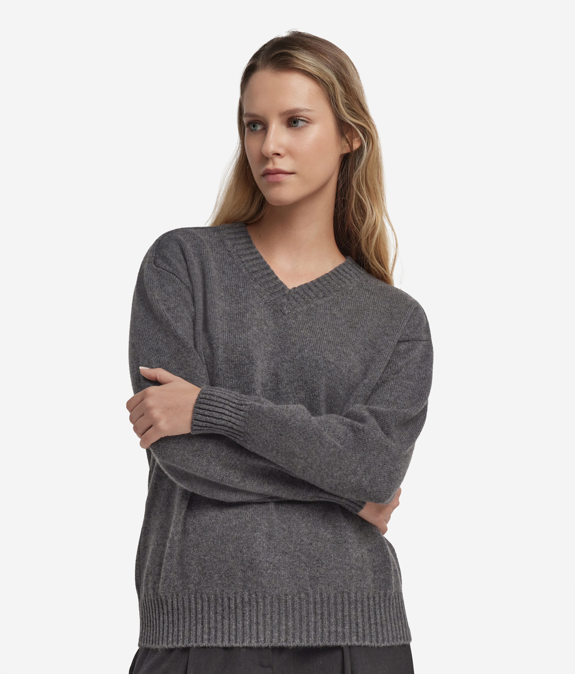 The natural fibres of Ultrasoft Cashmere create an exquisite, enveloping texture for this elegant V-neck jumper. The ribbing on neckline, cuffs and edge enhances its essential design, while the softness of the yarn exalts its relaxed volumes. The dropped set-in sleeves give the garment a touch of informal elegance.