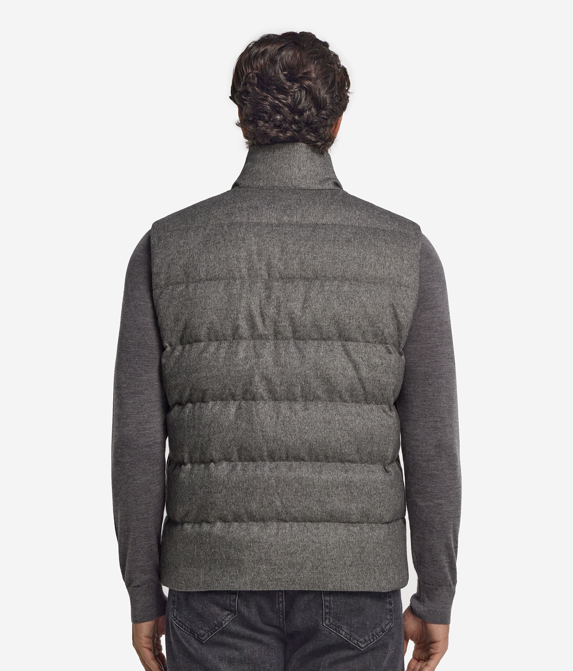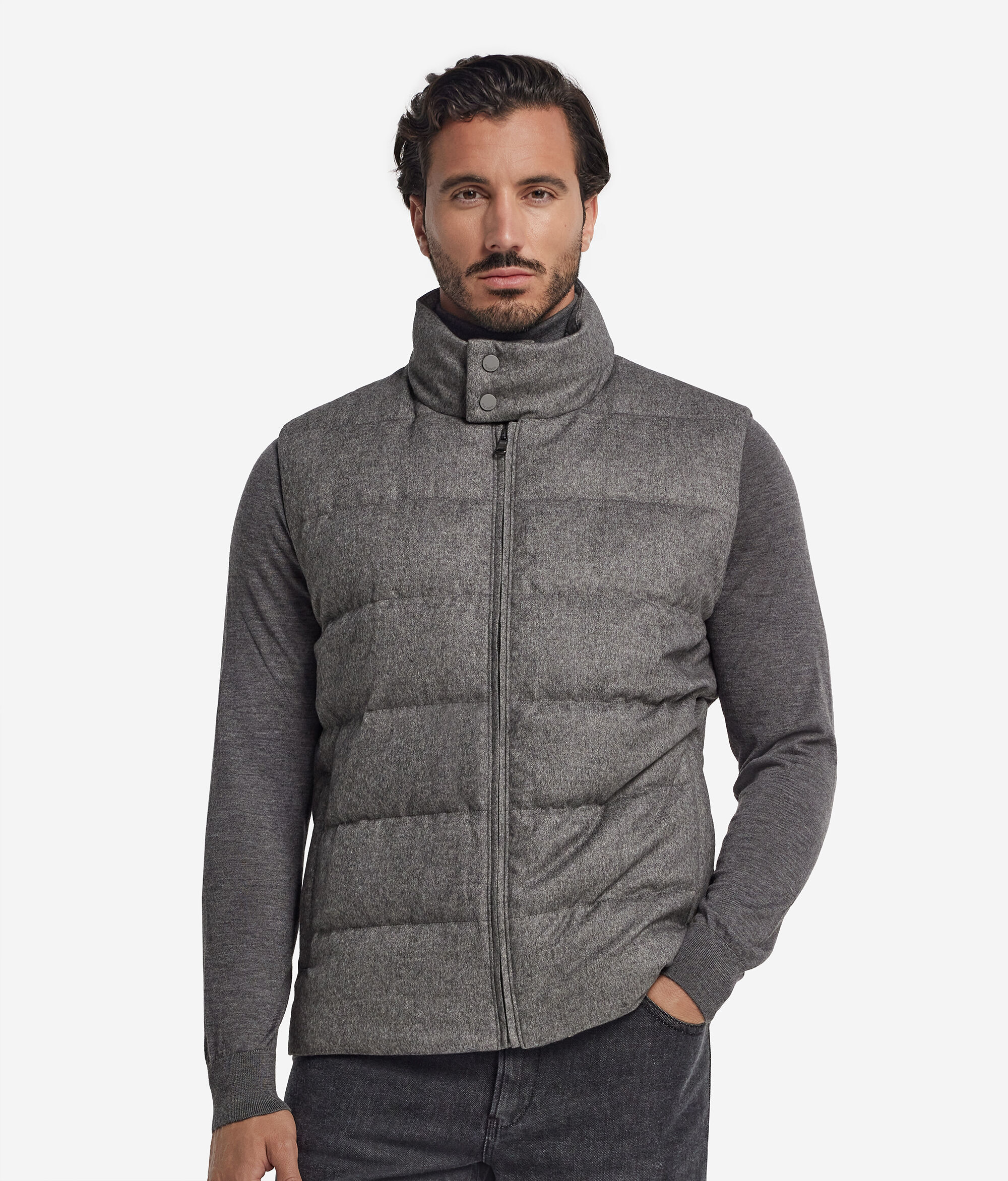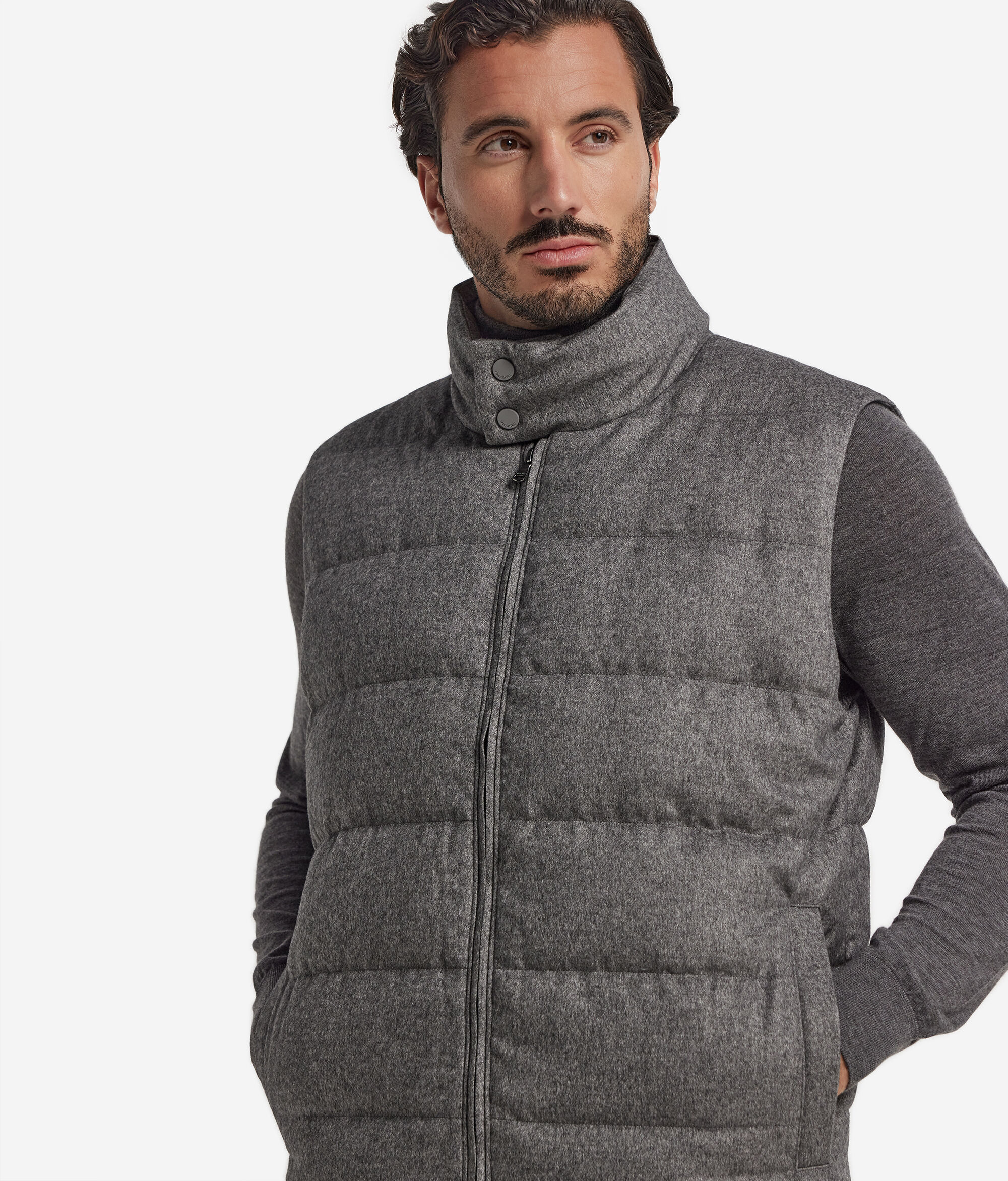 Refinement and functionality meet in this sleeveless short quilted jacket made from a fine mix of silk and cashmere. The turtleneck collar is embellished with a button fastening and a ribbed Ultrasoft Cashmere knit interior. Featuring a front zipper fastener, welt pockets and a Regular Fit. We recommend sizing up one to two sizes for the best fit, it is an ideal piece for the in-between seasons.