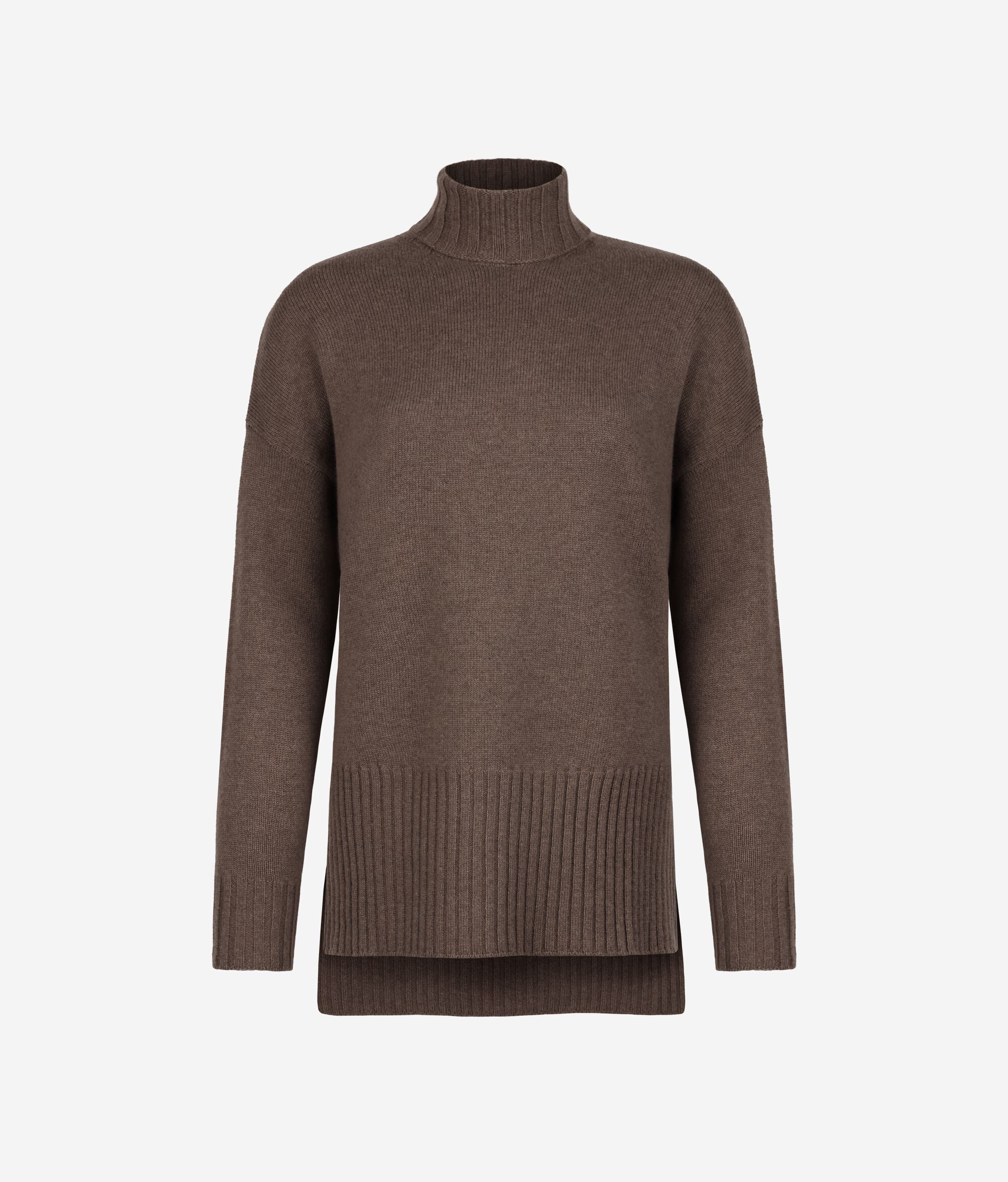 Wrap yourself in unparalleled luxury with Falconeri's cashmere oversized turtleneck sweater. Made from ultrasoft cashmere, it offers an incredibly smooth and luxurious feel against the skin. The high turtleneck adds a bold, cozy statement, while its loose fit drapes perfectly for an effortlessly relaxed look. The turtleneck sweater’s slightly dropped shoulders enhance its laid-back yet refined silhouette, making it a versatile piece for layering or wearing solo. Ribbed details at the collar, cuffs, and hem provide subtle texture and structure, ensuring the cashmere sweater holds its shape while remaining soft and comfortable. The asymmetrical, oversized length offers a modern, flowing fit, creating an elevated silhouette that works beautifully tucked into trousers or left loose over leggings. Finished with side slits for added movement, this cashmere oversized turtleneck exudes both ease and sophistication. The artisanal garment-dyed colorways give each piece a unique depth, with slight variations in color that make your oversized high-neck sweater one of a kind.