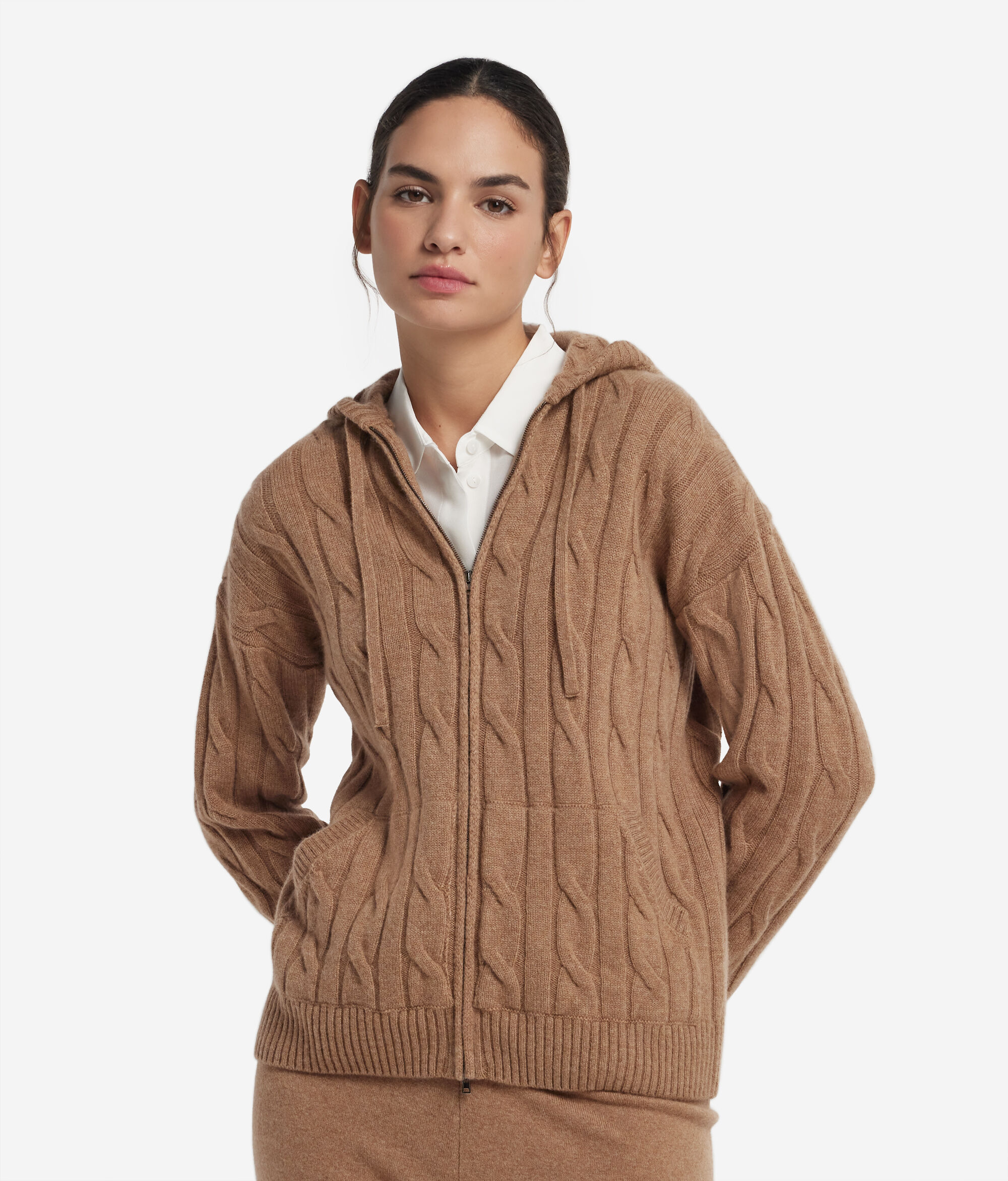 Relaxed lines and Scandinavian-inspired details meet in this sweatshirt made from fine Ultrasoft Cashmere. Traditional cable-knit workmanship provides the texture with a three-dimensional feel while emphasizing the fabric. Warm and soft, it is enhanced by a zipper closure and delicate ribbed trim on the hood and pockets. The dropped sleeves and relaxed fit ensure a relaxed and natural flow, ideal for tackling cooler days in style.