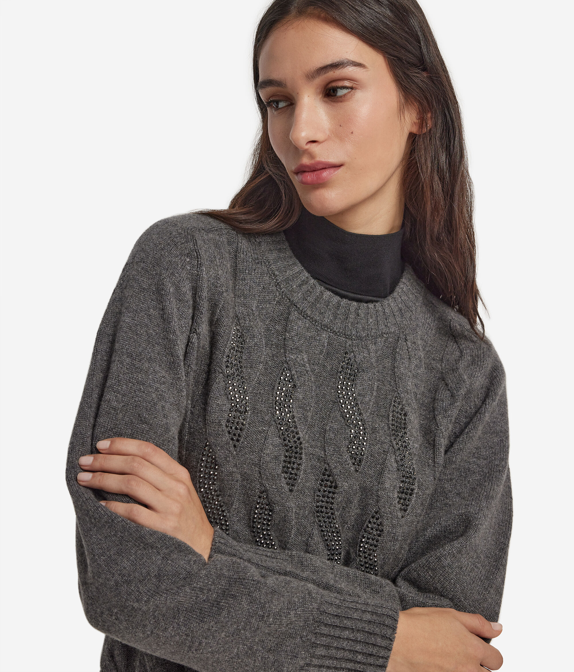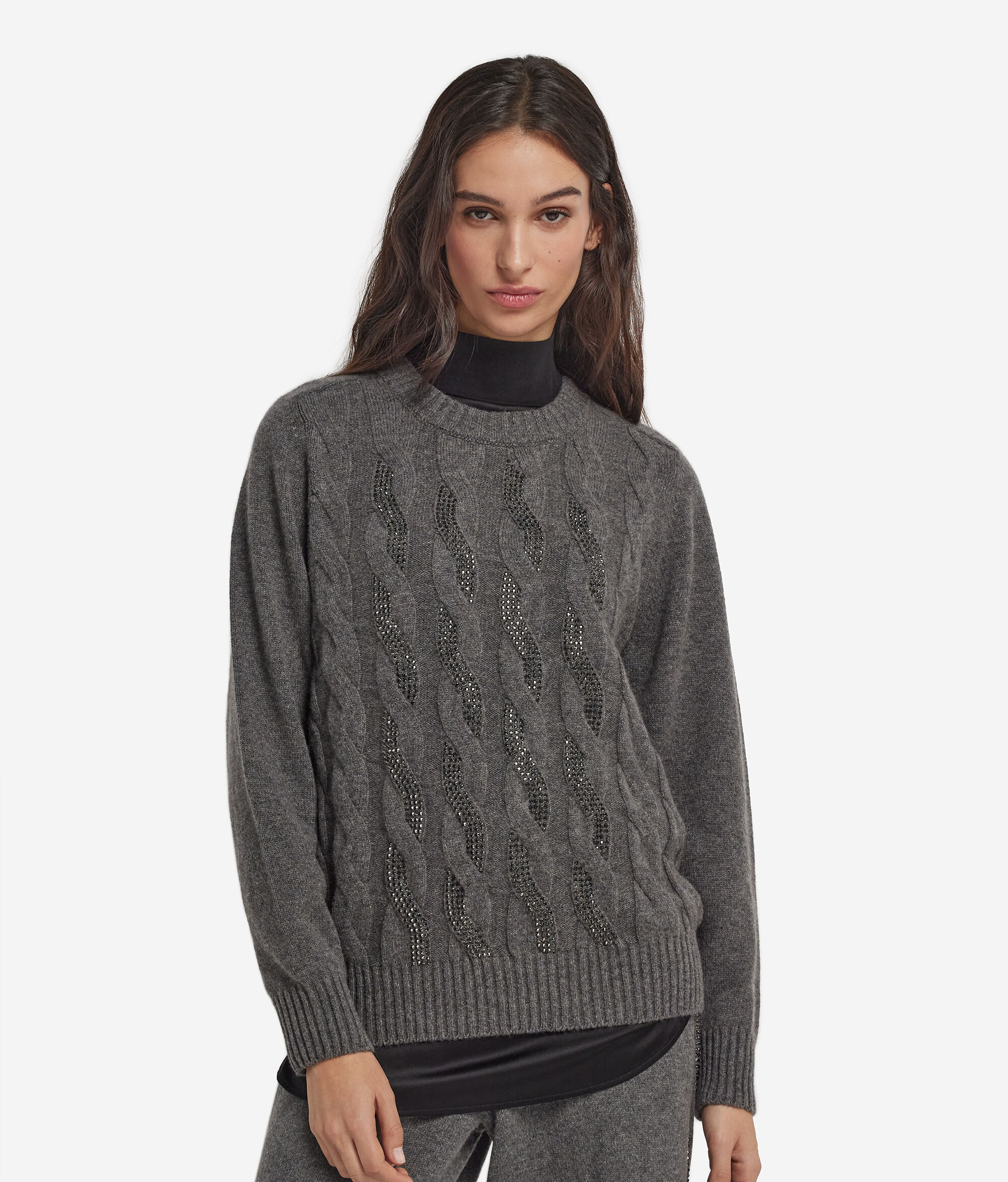 Made of Ultrasoft Cashmere, this crewneck combines comfort, style, and refined details. The cable knit on the front, embellished with delicate rhinestones, transforms this sweater into a truly precious item. The ribbed collar, armholes and hem naturally outline the silhouette, while the hip length makes it versatile, perfect to wear with jeans, tailored trousers or under a blazer.